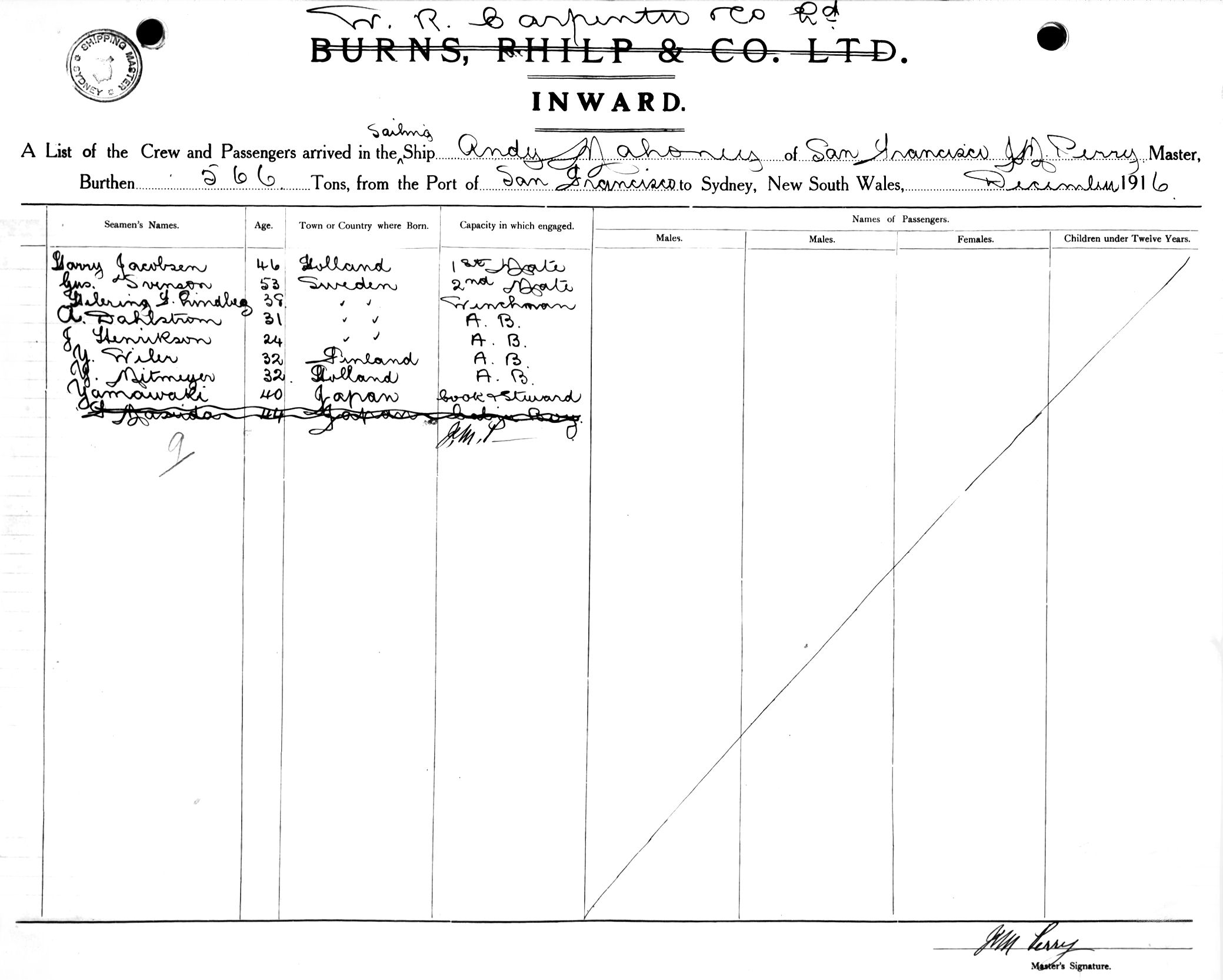 ANDY MAHONYOF SAN FRANCISCO, J. M. PERRY, MASTER, BURTHEN 566 TONS FROM THE PORT OF SAN FRANCISCO TO SYDNEY, NEW SOUTH WALES, (9TH) DECEMBER 1916 |