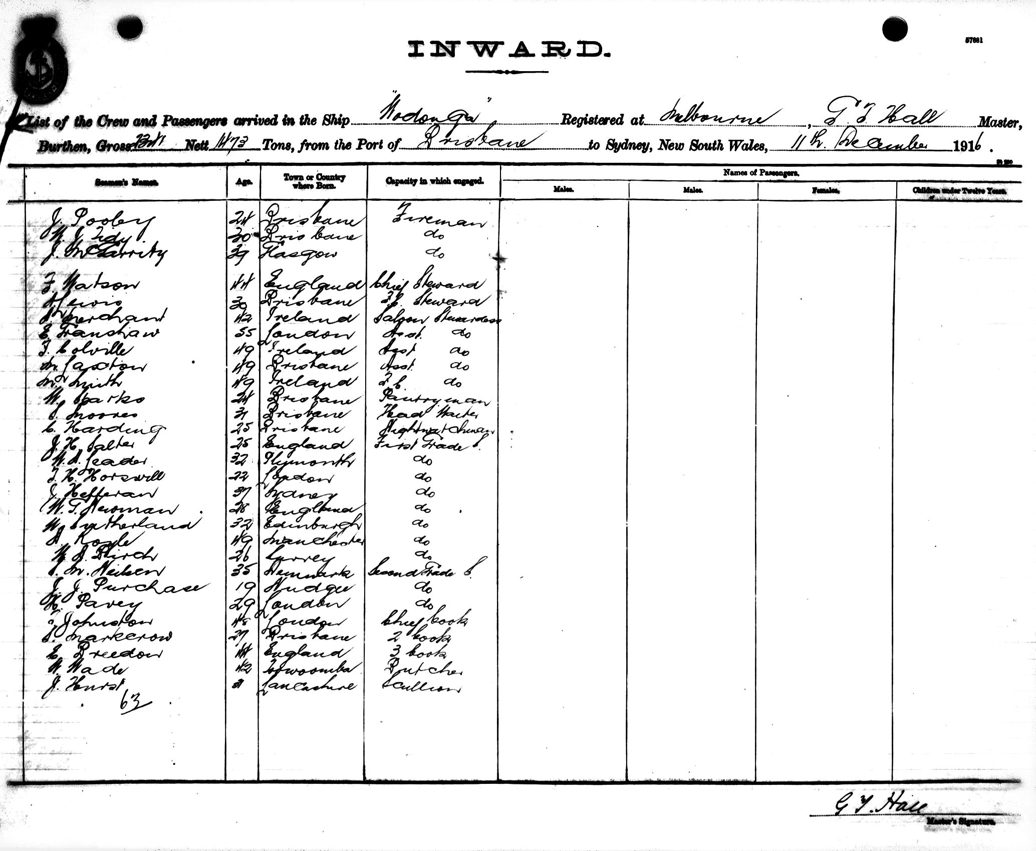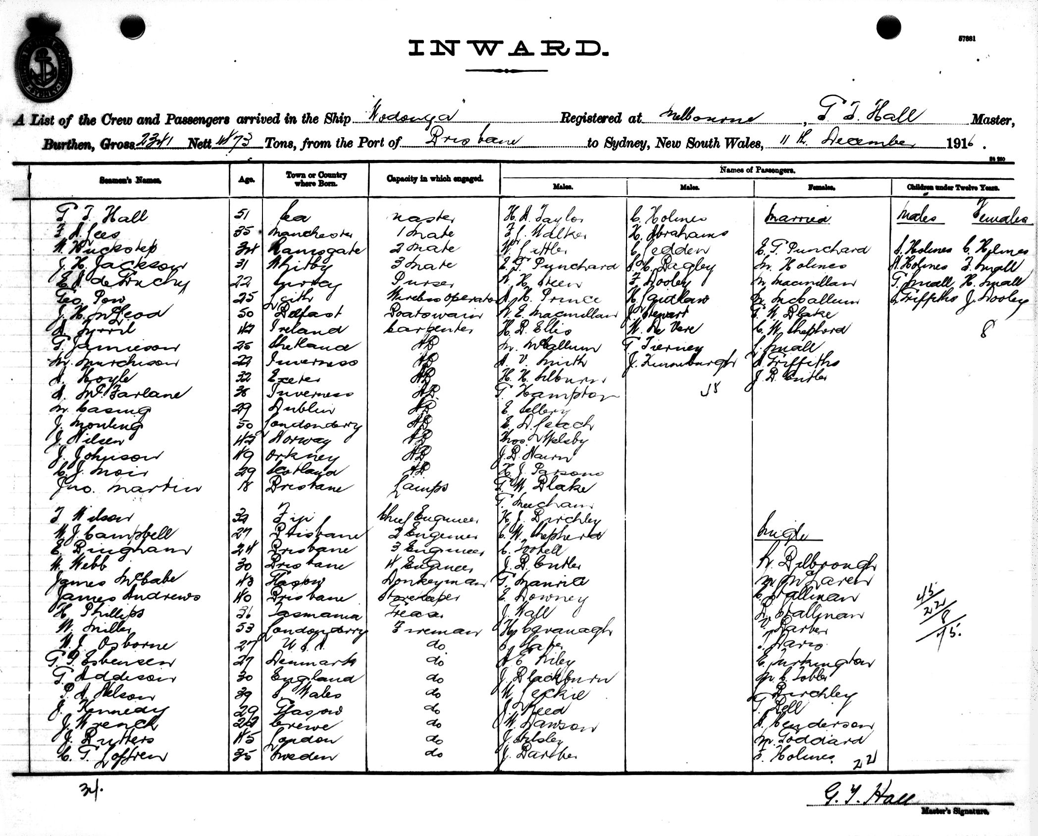 WODONGAOF MELBOURNE, G. T. HALL, MASTER, BURTHEN 2341/1473 TONS FROM THE PORT OF BRISBANE TO SYDNEY, NEW SOUTH WALES, 11TH DECEMBER 1916 |