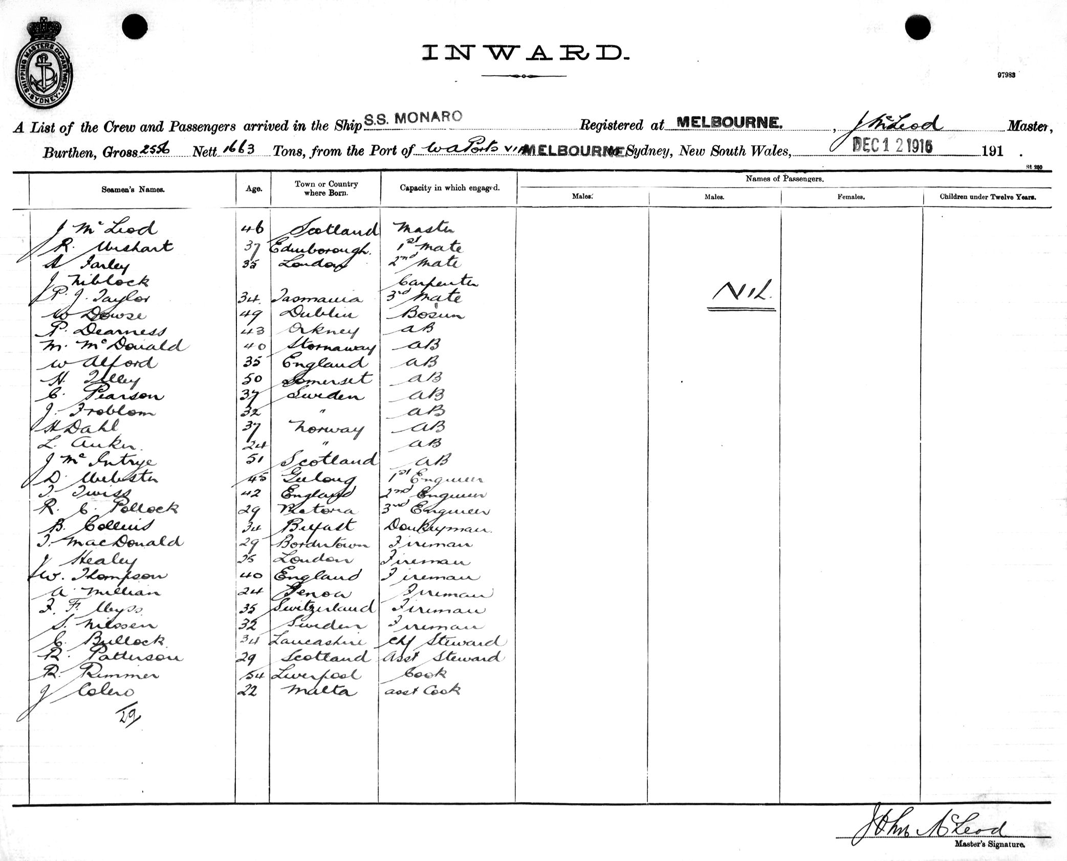 MONAROOF MELBOURNE, J. MCLEOD, MASTER, BURTHEN 2556/1663 TONS FROM THE PORT OF W.A. via PORTS & MELBOURNE TO SYDNEY, NEW SOUTH WALES, 12TH DECEMBER 1916 |