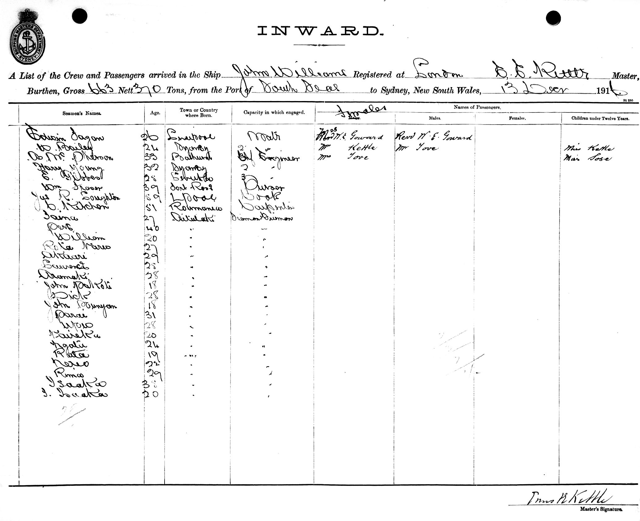 JOHN WILLIAMSOF LONDON, E. E. KETTLE, MASTER, BURTHEN 663/370 TONS FROM THE PORT OF SOUTH SEAS TO SYDNEY, NEW SOUTH WALES, 13TH DECEMBER 1916 |