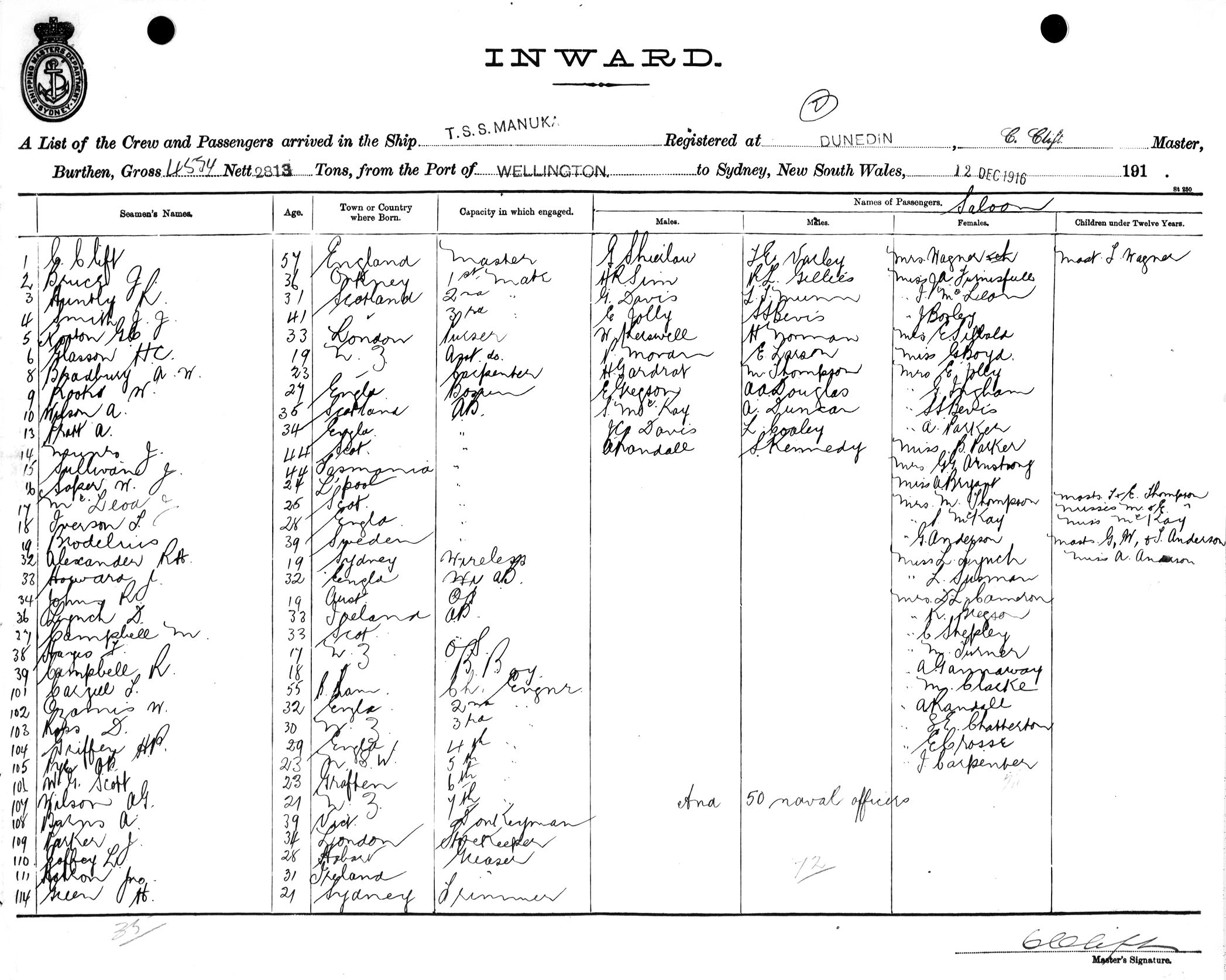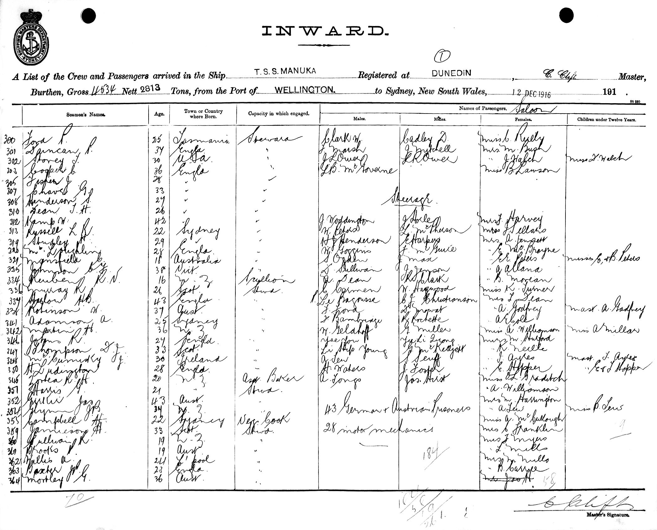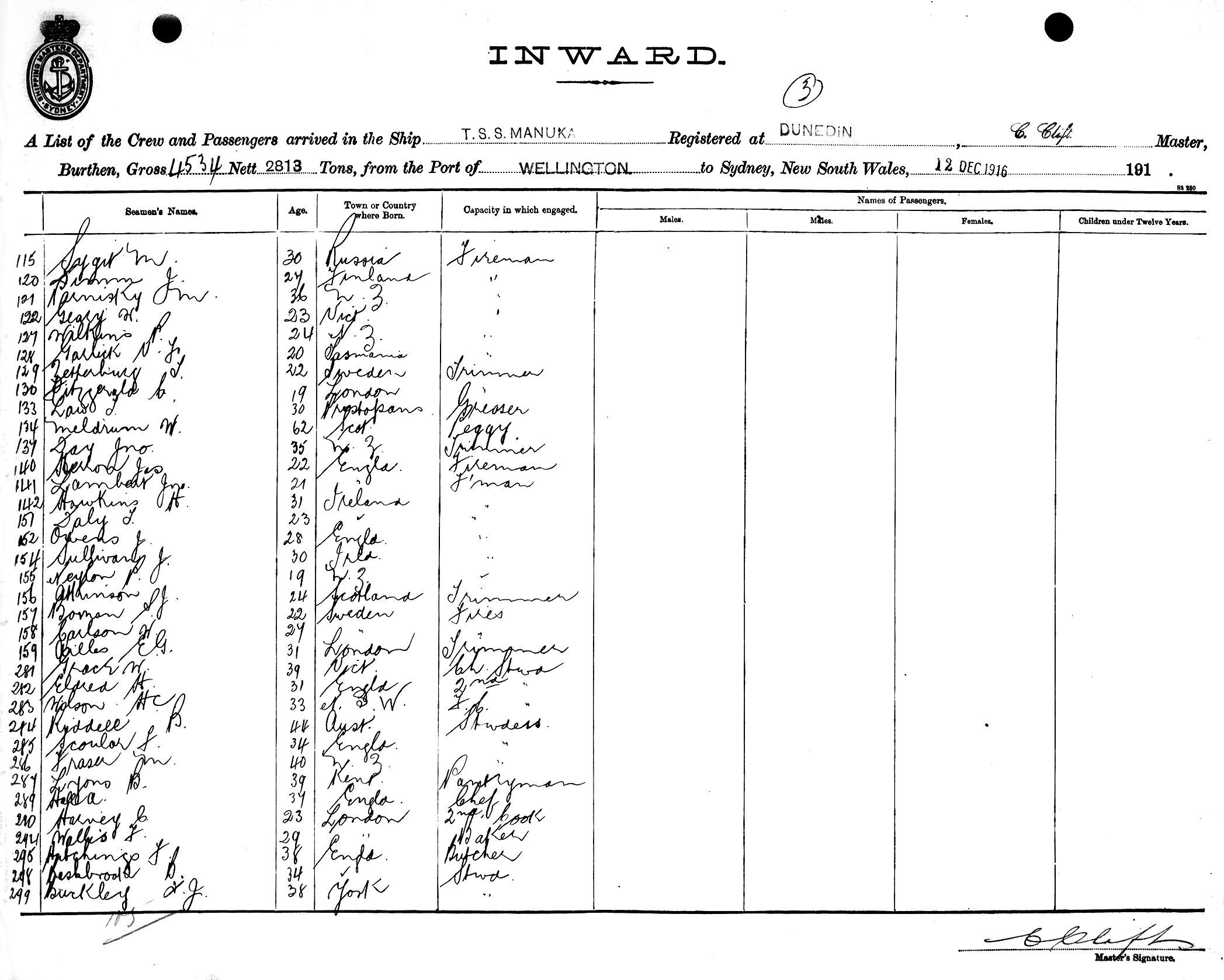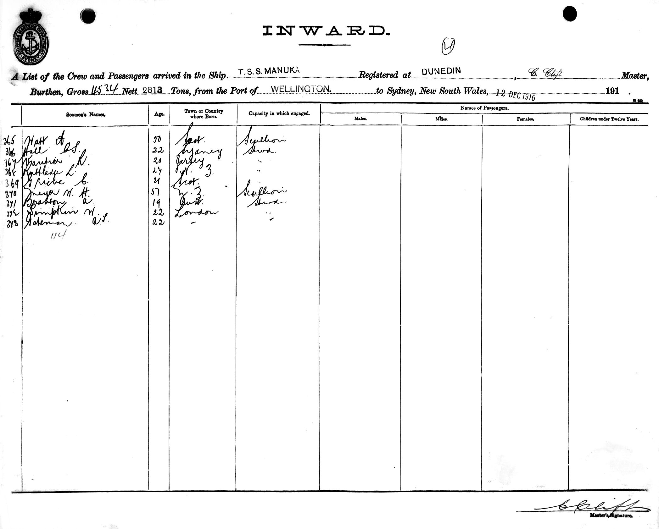 MANUKAOF DUNEDIN, C. CLIFT, MASTER, BURTHEN 4534/2813 TONS FROM THE PORT OF WELLINGTON TO SYDNEY, NEW SOUTH WALES, 12TH DECEMBER 1916 |