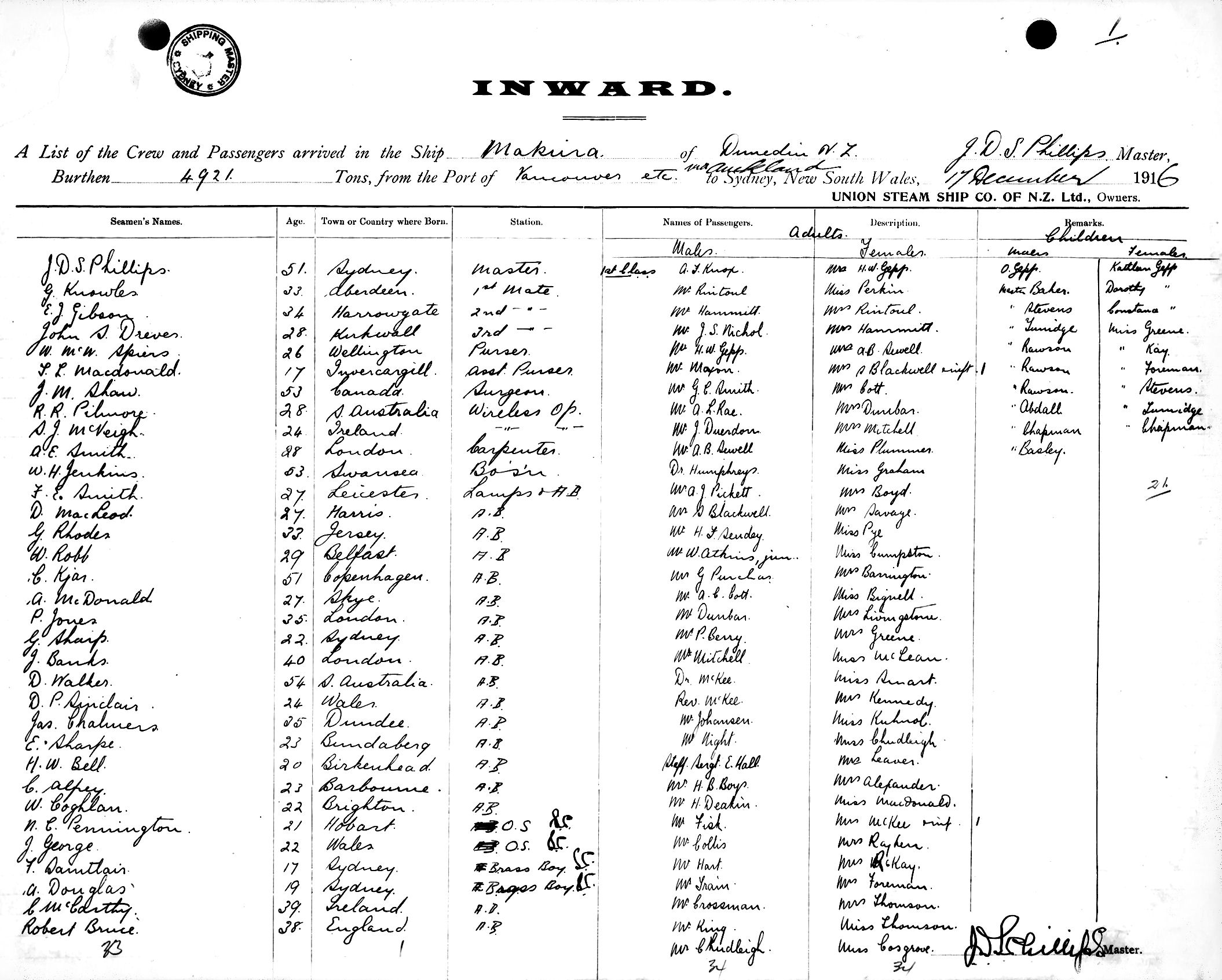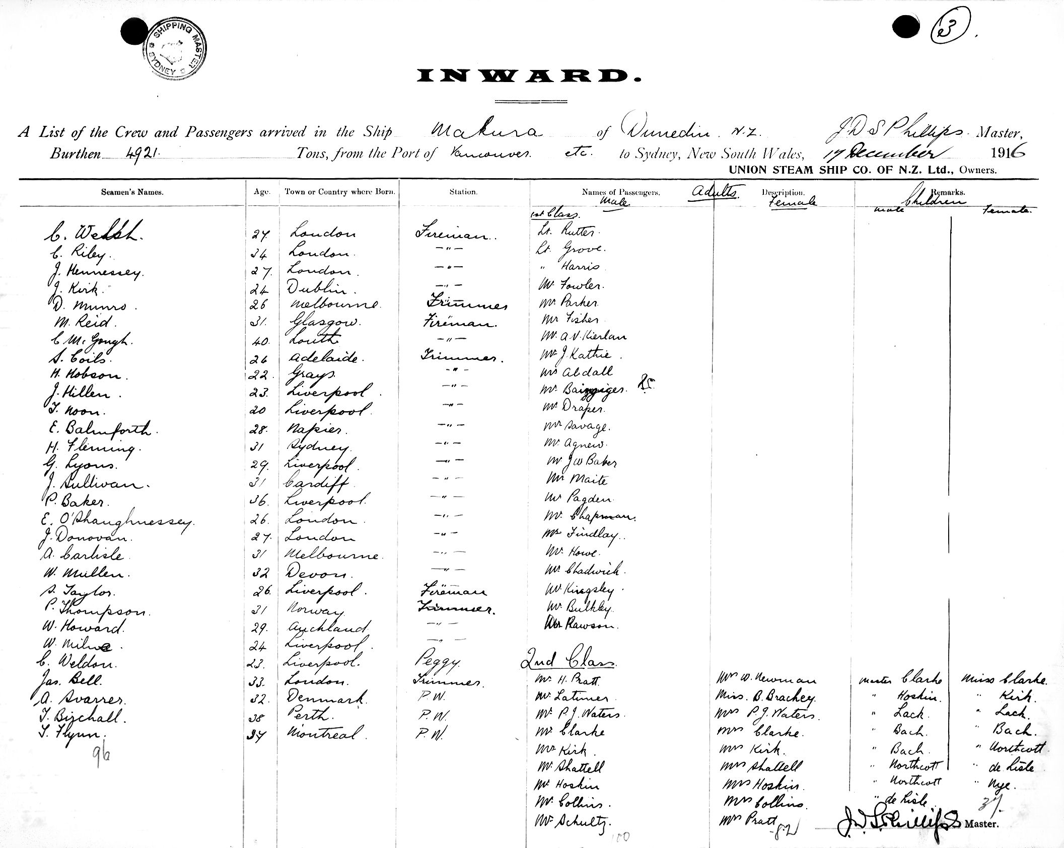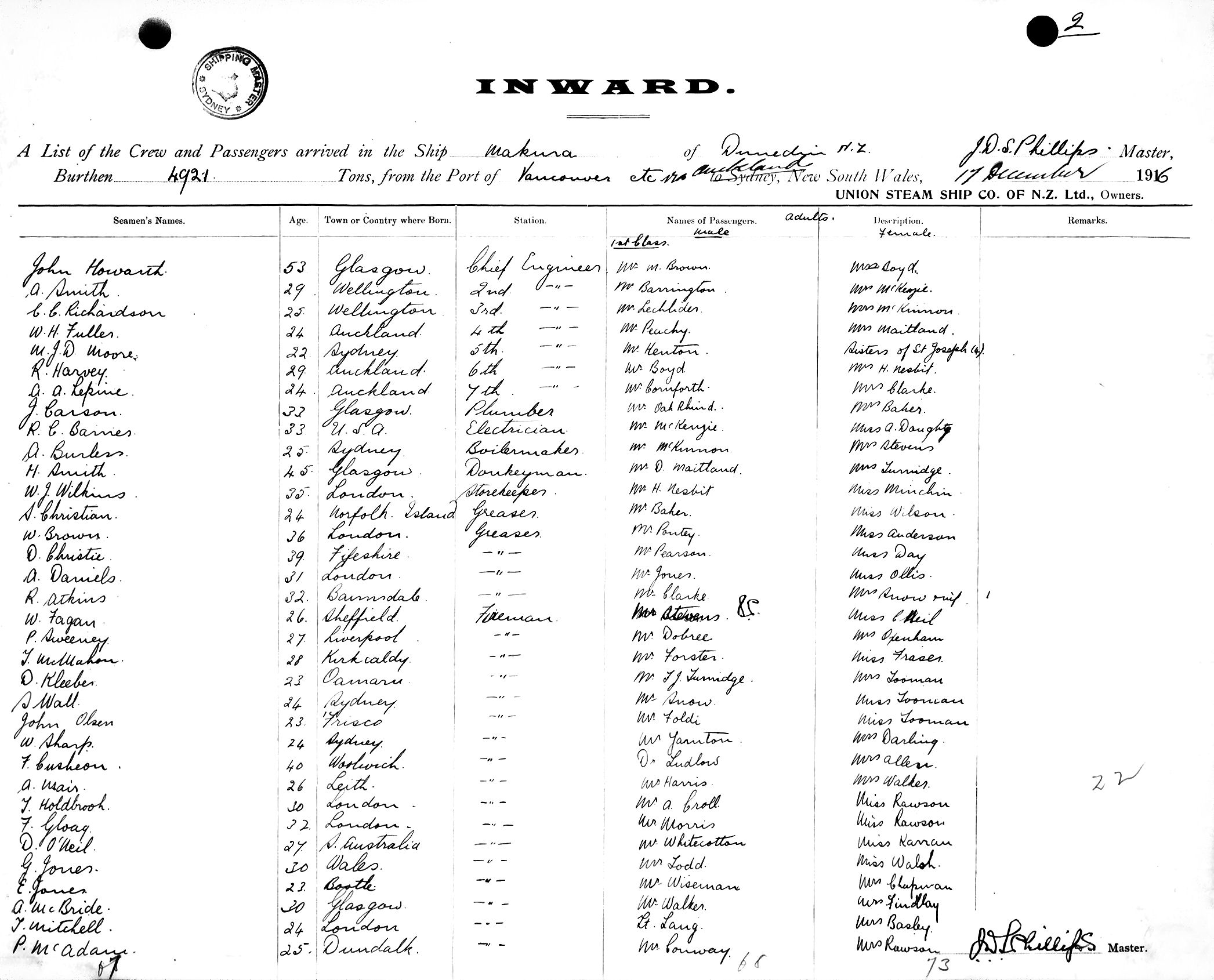 MAKURAOF DUNEDIN, J. D. S. PHILLIPS, MASTER, BURTHEN 4921 TONS FROM THE PORT OF VANCOUVER via AUCKLAND TO SYDNEY, NEW SOUTH WALES, 17TH DECEMBER 1916 |