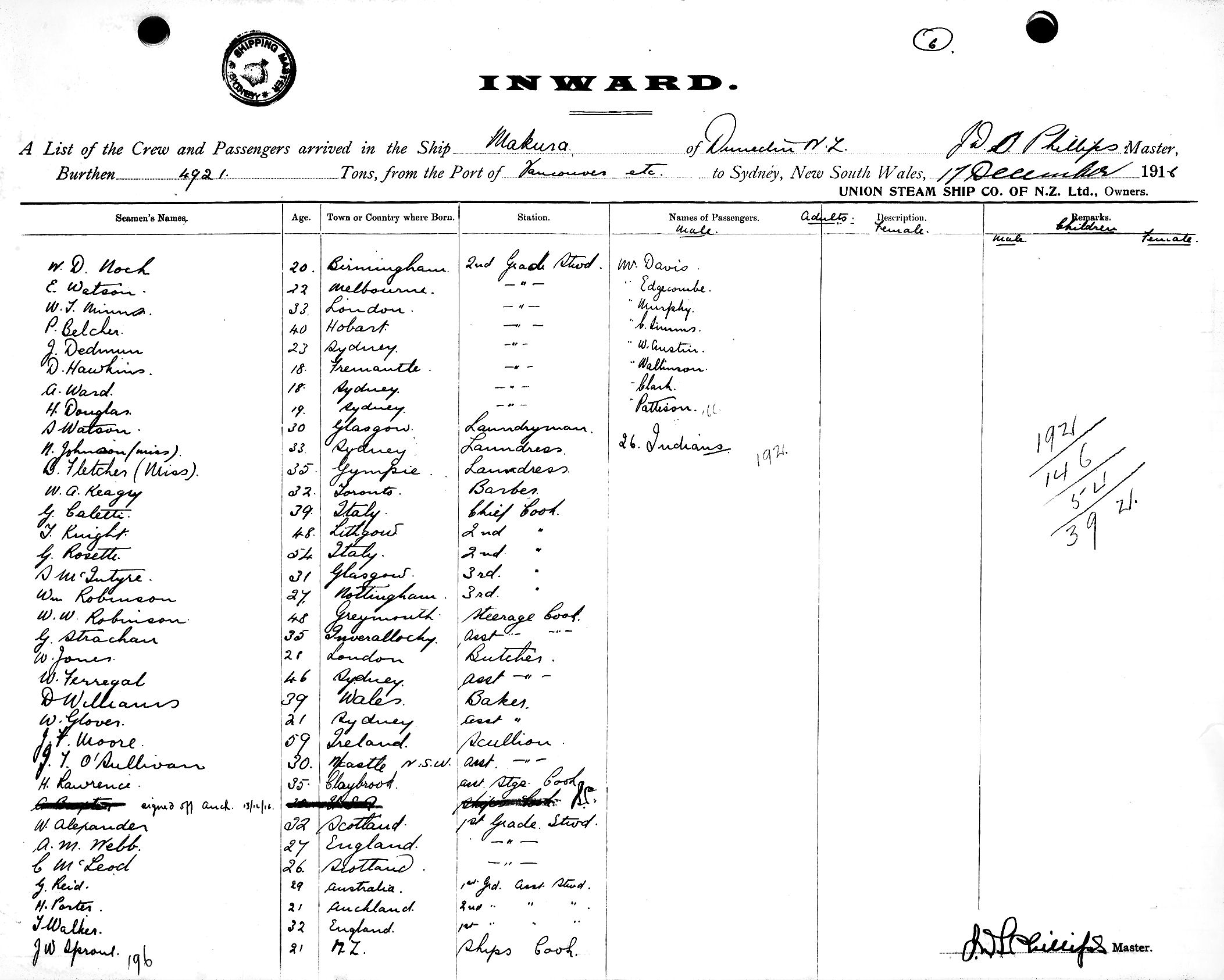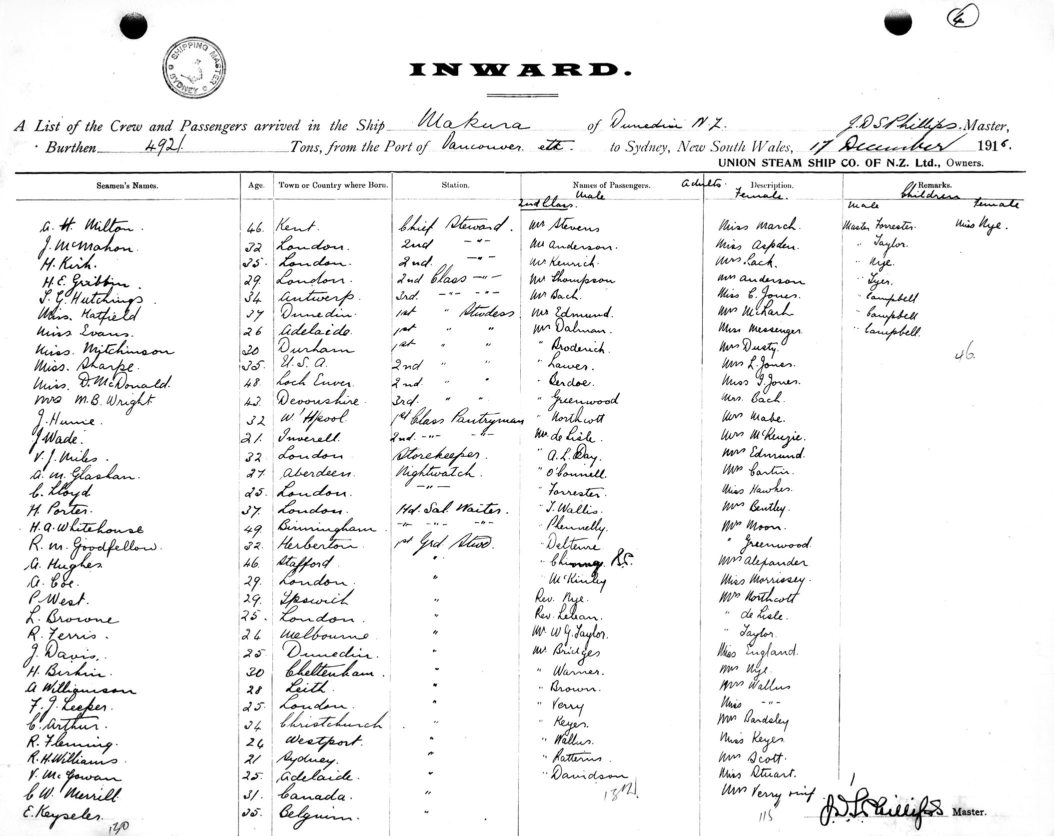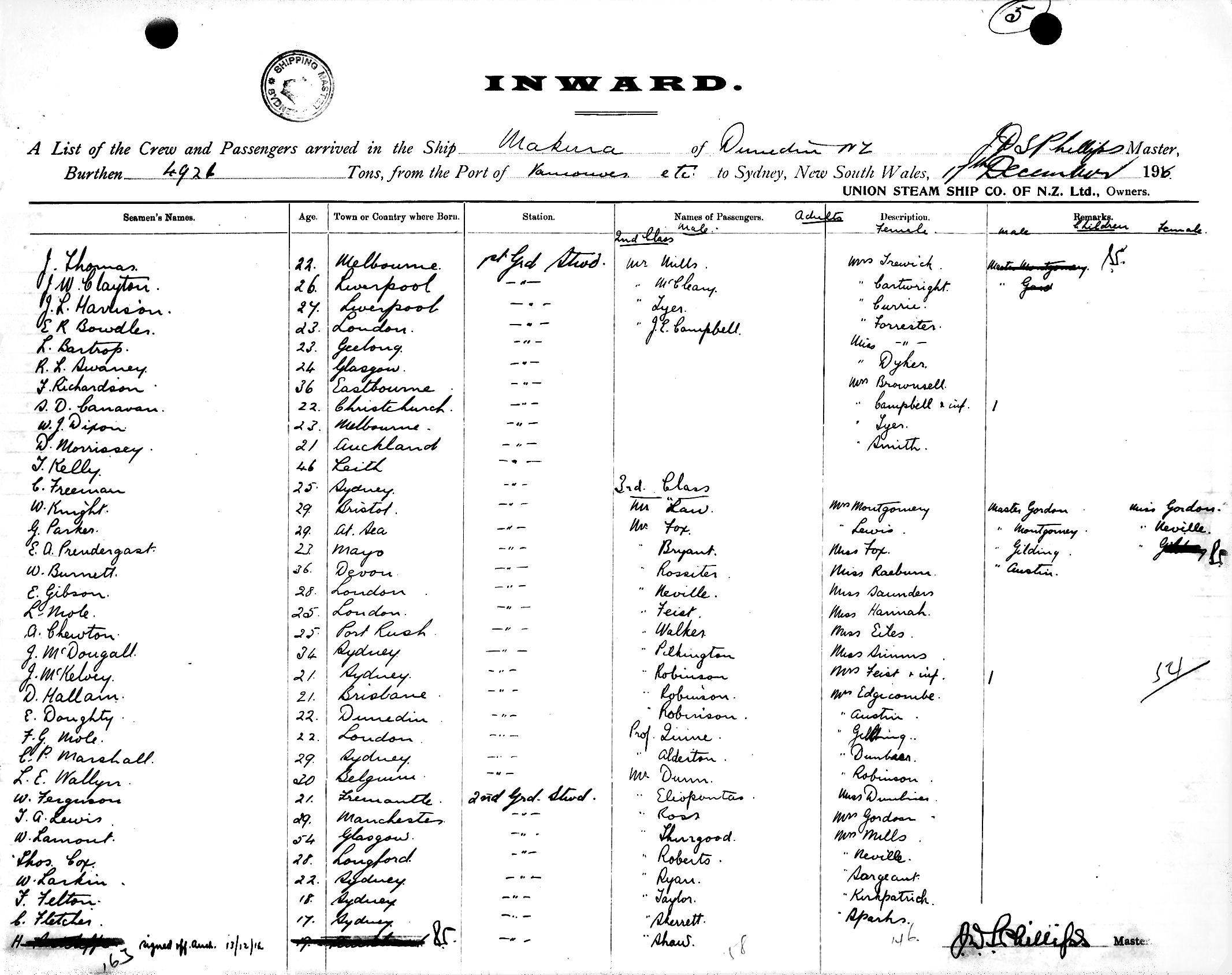 MAKURAOF DUNEDIN, J. D. S. PHILLIPS, MASTER, BURTHEN 4921 TONS FROM THE PORT OF VANCOUVER via AUCKLAND TO SYDNEY, NEW SOUTH WALES, 17TH DECEMBER 1916 |