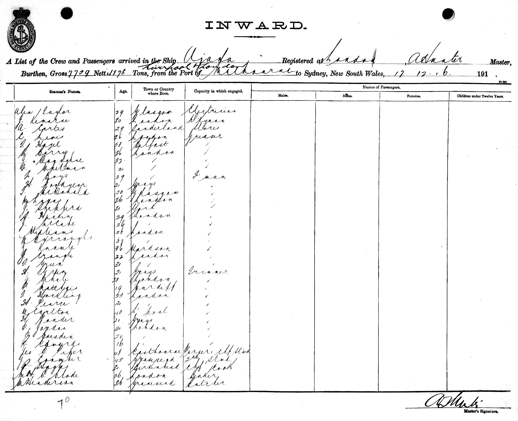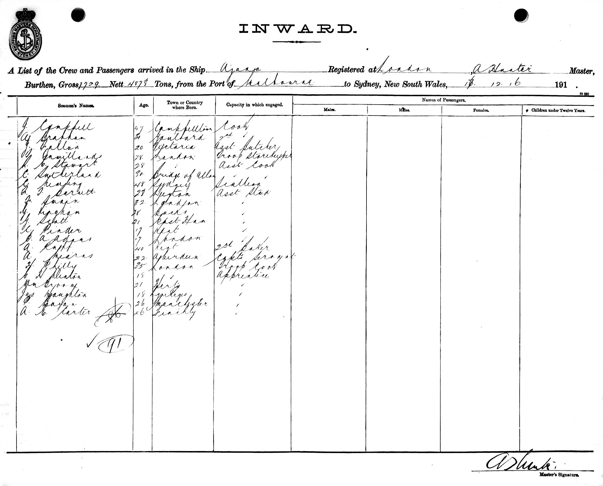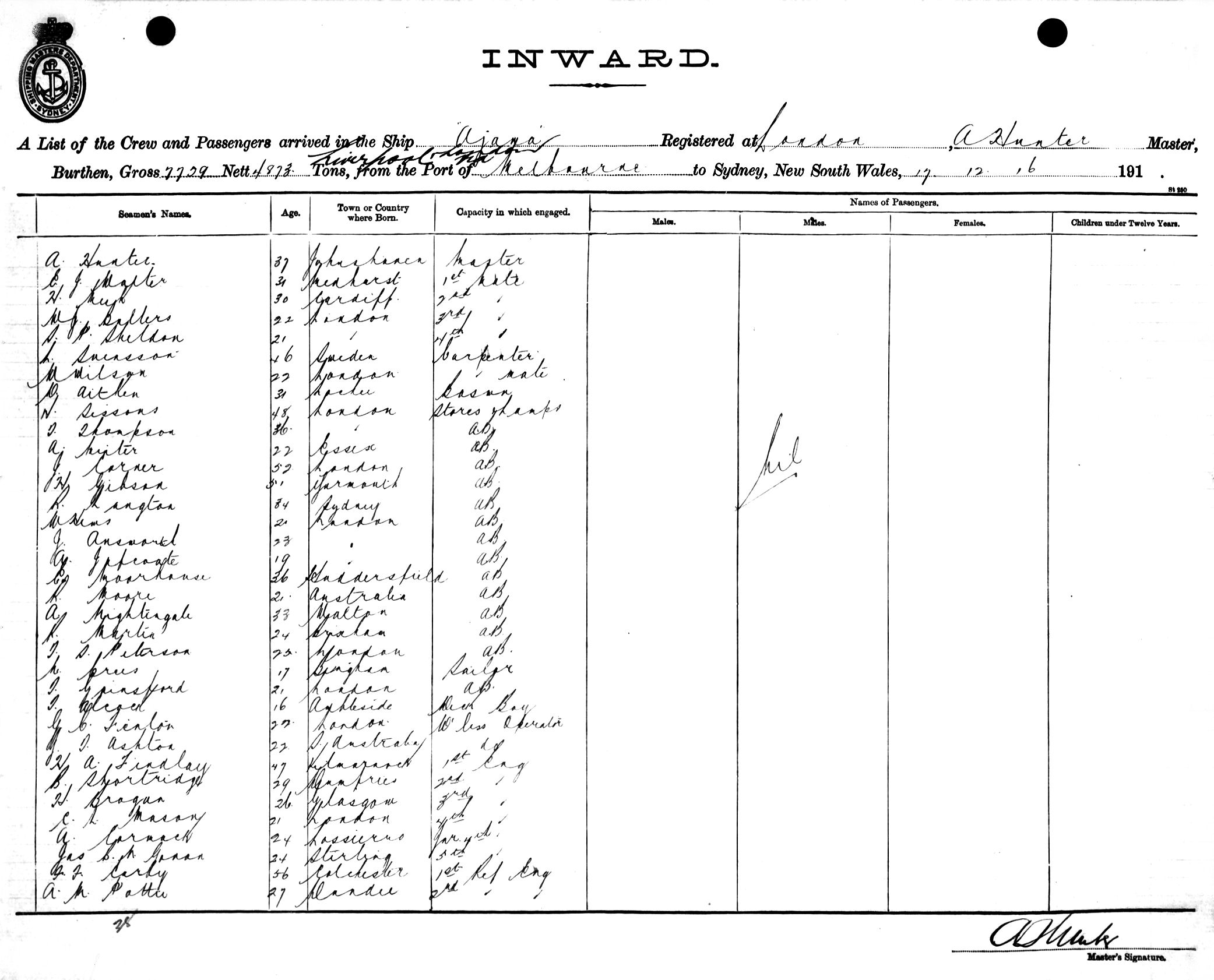 AJANAOF LONDON, A. HUNTER, MASTER, BURTHEN 7759/4873 TONS FROM THE PORT OF LIVERPOOL & LONDON via MELBOURNE TO SYDNEY, NEW SOUTH WALES, 17TH DECEMBER 1916 |