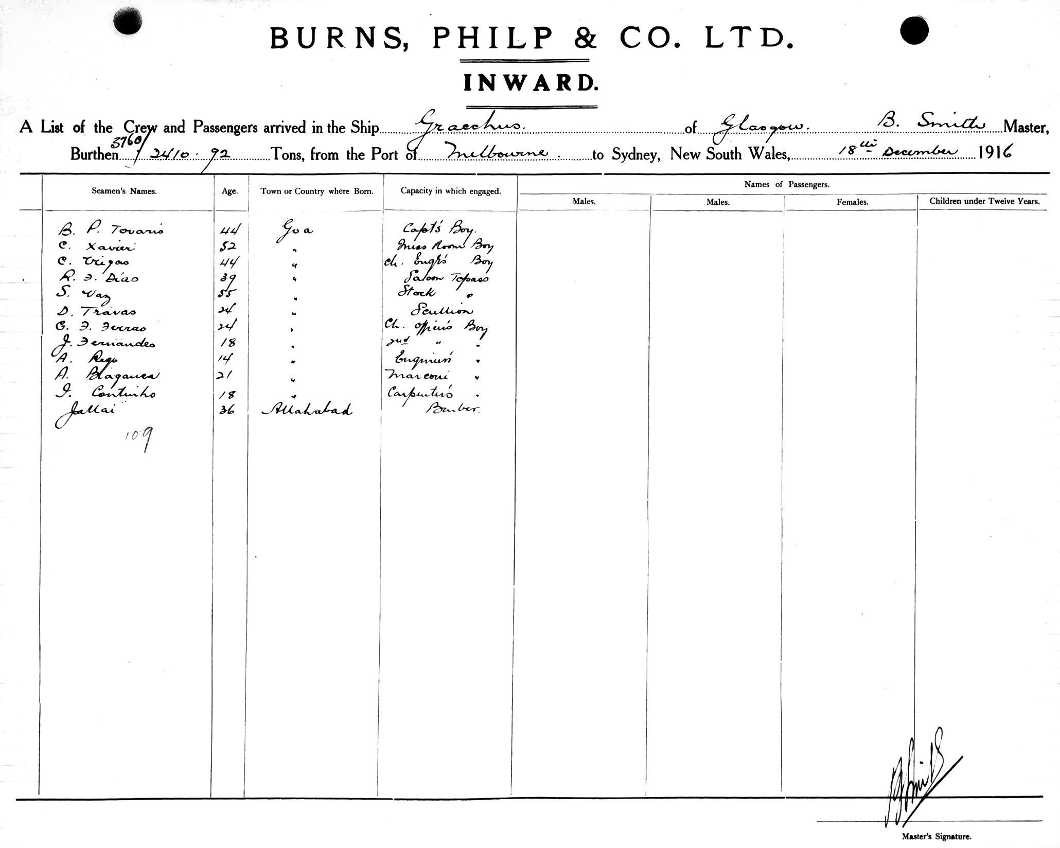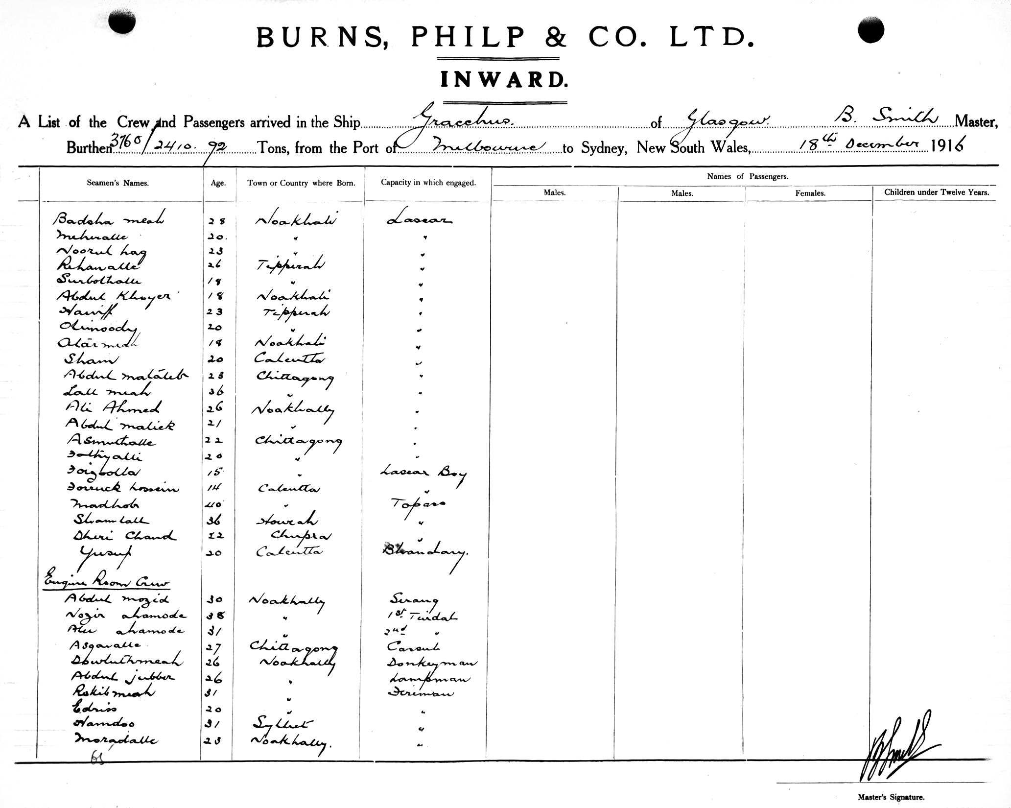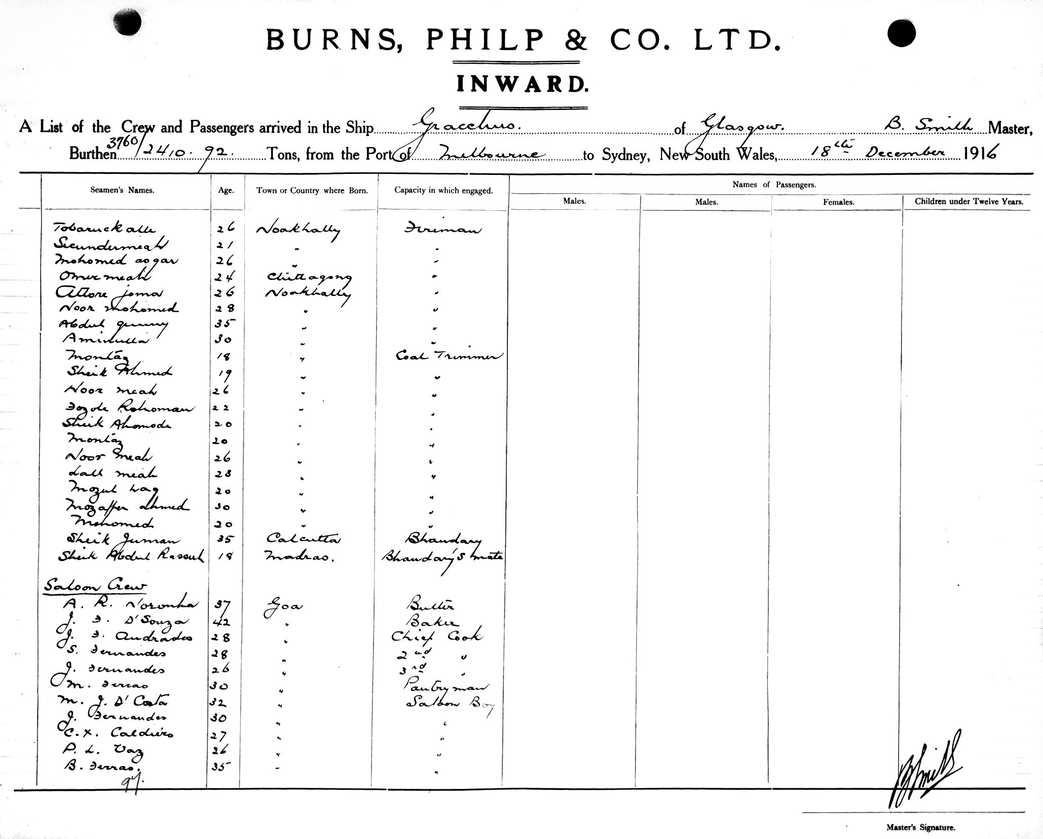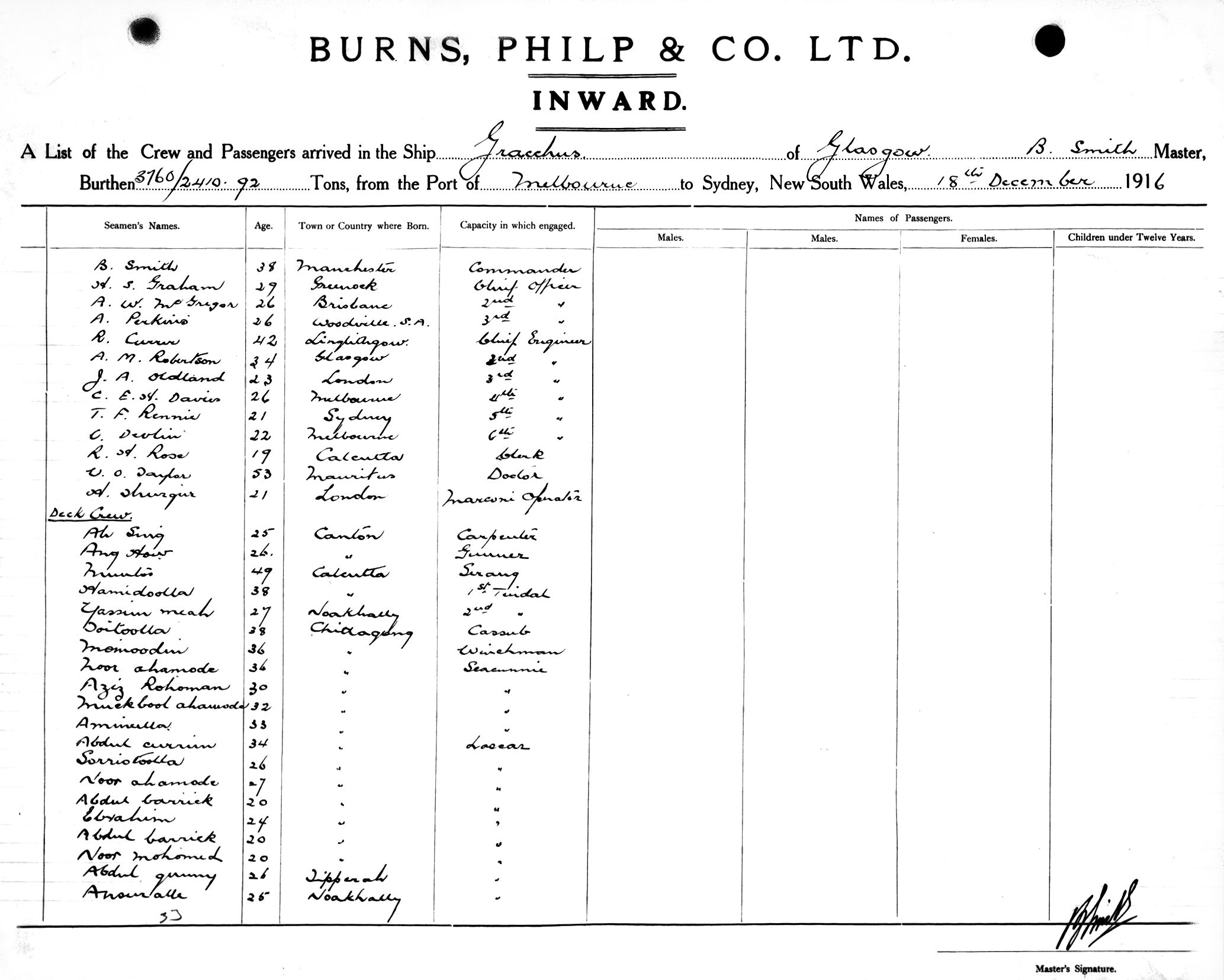 GRACCHUSOF GLASGOW, B. SMITH, MASTER, BURTHEN 3760/2410 TONS FROM THE PORT OF MELBOURNE TO SYDNEY, NEW SOUTH WALES, 18TH DECEMBER 1916 |