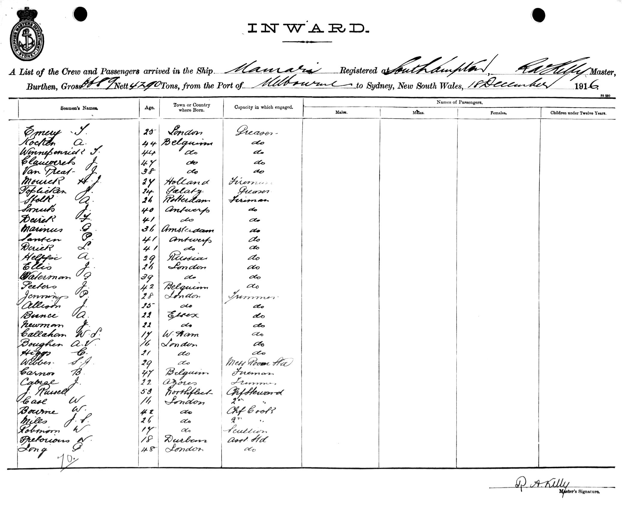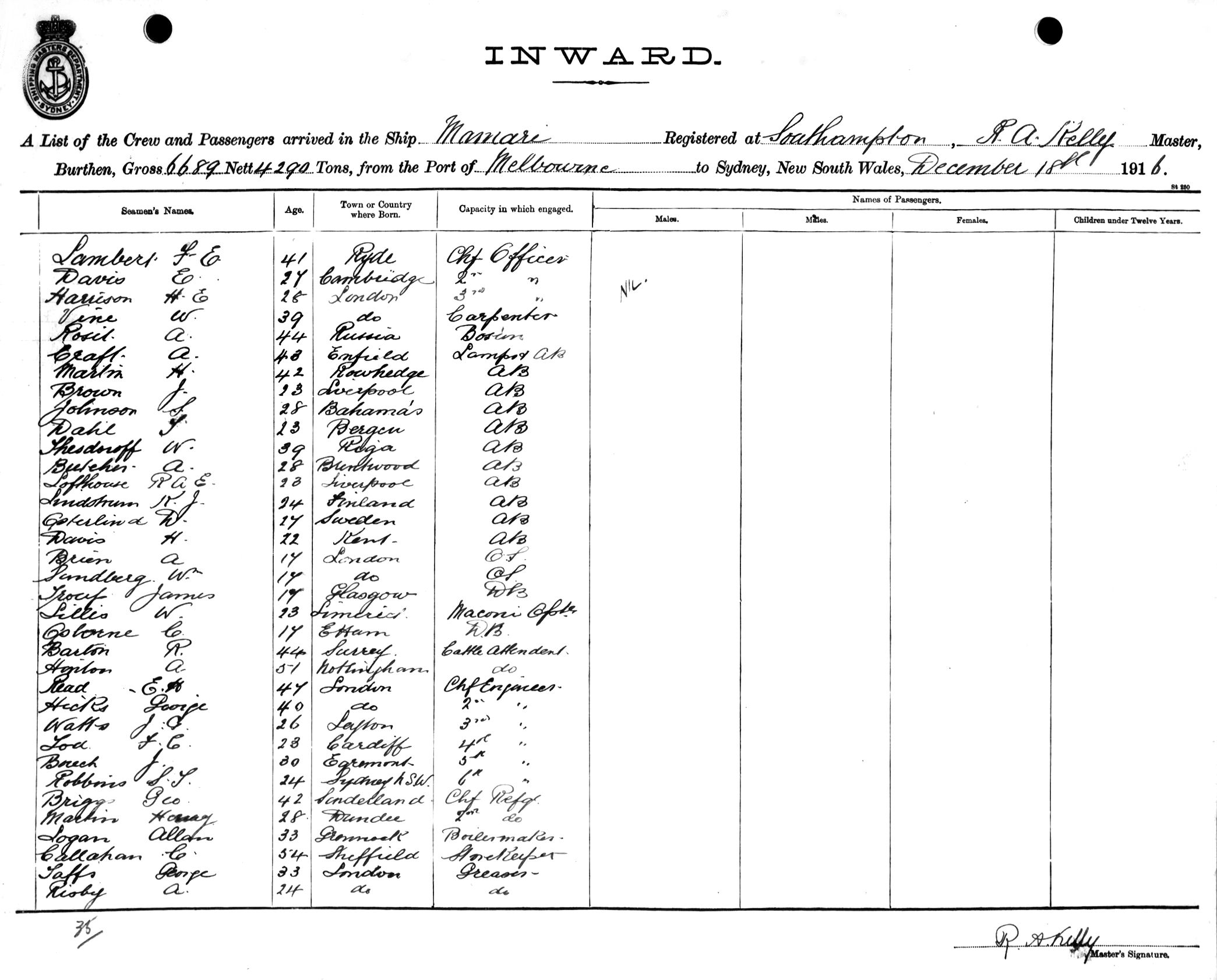 MAMARIOF SOUTHAMPTON, R. A. KELLY, MASTER, BURTHEN 6689/4290 TONS FROM THE PORT OF MELBOURNE TO SYDNEY, NEW SOUTH WALES, 18TH DECEMBER 1916 |
