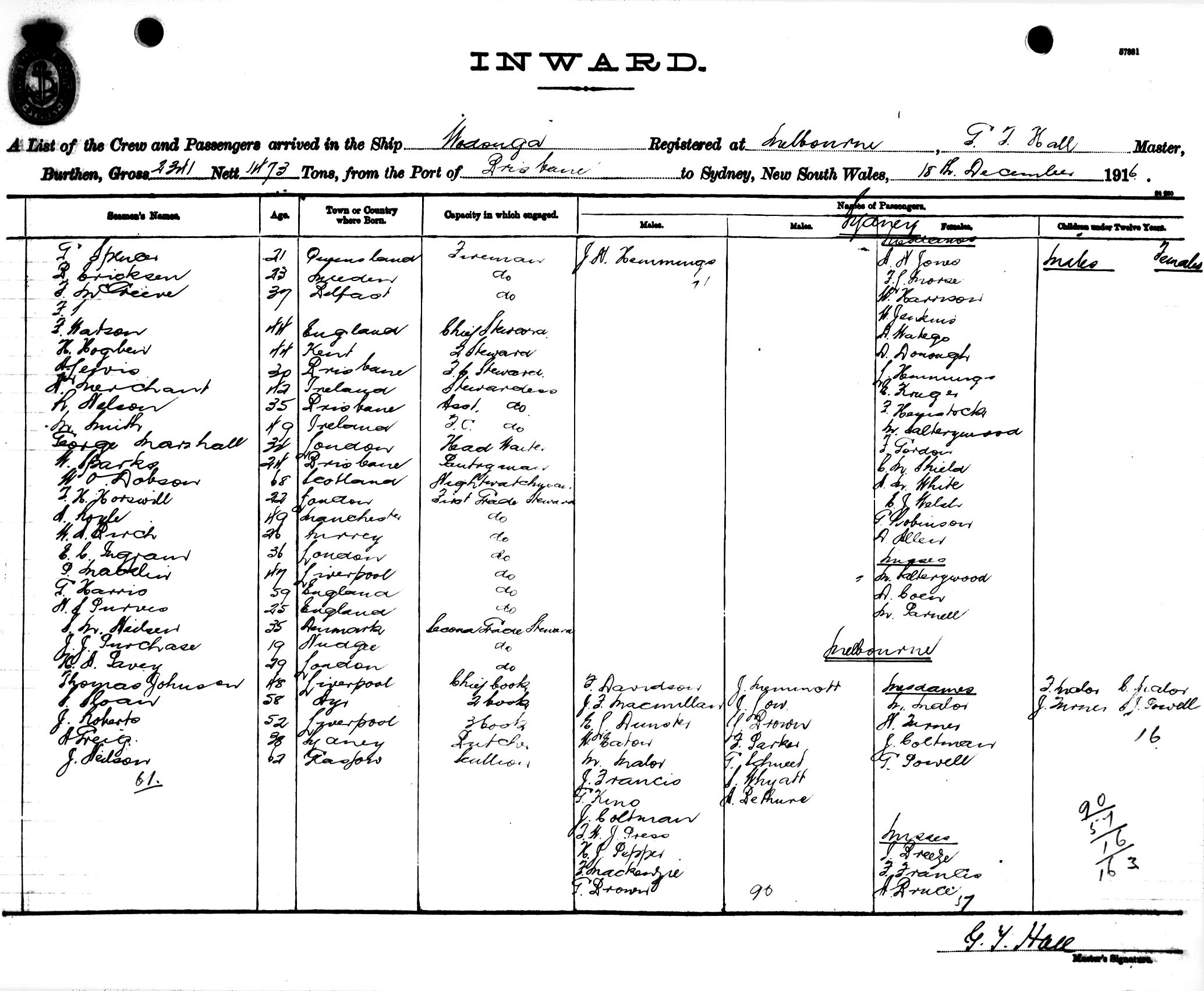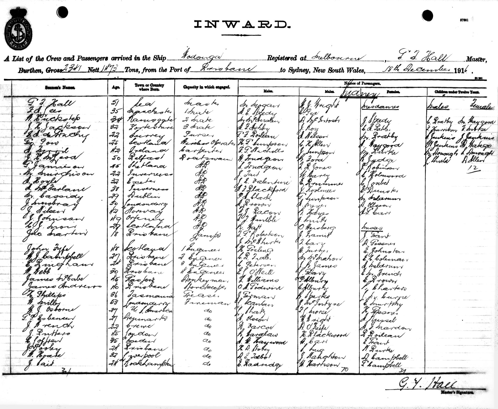 WODONGAOF MELBOURNE, G. T. HALL, MASTER, BURTHEN 2341/1473 TONS FROM THE PORT OF BRISBANE TO SYDNEY, NEW SOUTH WALES, 18TH DECEMBER 1916 |
