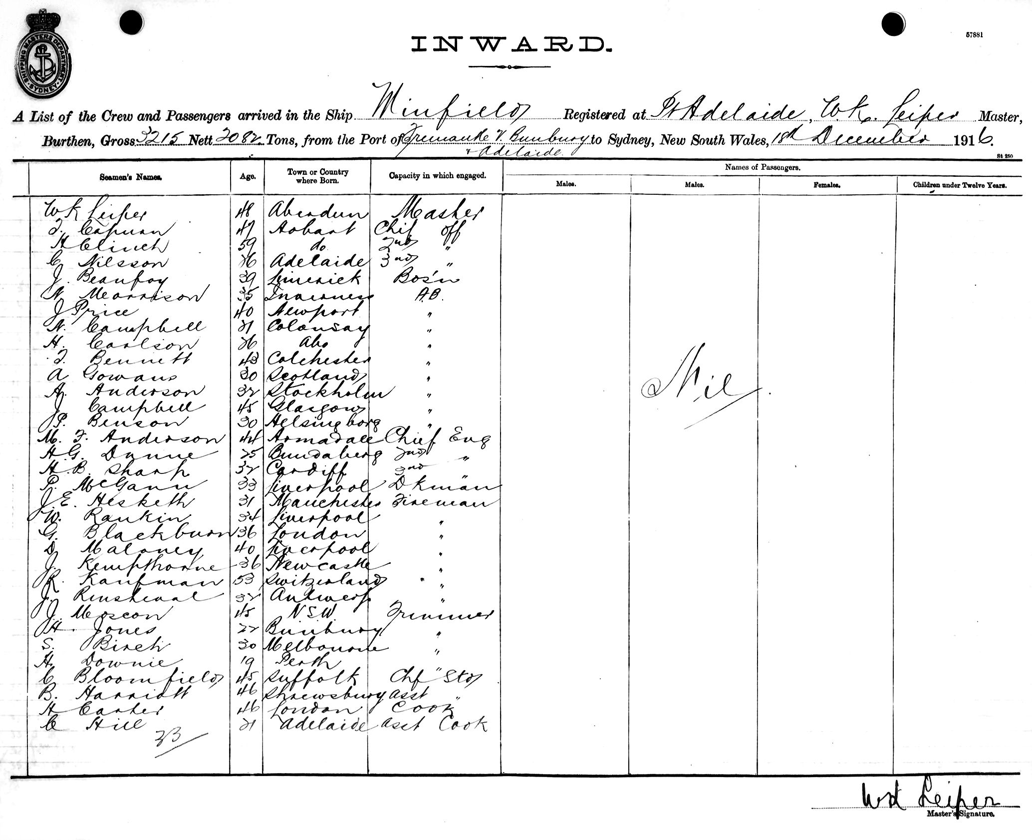 WINFIELDOF PORT ADELAIDE, W. K. LEIPER, MASTER, BURTHEN 3215/2082 TONS FROM THE PORT OF FREMANTLE via BUNBURY & ADELAIDE TO SYDNEY, NEW SOUTH WALES, 18TH DECEMBER 1916 |
