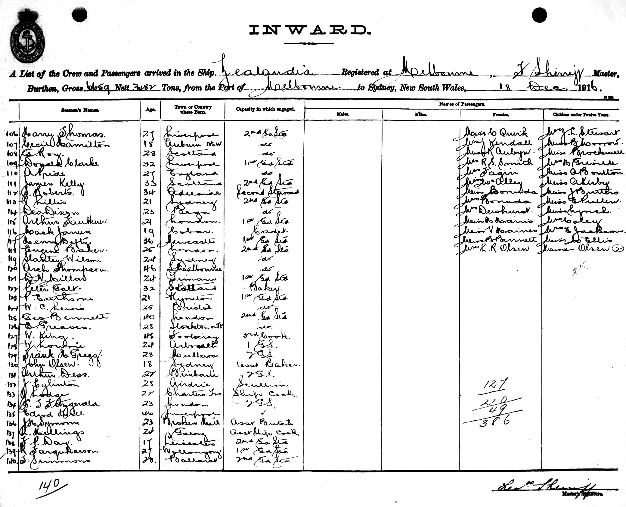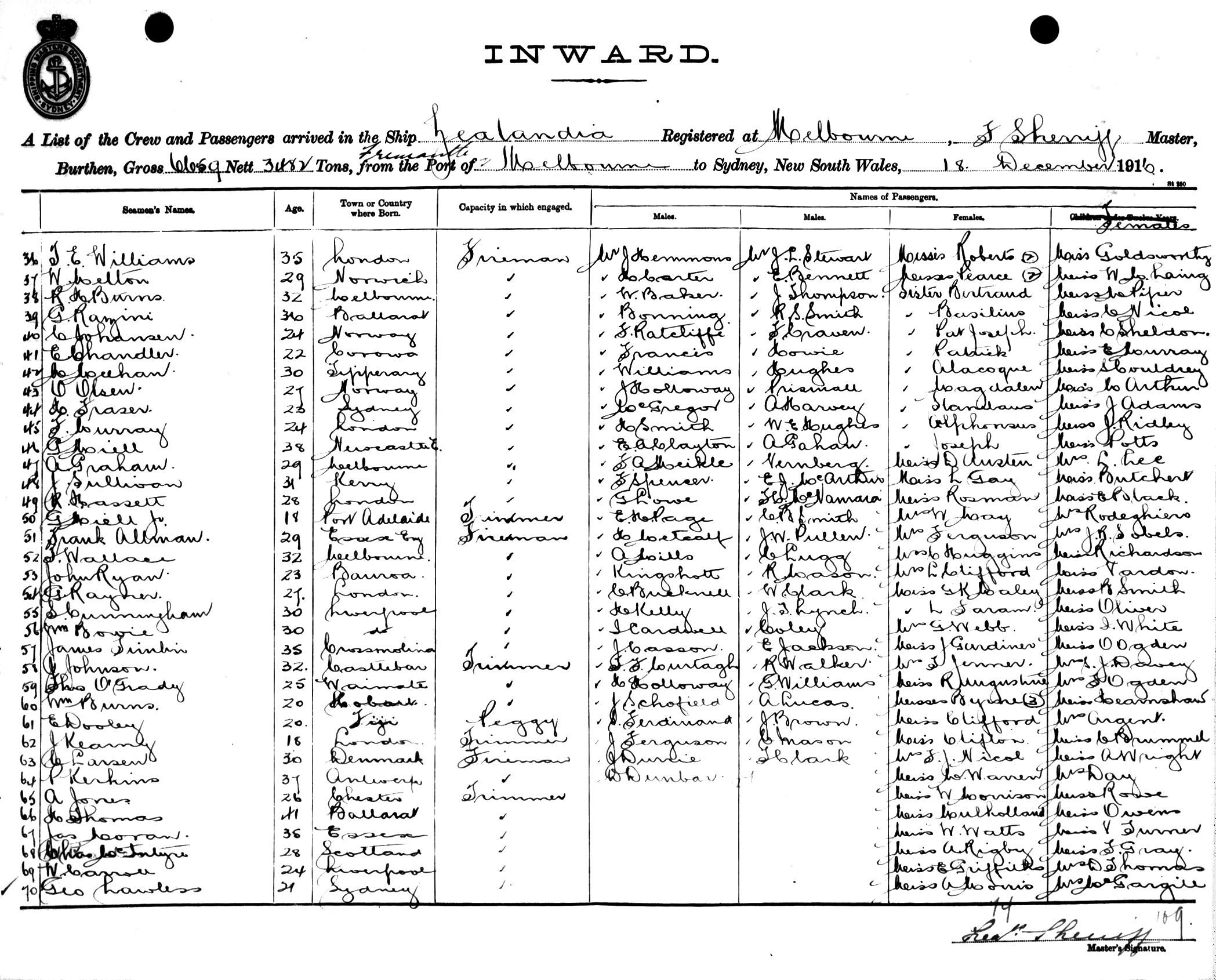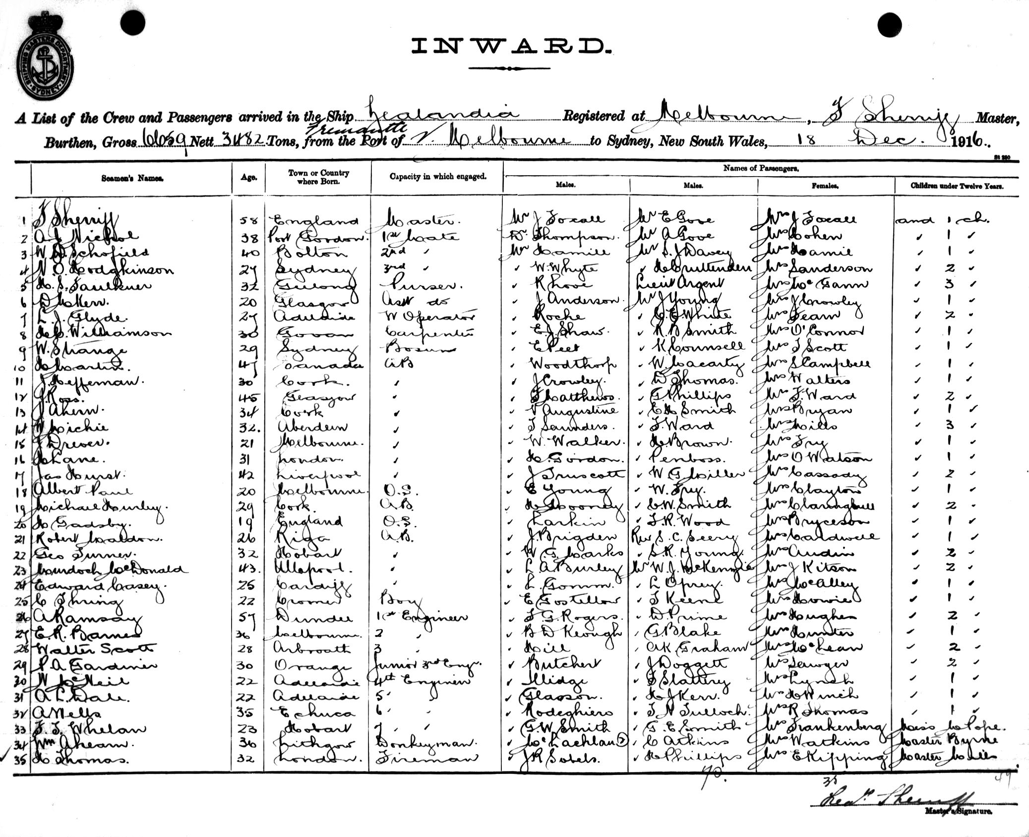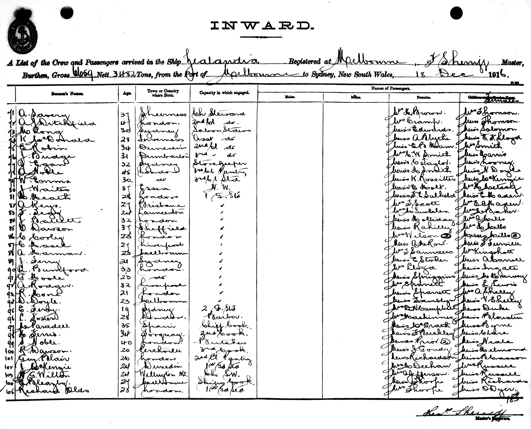 Mariners and ships in Australian Waters | ZEALANDIAOF MELBOURNE, F. SHERRIFF, MASTER, BURTHEN 6659/3482 TONS FROM THE PORT OF FREMANTLE via MELBOURNE TO SYDNEY, NEW SOUTH WALES, 18TH DECEMBER 1916 |