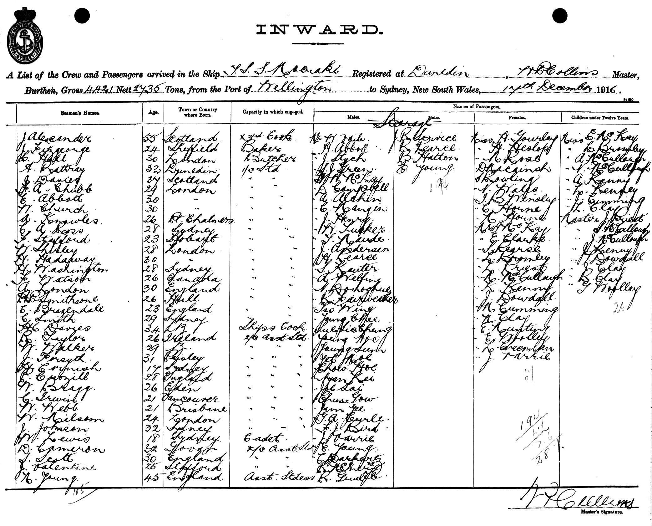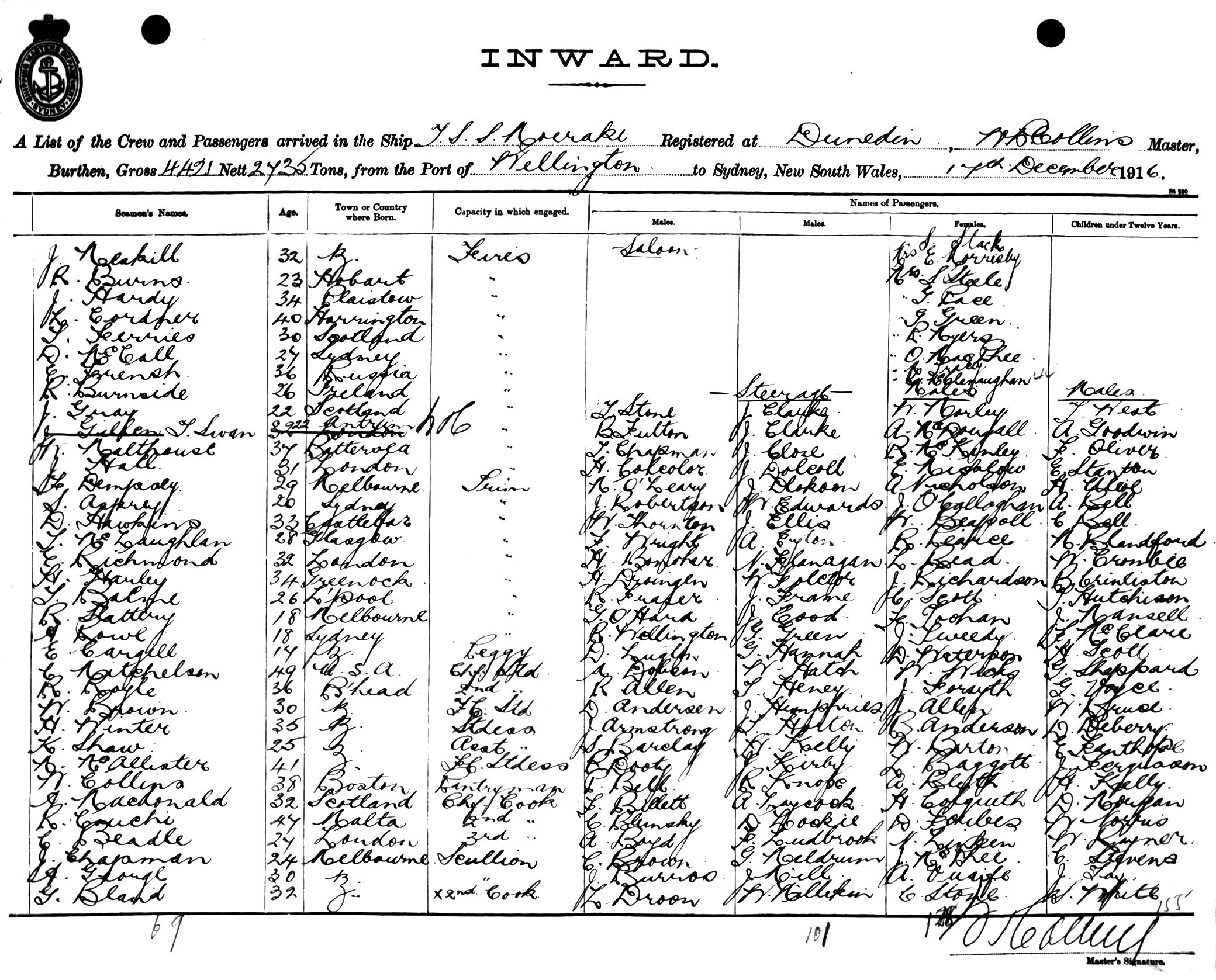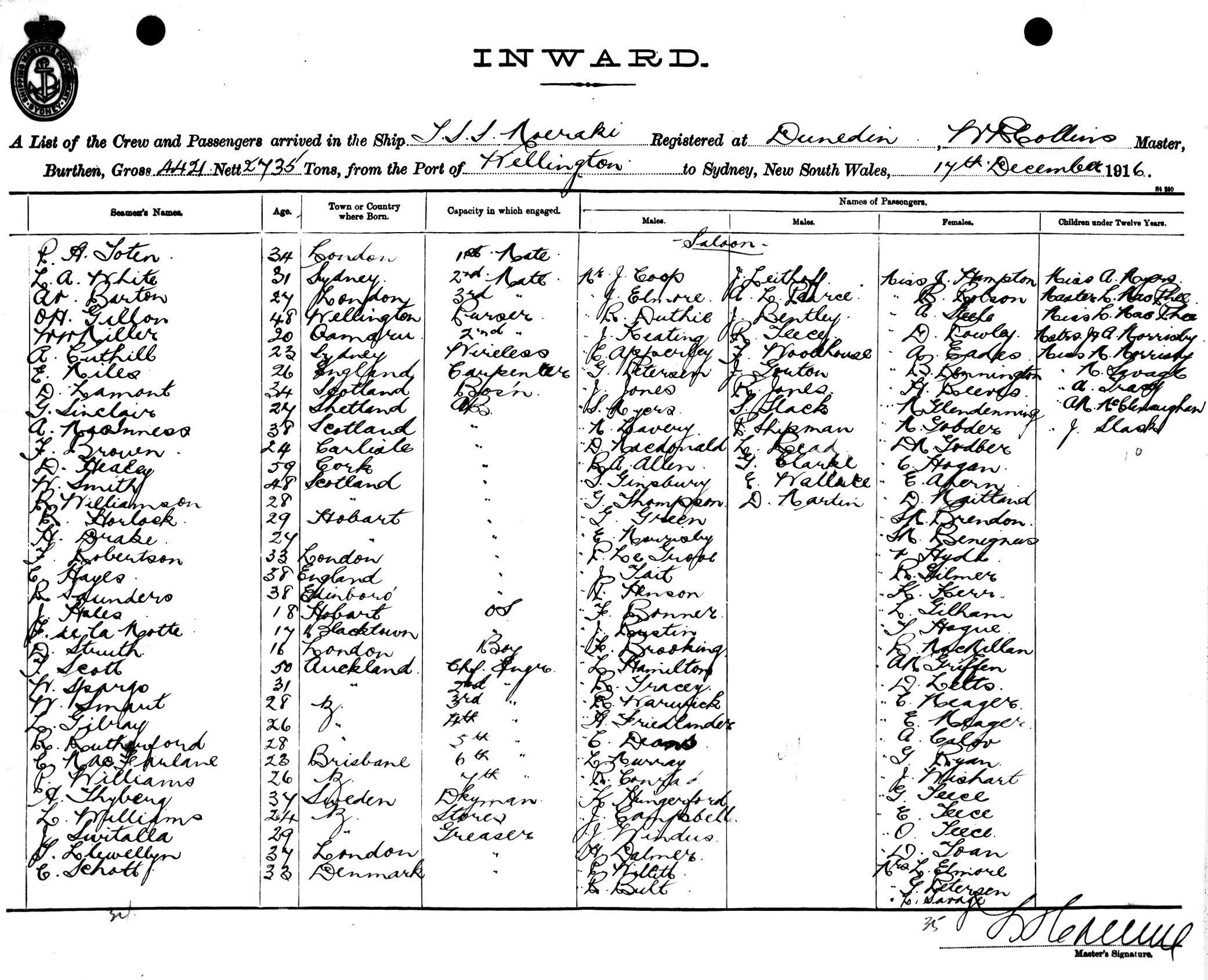 MOERAKIOF DUNEDIN, W. P. COLLINS, MASTER, BURTHEN 4421/2735 TONS FROM THE PORT OF WELLINGTON TO SYDNEY, NEW SOUTH WALES, 17TH DECEMBER 1916 |