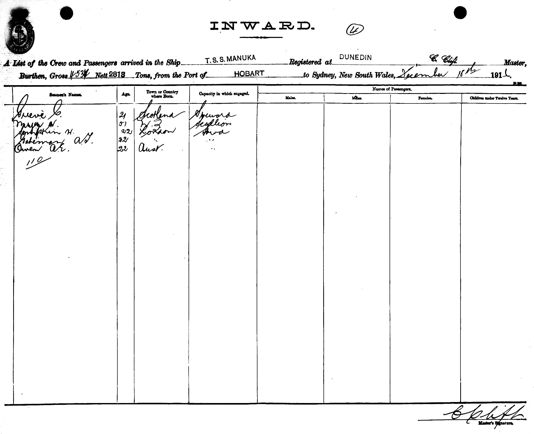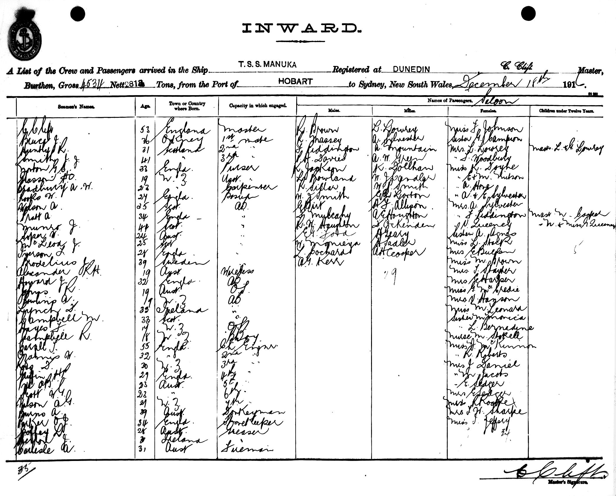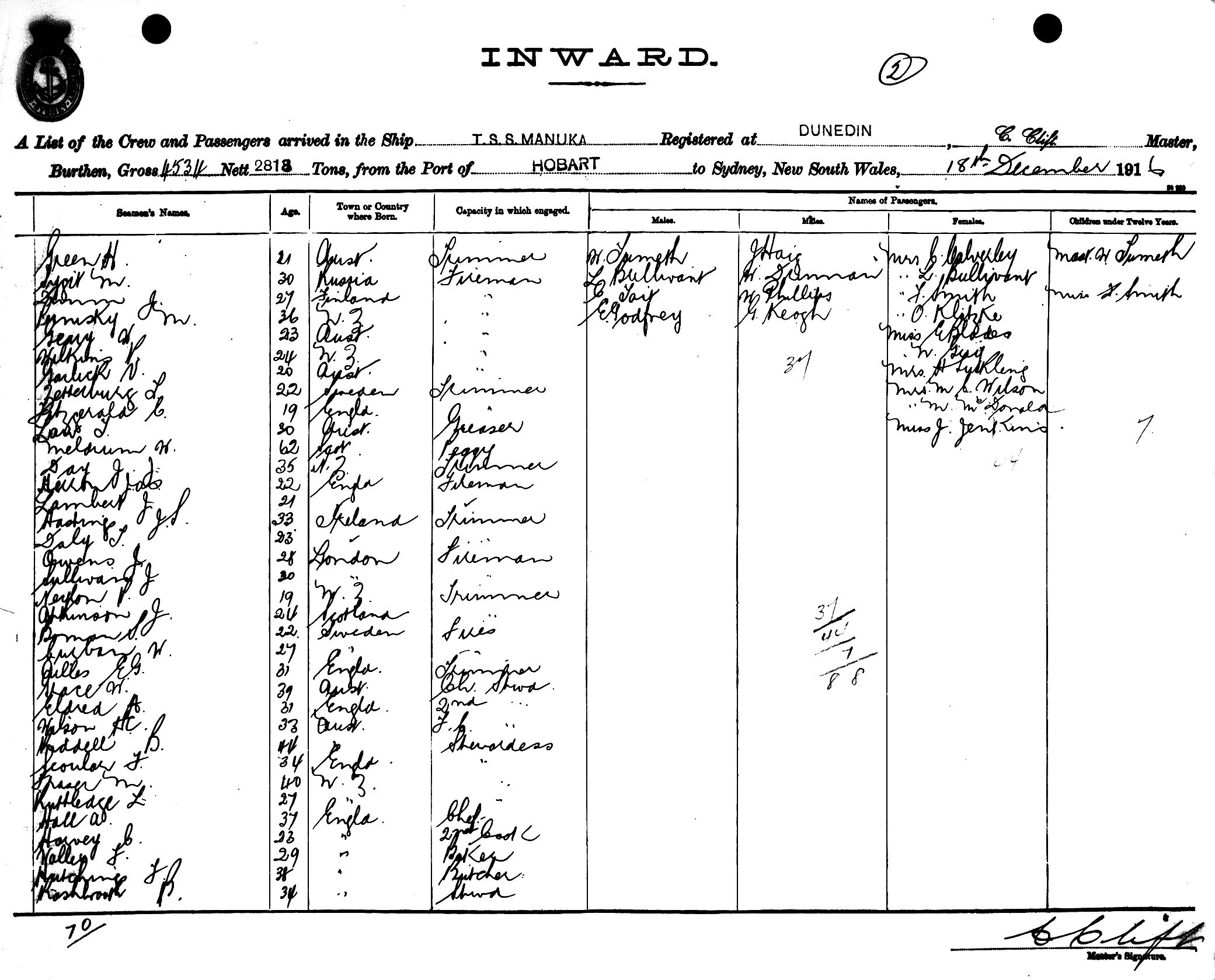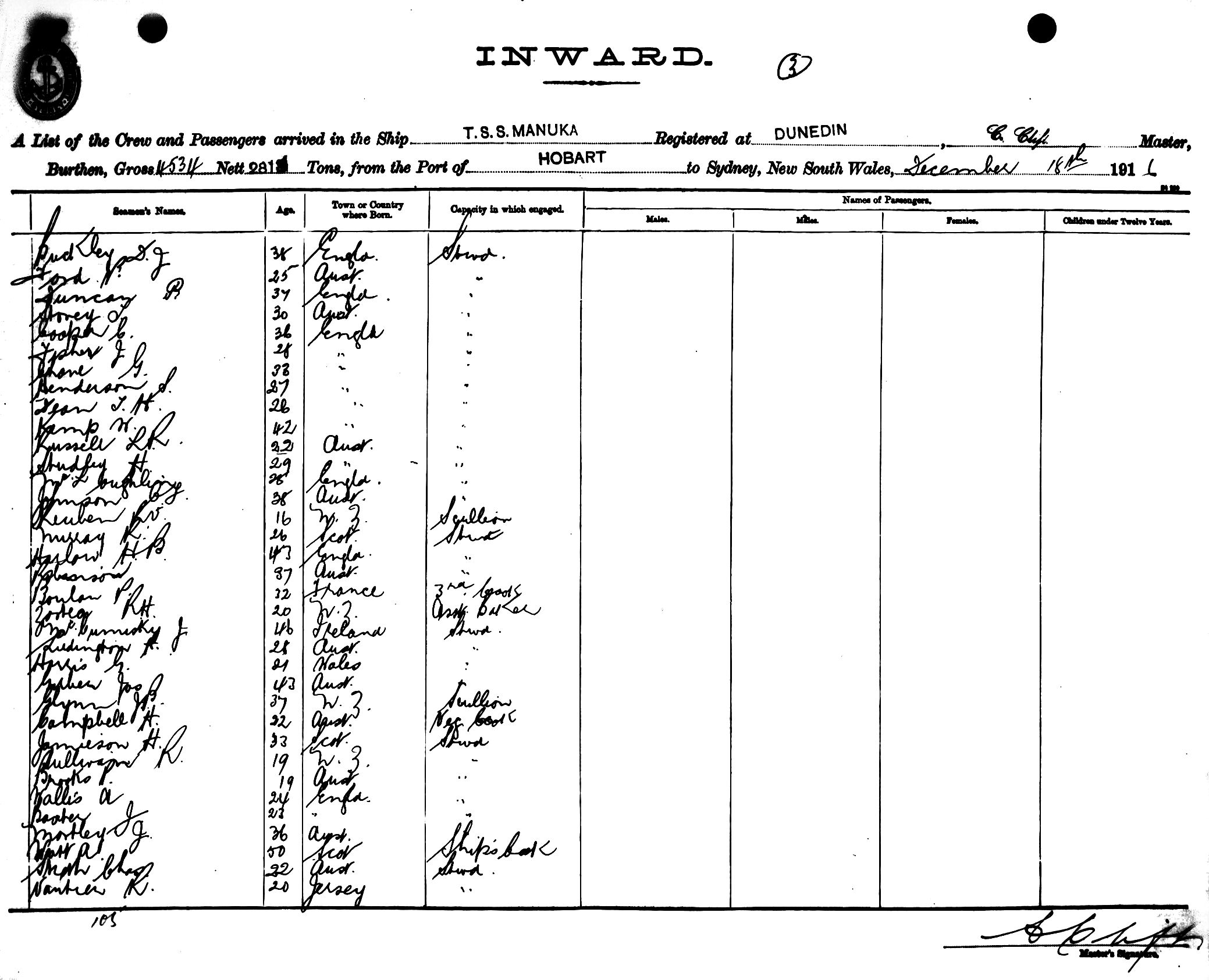 MANUKAOF DUNEDIN, C. CLIFT, MASTER, BURTHEN 4534/2813 TONS FROM THE PORT OF HOBART TO SYDNEY, NEW SOUTH WALES, 18TH DECEMBER 1916 |