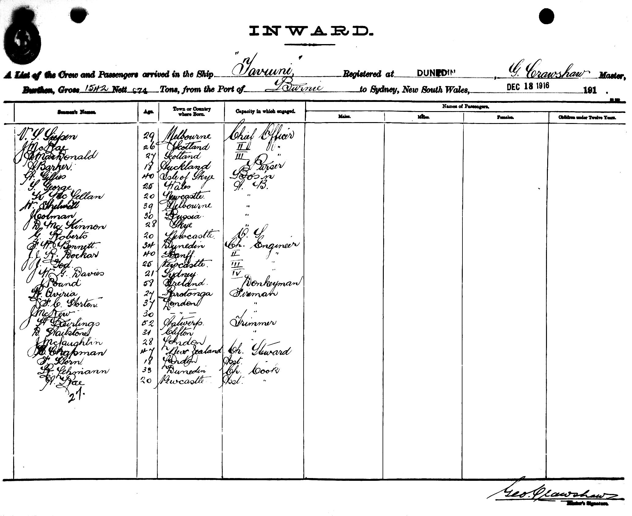 TAVIUNIOF DUNEDIN, G. CRAWSHAW, MASTER, BURTHEN 1542/874 TONS FROM THE PORT OF BURNIE TO SYDNEY, NEW SOUTH WALES, 18TH DECEMBER 1916 |