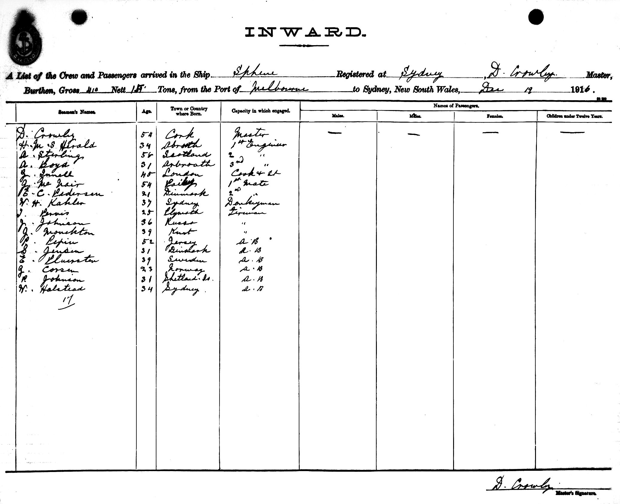 SPHENEOF SYDNEY, D. CROWLEY, MASTER, BURTHEN 410/159 TONS FROM THE PORT OF MELBOURNE TO SYDNEY, NEW SOUTH WALES, 19TH DECEMBER 1916 |