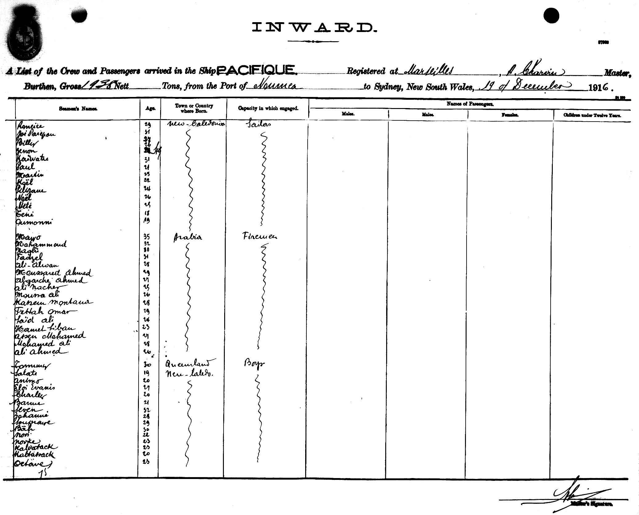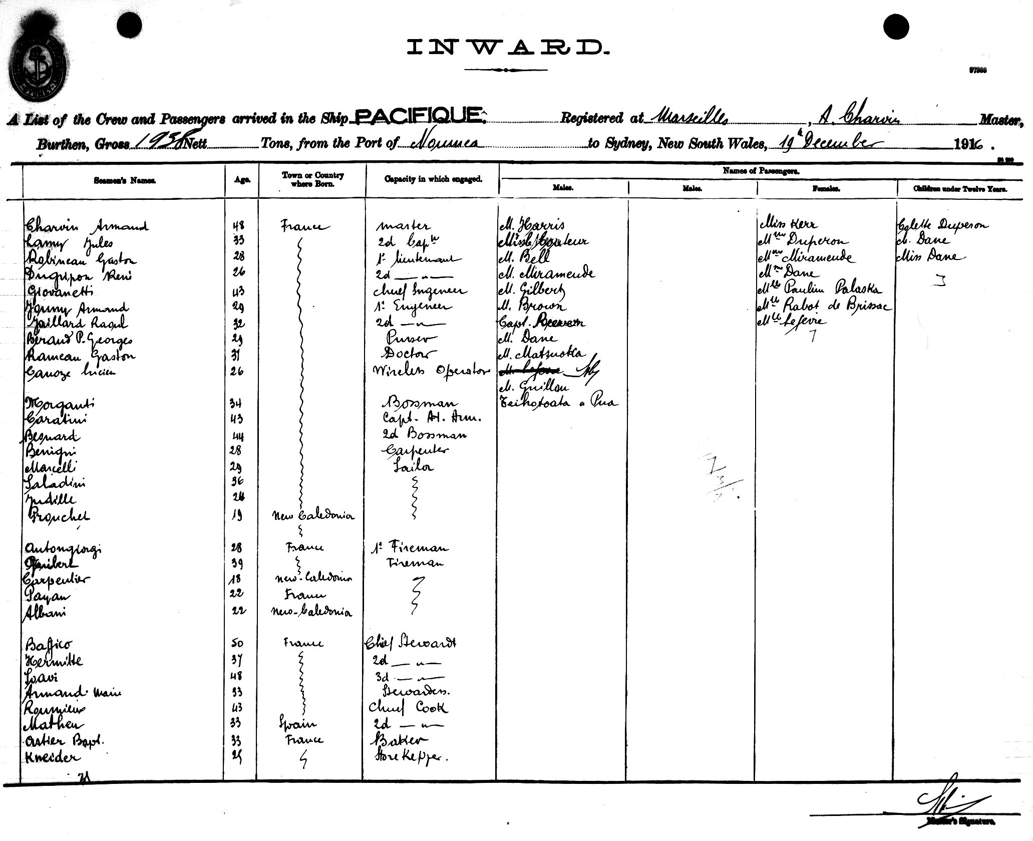 PACIFIQUEOF MARSEILLLE, A. CHARVIN, MASTER, BURTHEN 1938 TONS FROM THE PORT OF NOUMEA TO SYDNEY, NEW SOUTH WALES, 19TH DECEMBER 1916 |