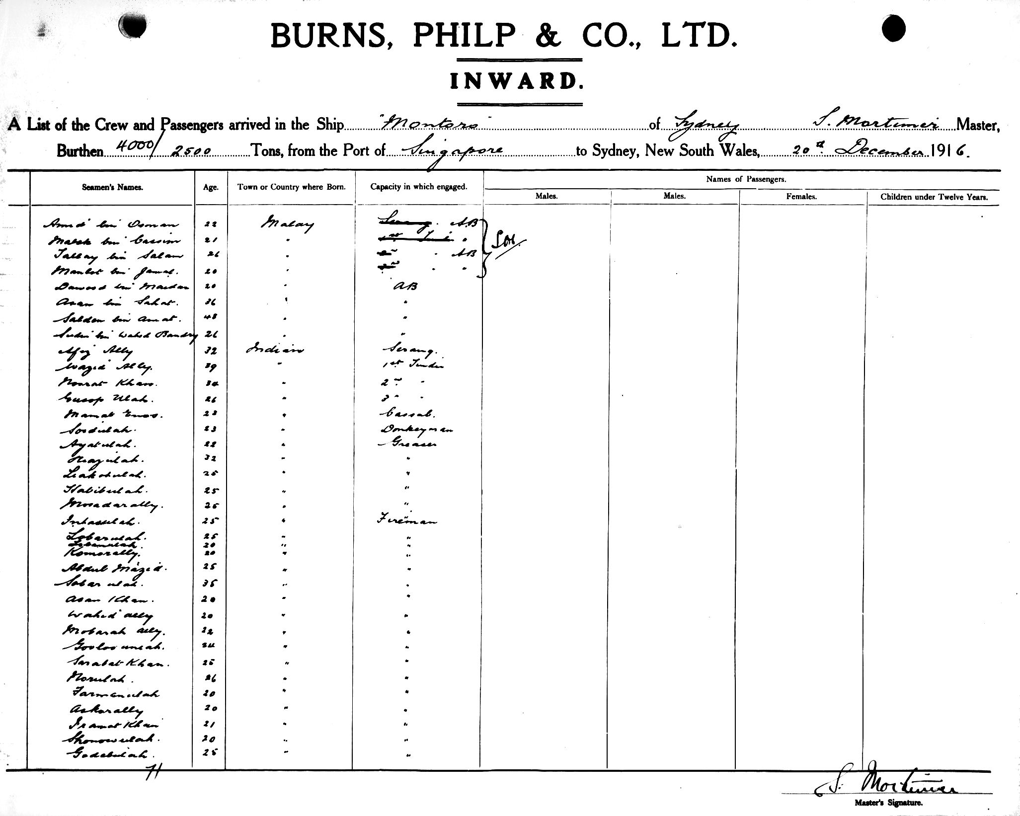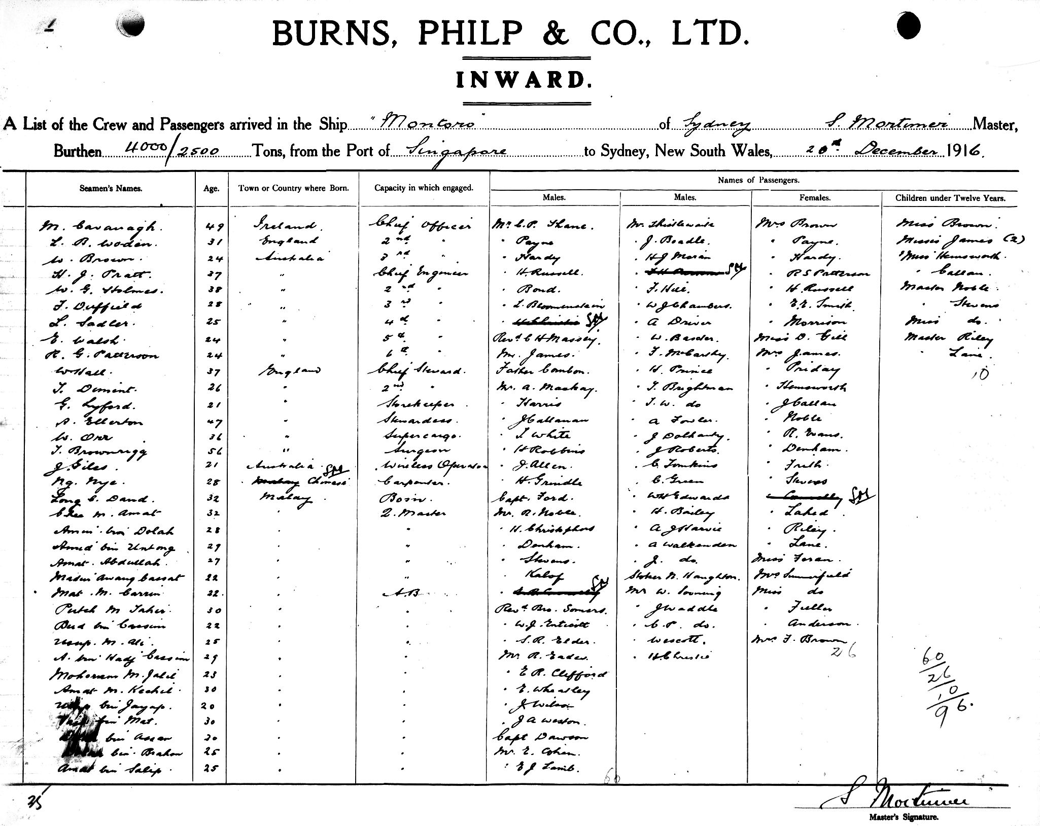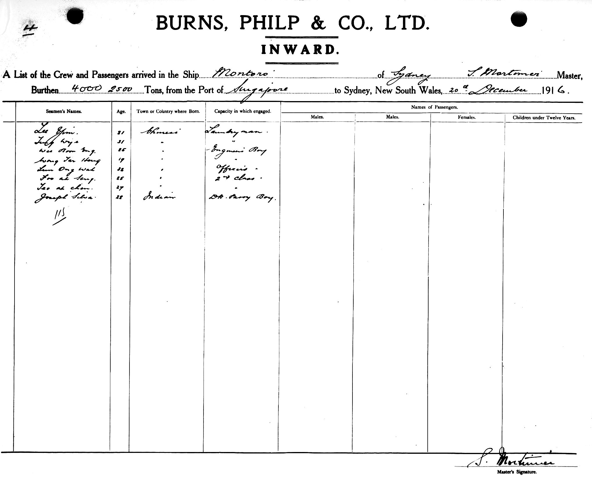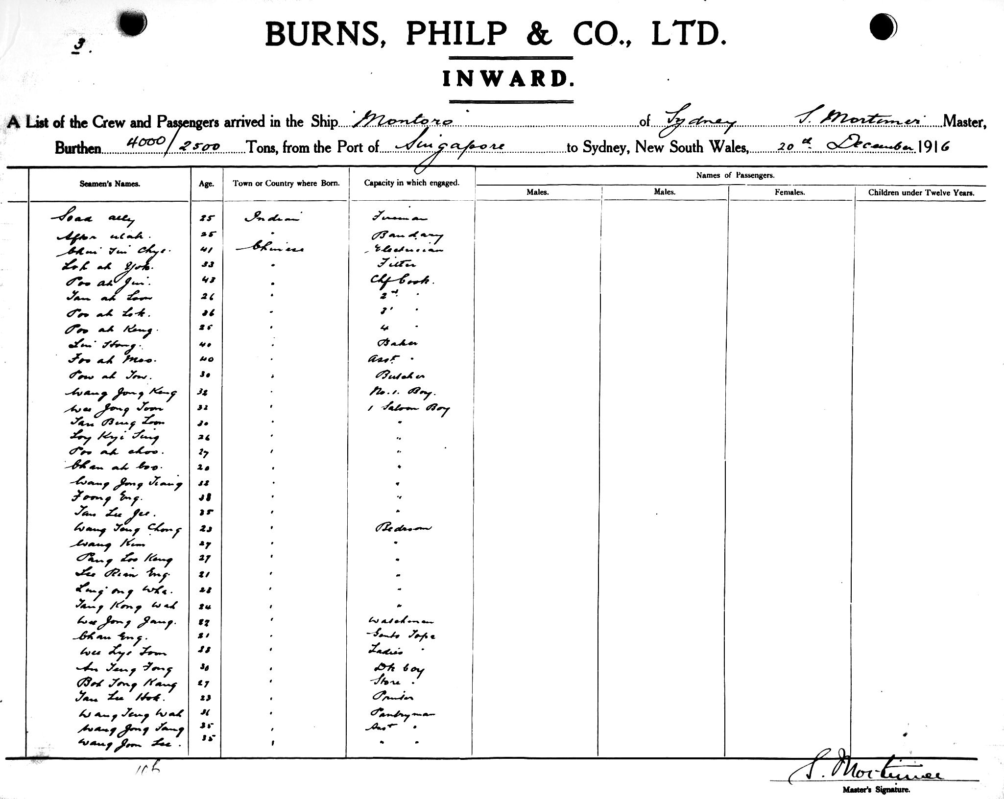 MONTOROOF SYDNEY, S. MORTIMER, MASTER, BURTHEN 4000/2500 TONS FROM THE PORT OF SINGAPORE TO SYDNEY, NEW SOUTH WALES, 20TH DECEMBER 1916 |