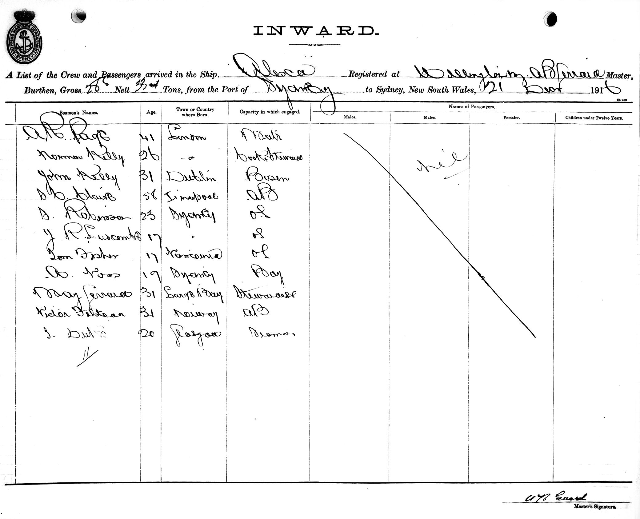 ALEXAOF WELLINGTON, A. B. GERRARD, MASTER, BURTHEN 285/334 TONS FROM THE PORT OF (GILBERT ISLANDS) TO SYDNEY, NEW SOUTH WALES, 21ST DECEMBER 1916 |