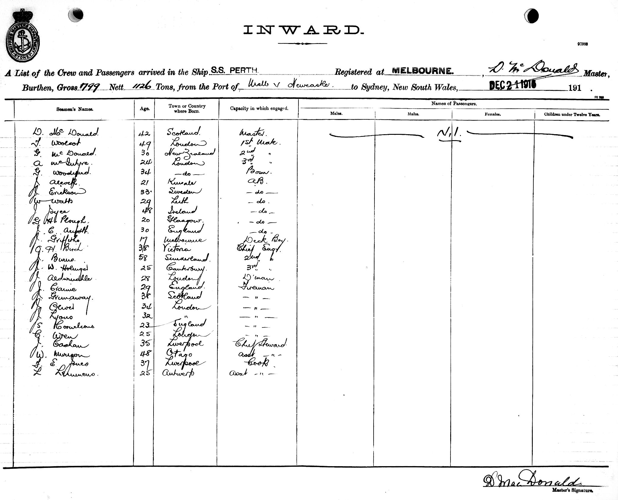 PERTHOF MELBOURNE, D. MCDONALD, MASTER, BURTHEN 1799/1126 TONS FROM THE PORT OF MELBOURNE via NEWCASTLE TO SYDNEY, NEW SOUTH WALES, 21ST DECEMBER 1916 |