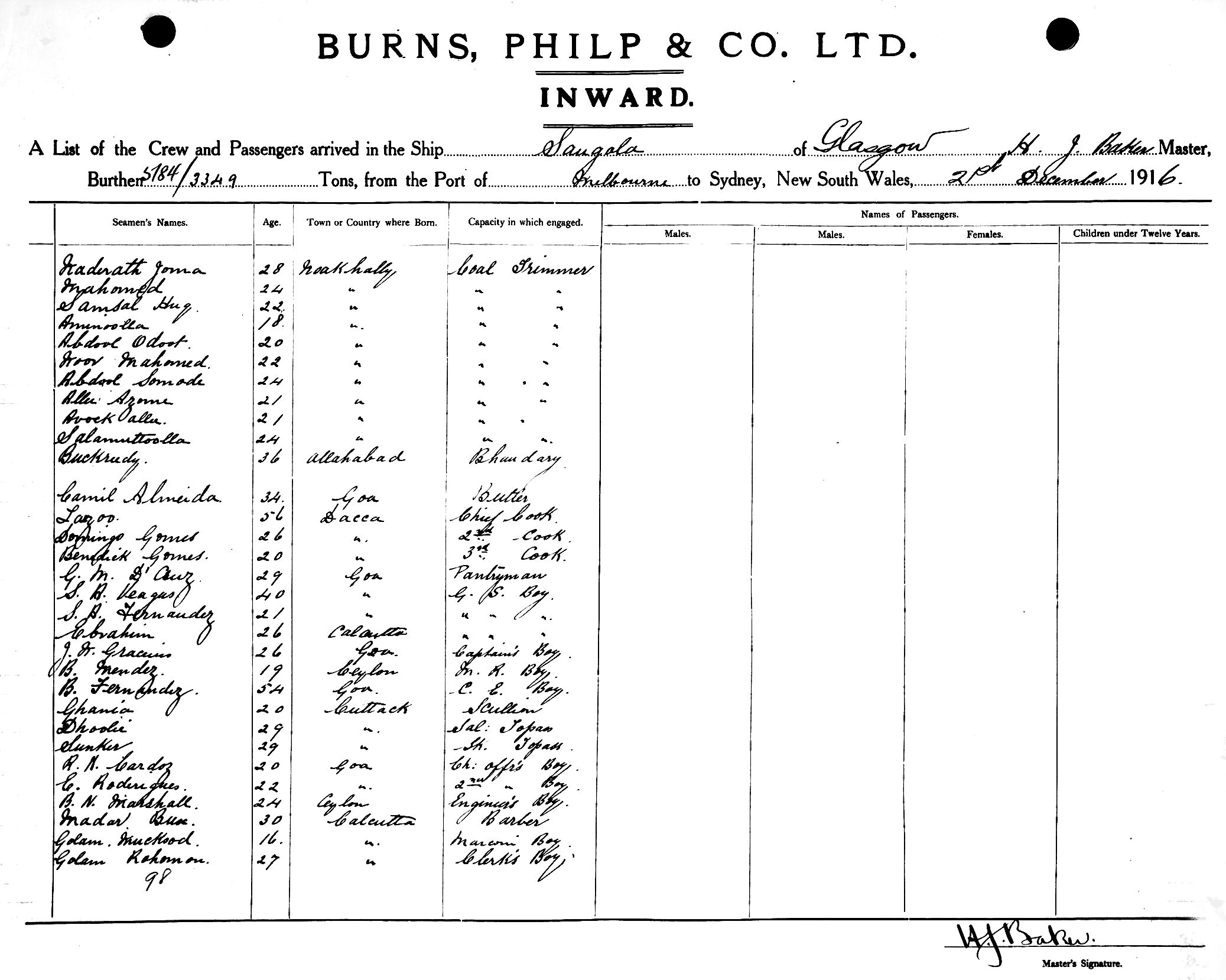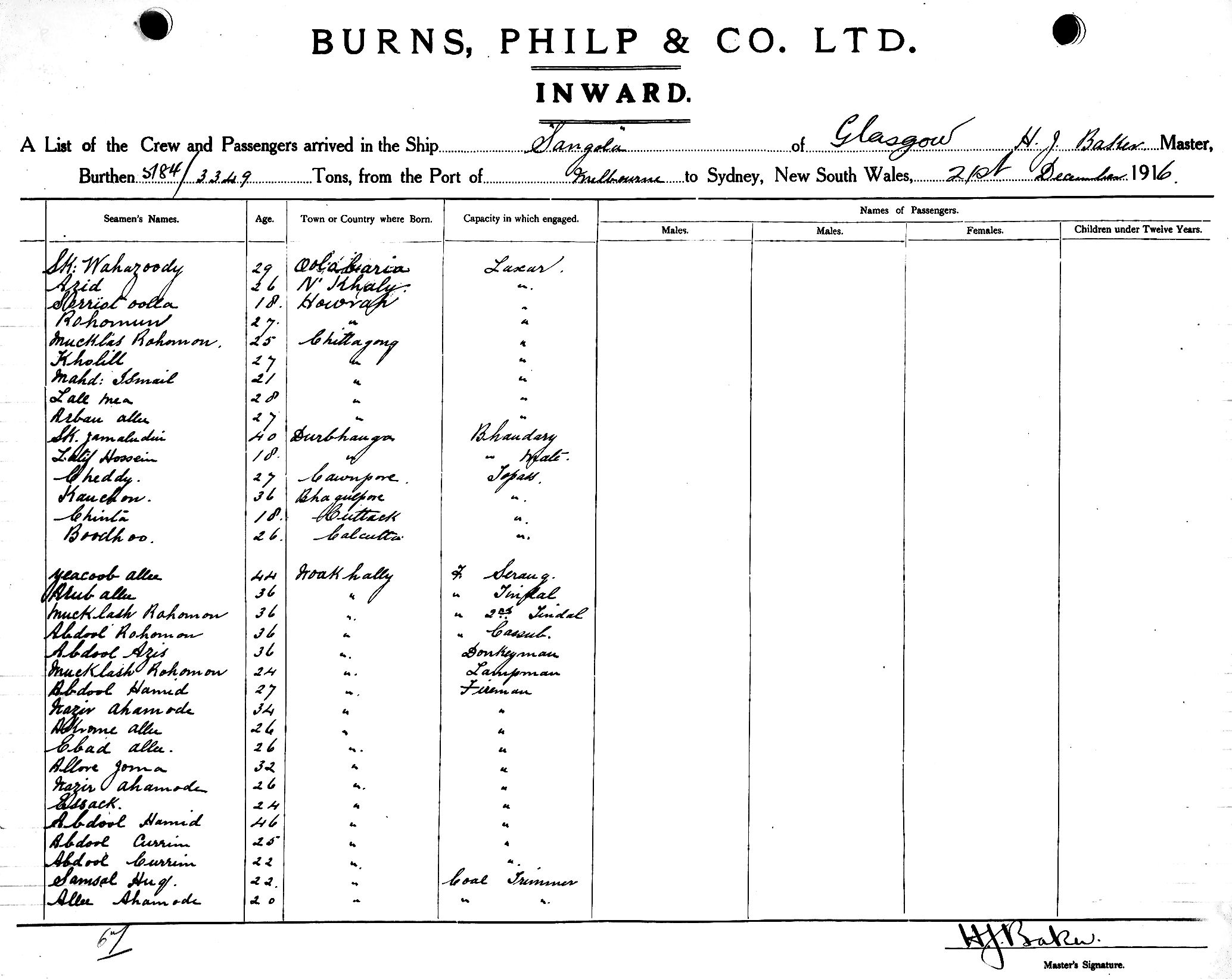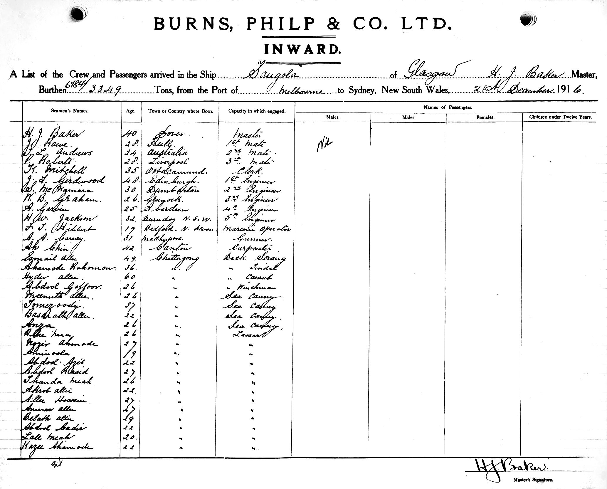Mariners and ships in Australian Waters | SANGOLAOF GLASGOW, H. J. BAKER, MASTER, BURTHEN 5784/3349 TONS FROM THE PORT OF MELBOURNE TO SYDNEY, NEW SOUTH WALES, 21ST DECEMBER 1916 |