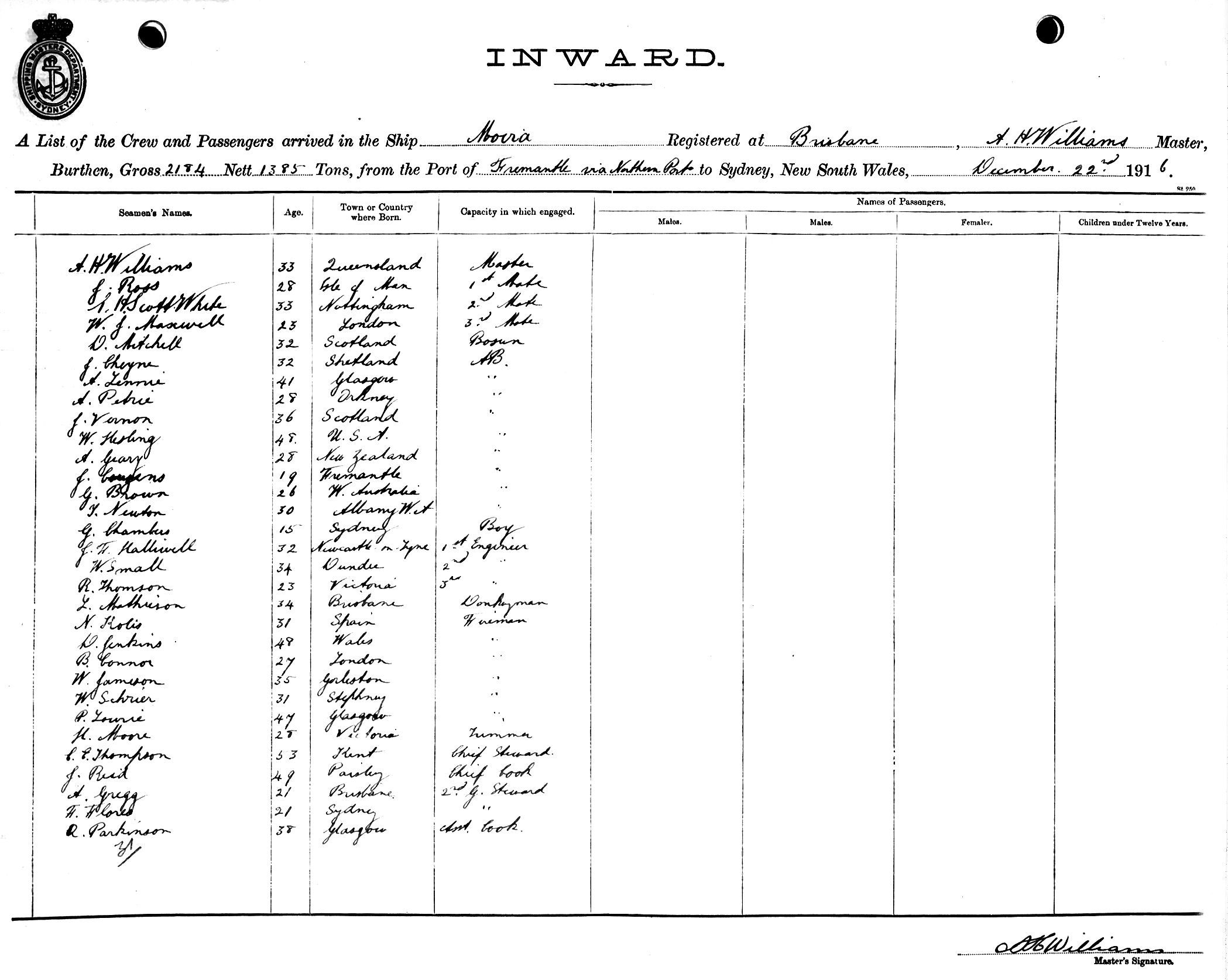 MOIRAOF BRISBANE, A. H. WILLIAMS, MASTER, BURTHEN 2184/1385 TONS FROM THE PORT OF FREMANTLE via NORTHERN PORTS TO SYDNEY, NEW SOUTH WALES, 22ND DECEMBER 1916 |