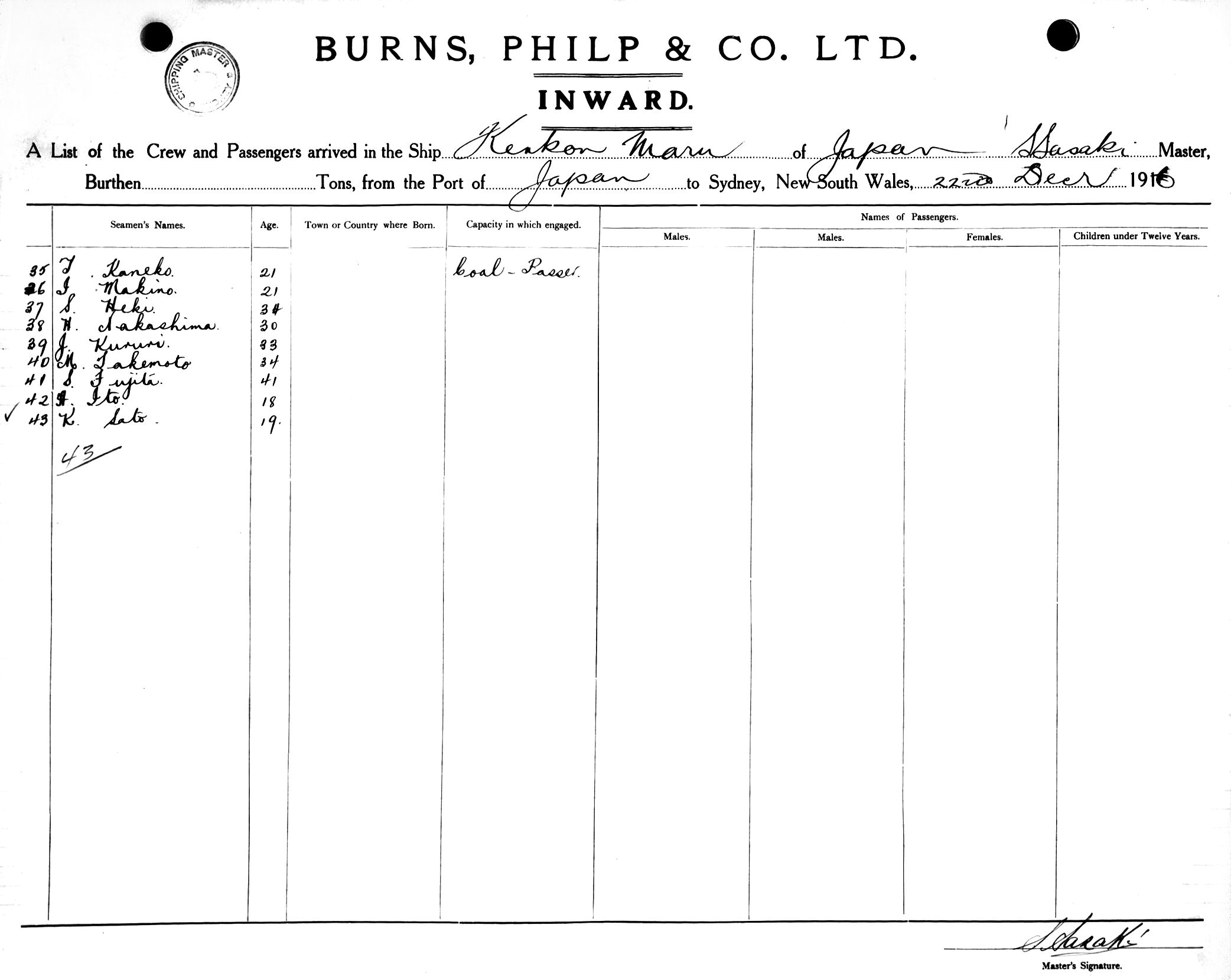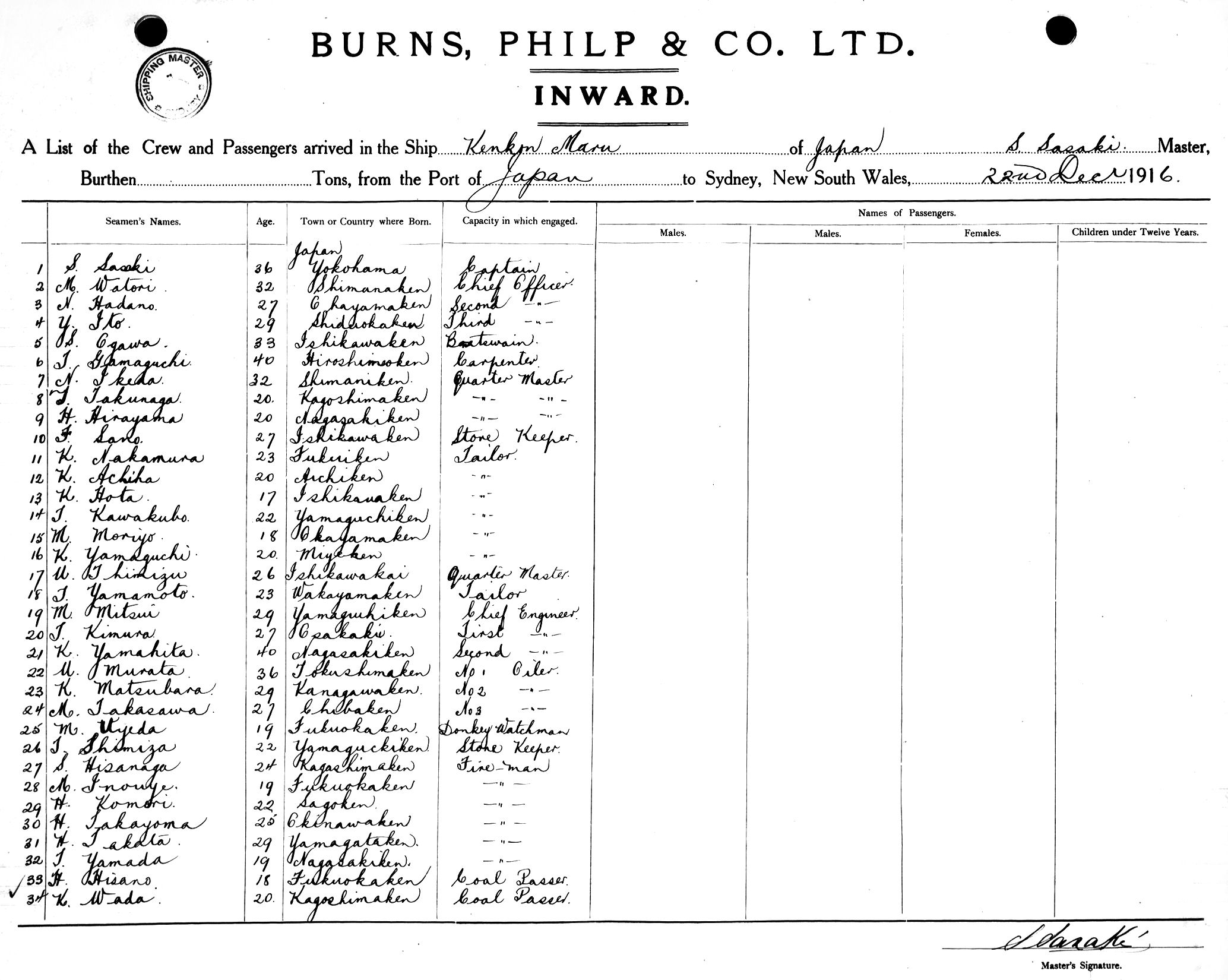 KENKON MARUOF JAPAN, S. SASAKI, MASTER, BURTHEN (2913/2109) TONS FROM THE PORT OF JAPAN TO SYDNEY, NEW SOUTH WALES, 22ND DECEMBER 1916 |