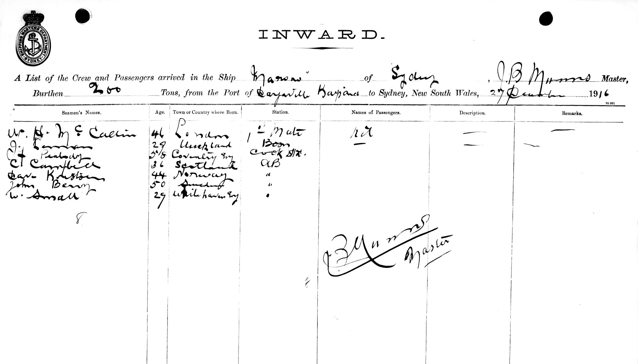 MAROROOF SYDNEY, J. B. MUNNS, MASTER, BURTHEN 200 TONS FROM THE PORT OF DARGAVILLE, KAIPARA TO SYDNEY, NEW SOUTH WALES, 27TH DECEMBER 1916 |