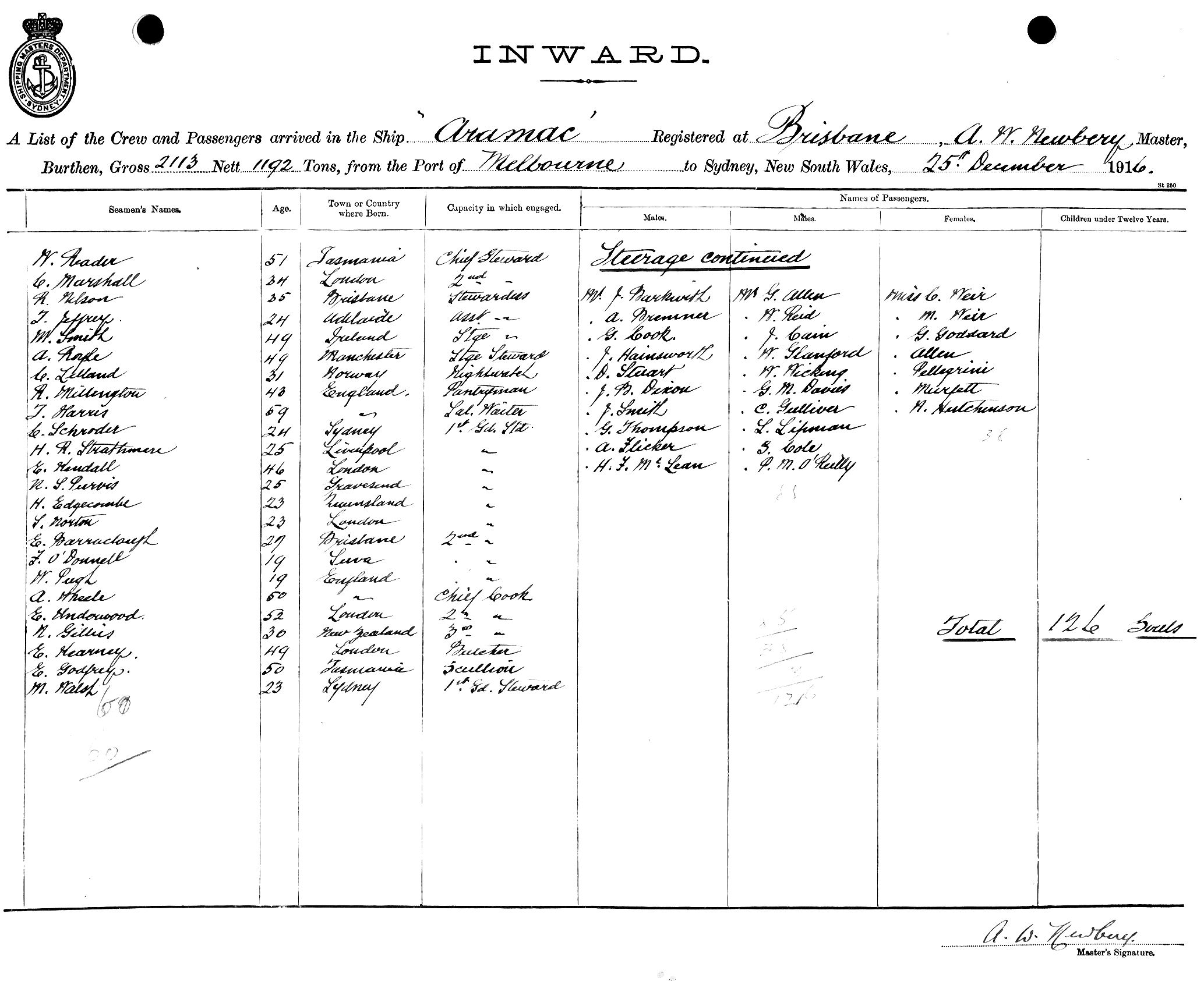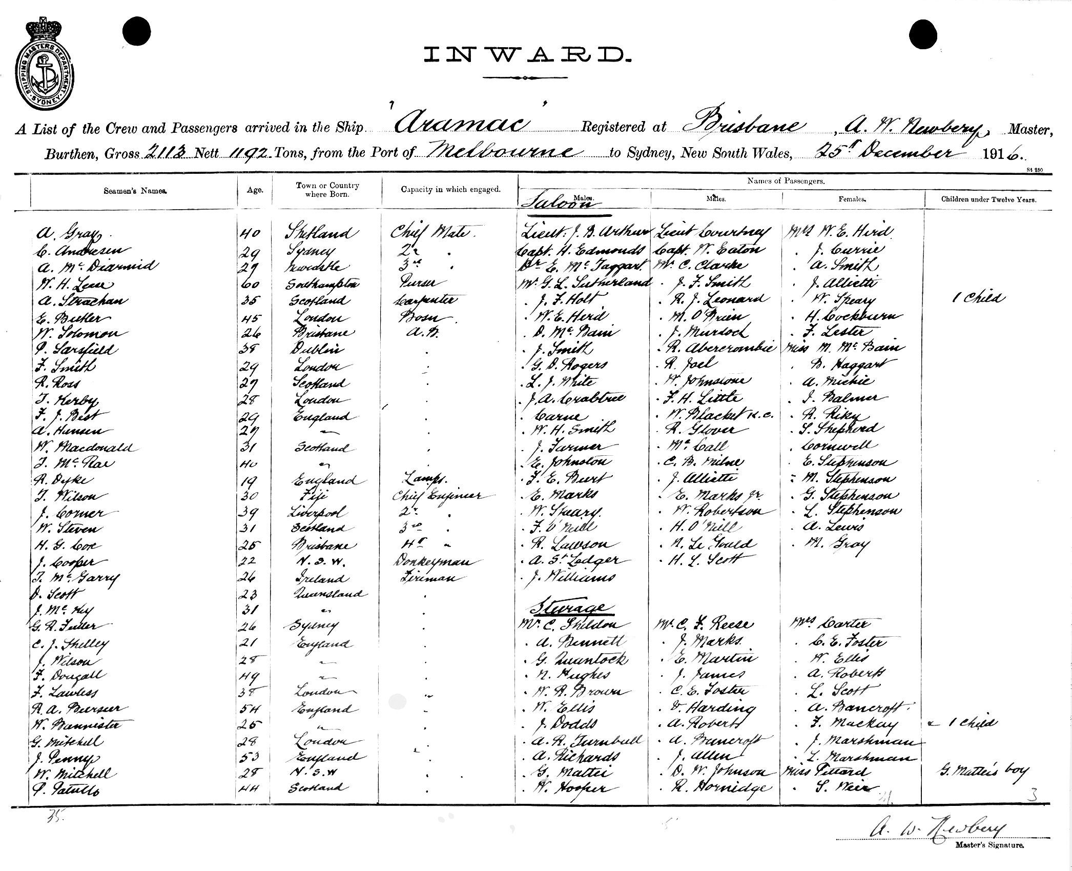 ARAMACOF BRISBANE, A. W. NEWBERY, MASTER, BURTHEN 2113/1192 TONS FROM THE PORT OF MELBOURNE TO SYDNEY, NEW SOUTH WALES, 25TH DECEMBER 1916 |