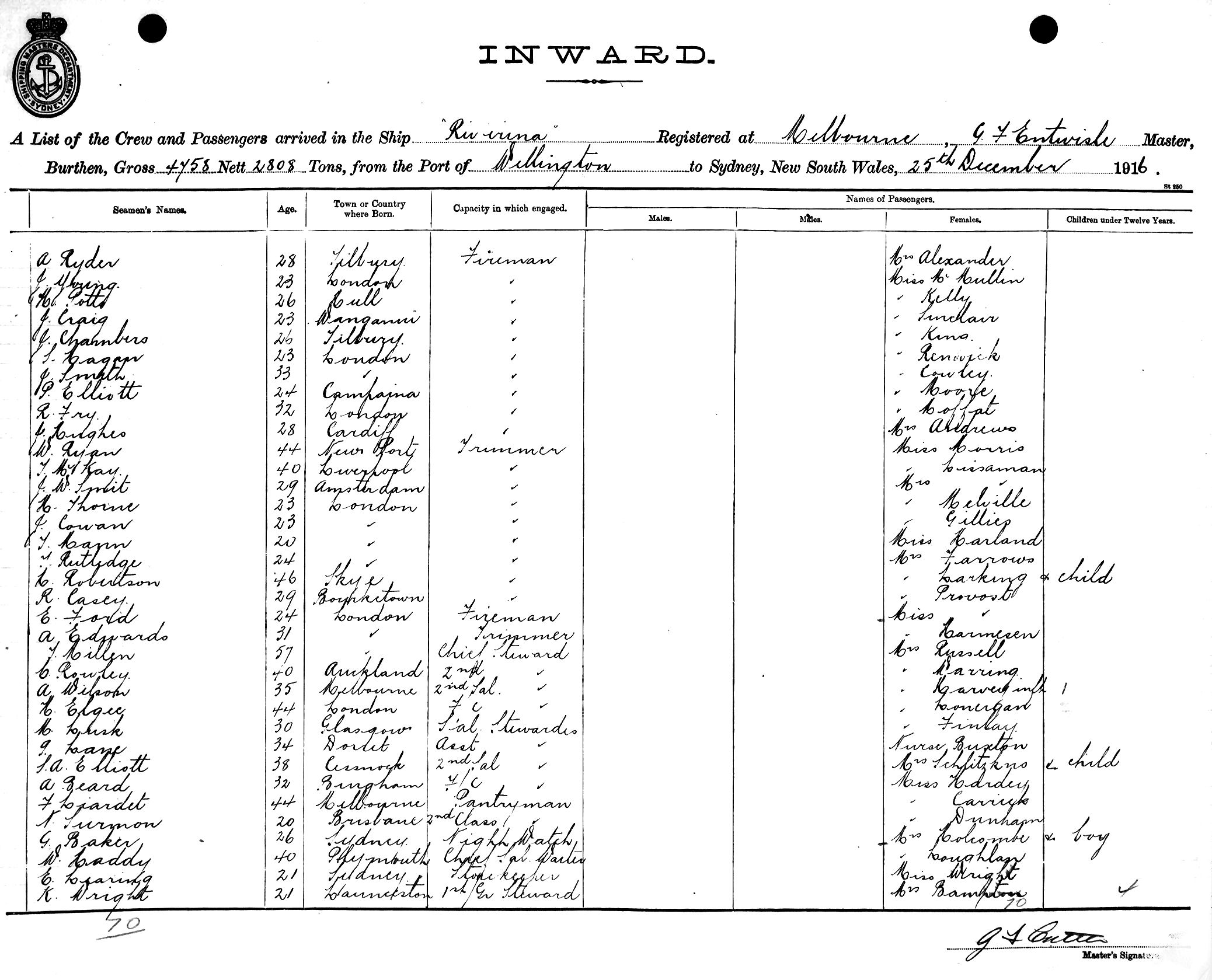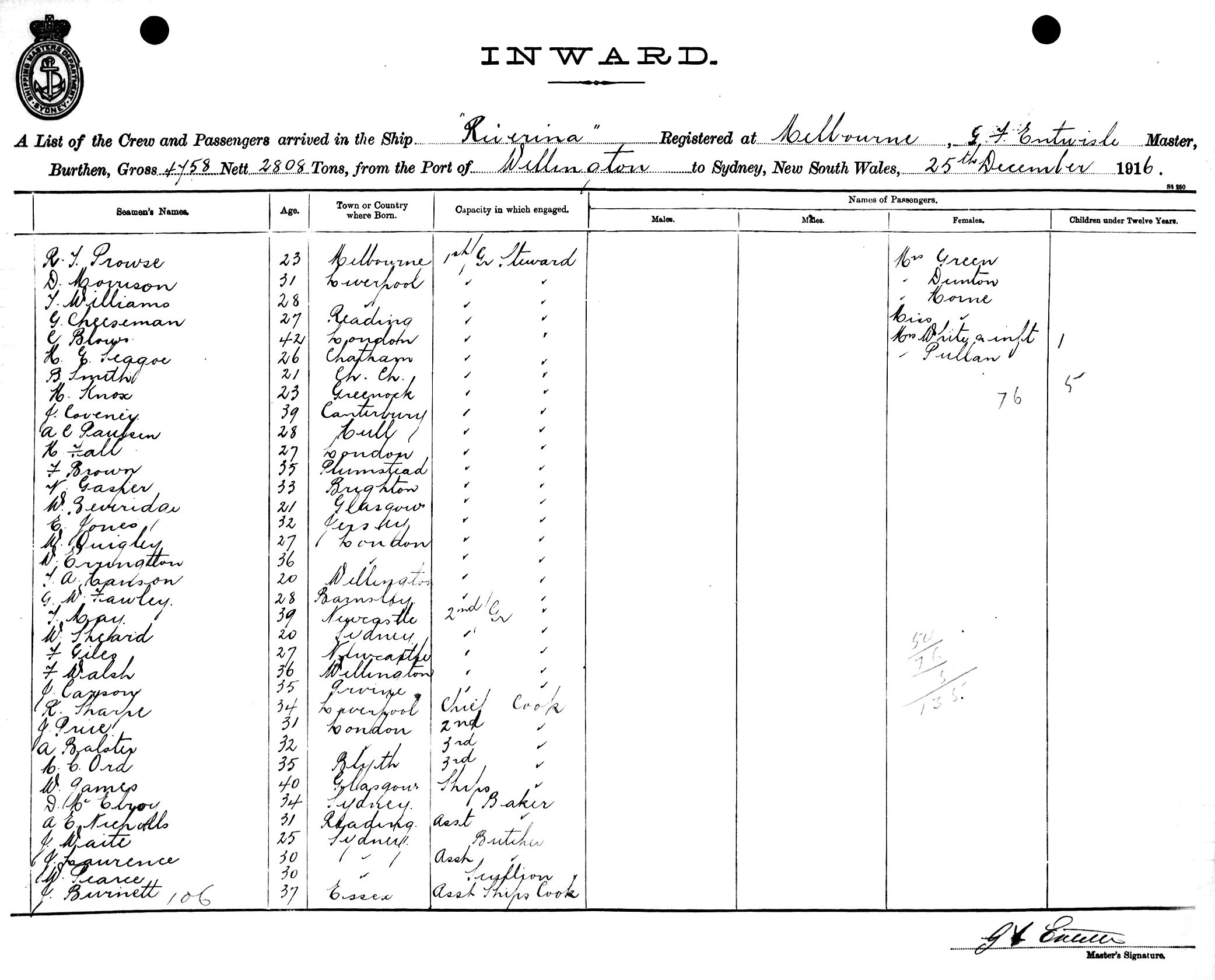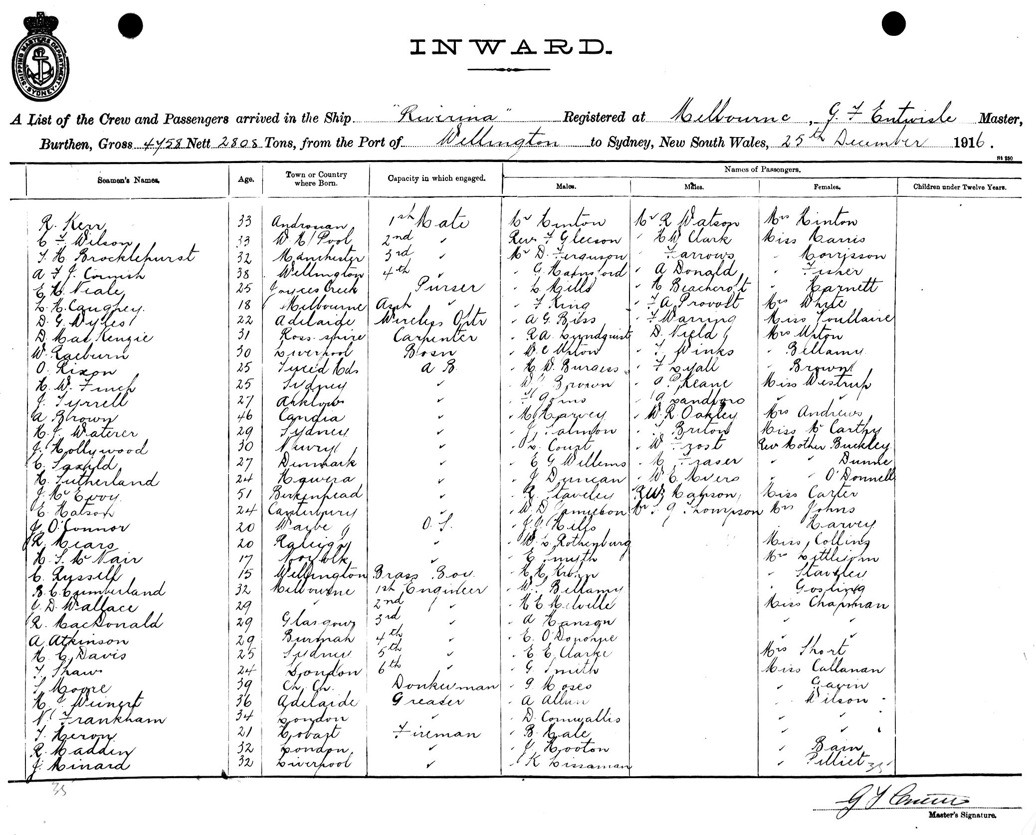 RIVERINAOF MELBOURNE, G. F. ENTWISLE, MASTER, BURTHEN 4758/2808 TONS FROM THE PORT OF WELLINGTON TO SYDNEY, NEW SOUTH WALES, 25TH DECEMBER 1916 |