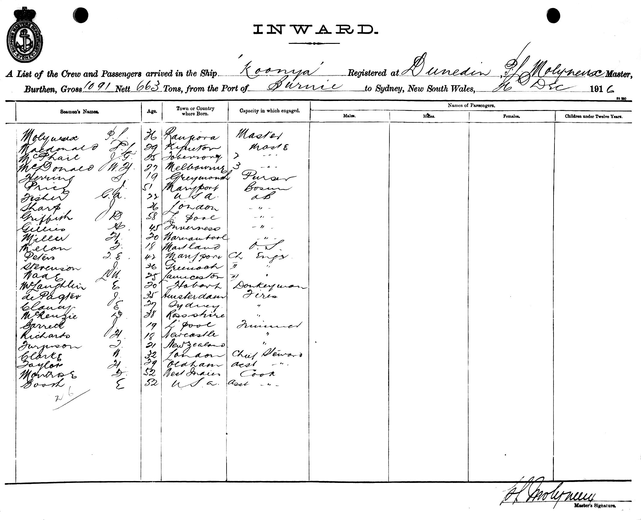 KOONYAOF DUNEDIN, P. L. MOLYNEUX, MASTER, BURTHEN 1091/663 TONS FROM THE PORT OF BURNIE TO SYDNEY, NEW SOUTH WALES, 26TH DECEMBER 1916 |