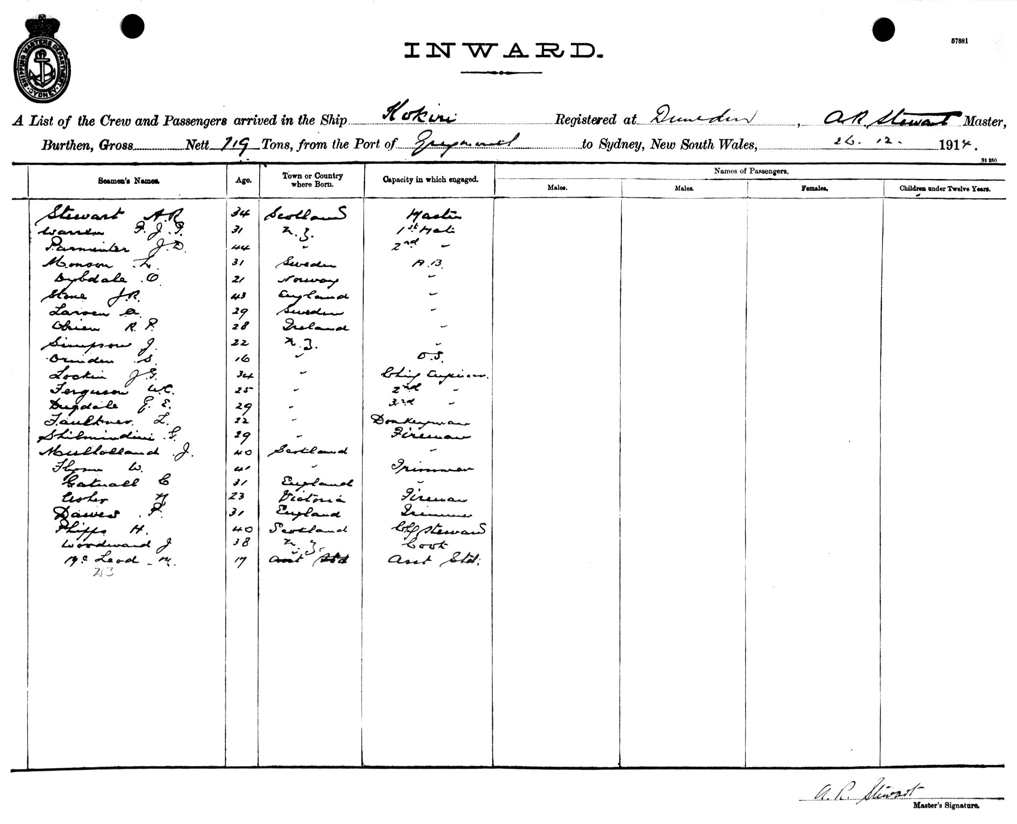 KOKIRIOF DUNEDIN, A. R. STEWART, MASTER, BURTHEN 719 TONS FROM THE PORT OF GREYMOUTH TO SYDNEY, NEW SOUTH WALES, 26TH DECEMBER 1916 |