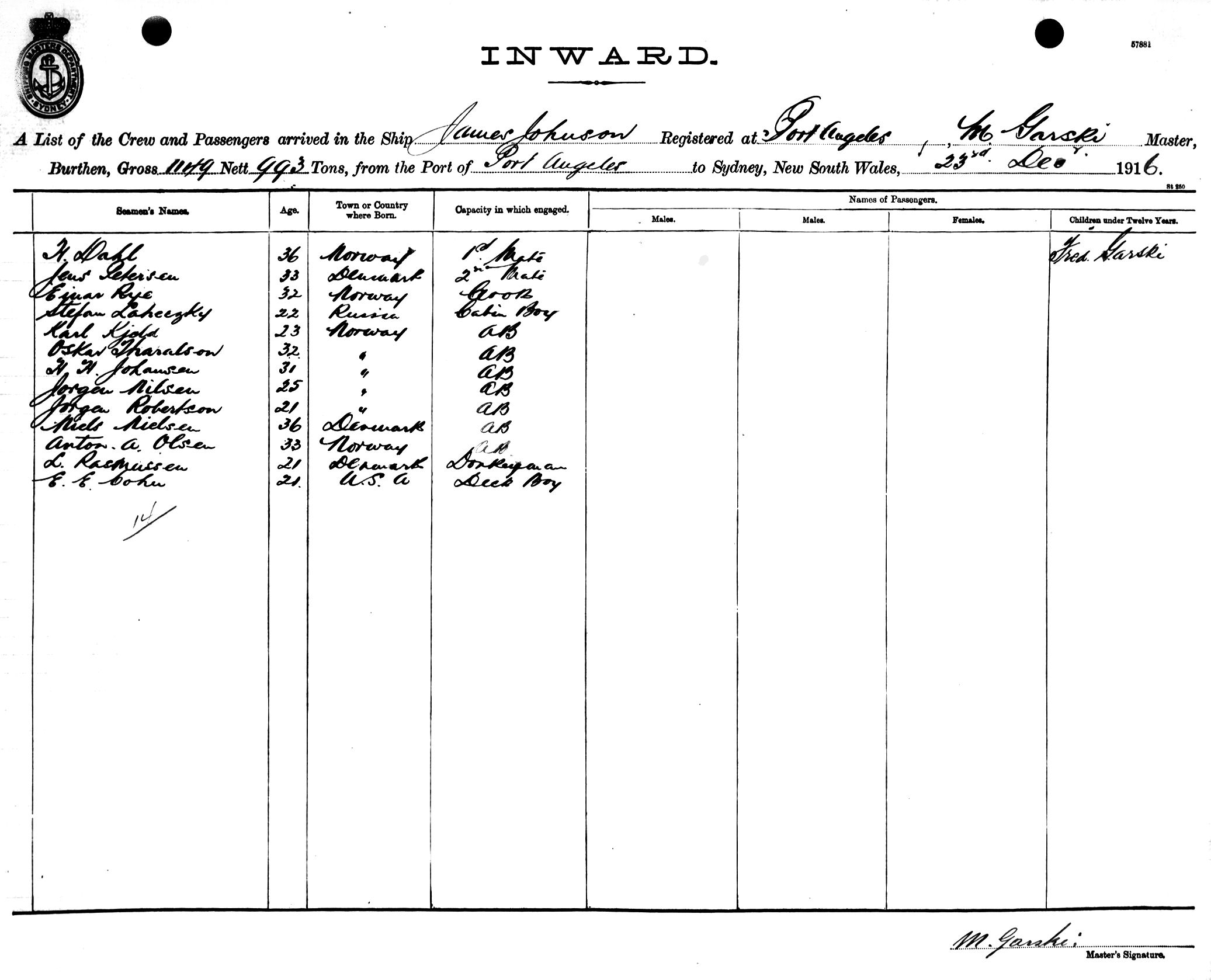 JAMES JOHNSONOF PORT ANGELES, M. GARSKI, MASTER, BURTHEN 1149/993 TONS FROM THE PORT OF PORT ANGELES, U.S.A. TO SYDNEY, NEW SOUTH WALES, 23RD DECEMBER 1916 |