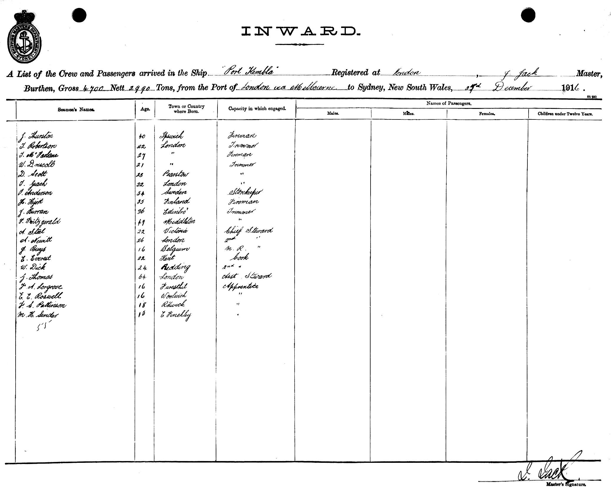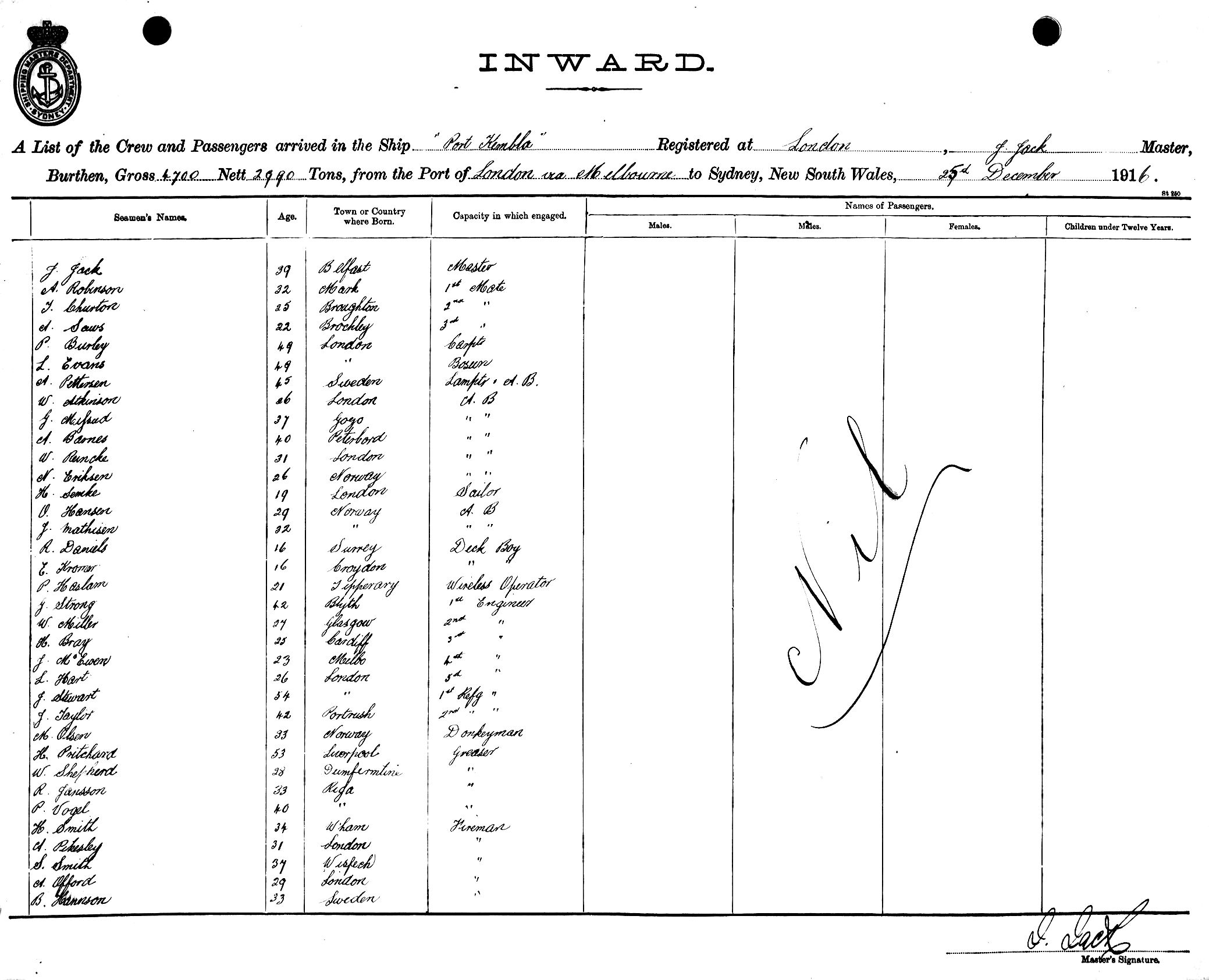 PORT KEMBLAOF LONDON, J. JACK, MASTER, BURTHEN 4700/2990 TONS FROM THE PORT OF LONDON via MELBOURNE TO SYDNEY, NEW SOUTH WALES, 25TH DECEMEBER 1916 |