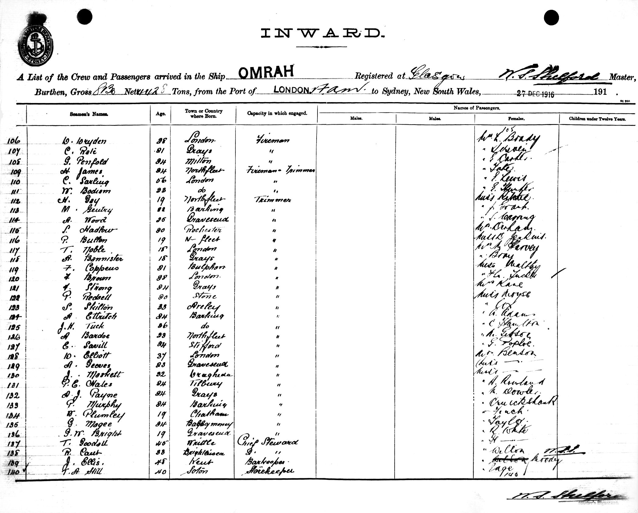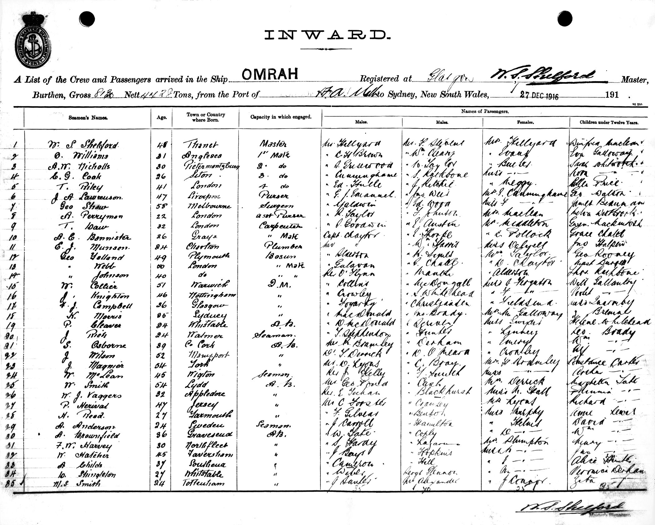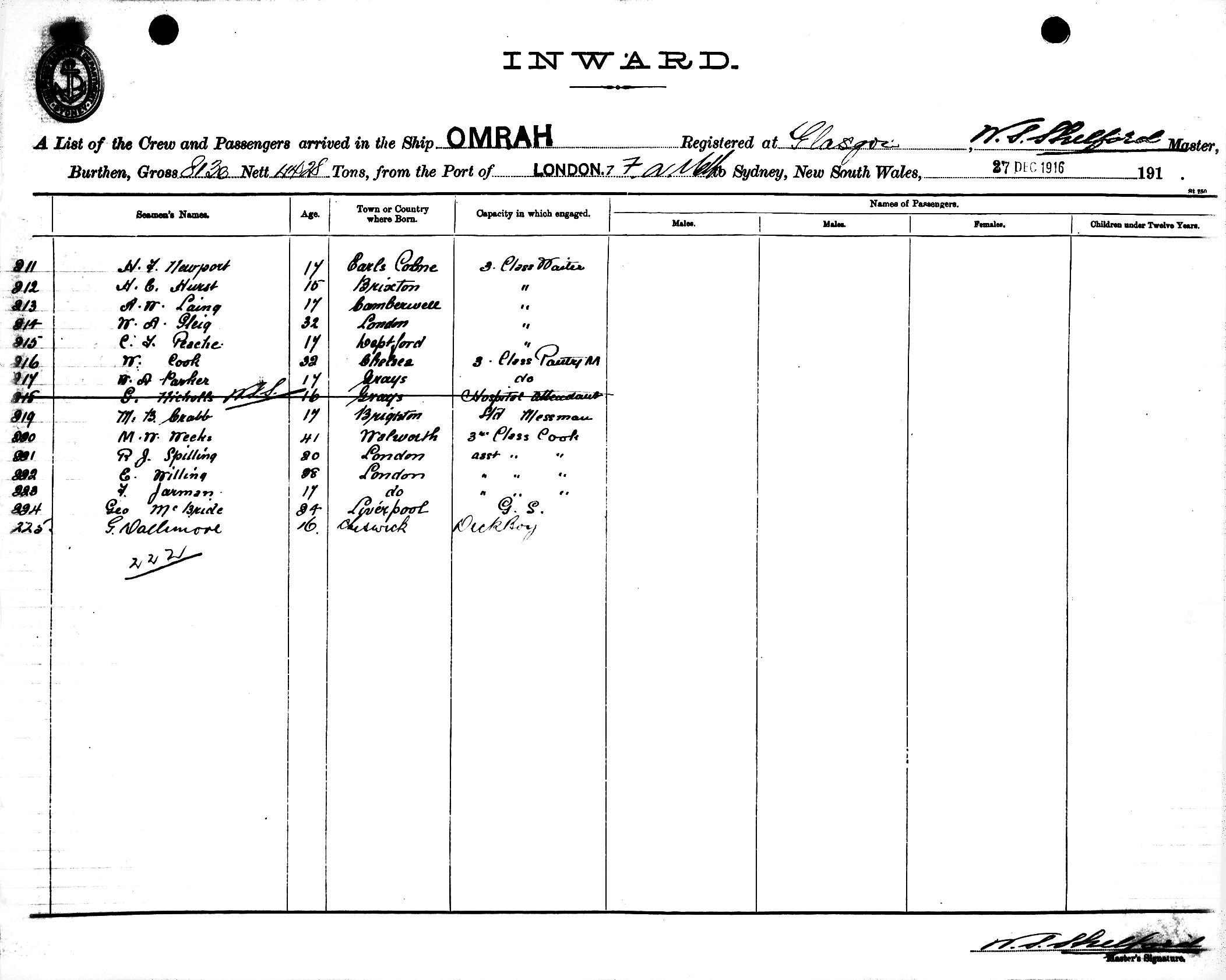 OMRAHOF GLASGOW, W. S. SHELFORD, MASTER, BURTHEN 8130/4428 TONS FROM THE PORT OF LONDON via FREMANTLE, ADELAIDE & MELBOURNE TO SYDNEY, NEW SOUTH WALES, 27TH DECEMBER 1916 |