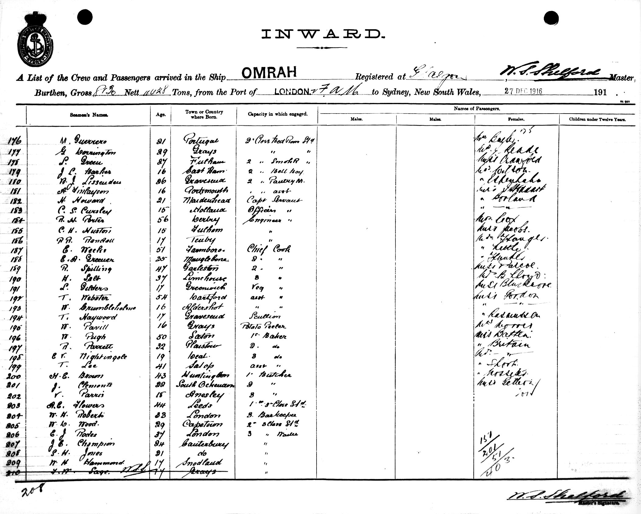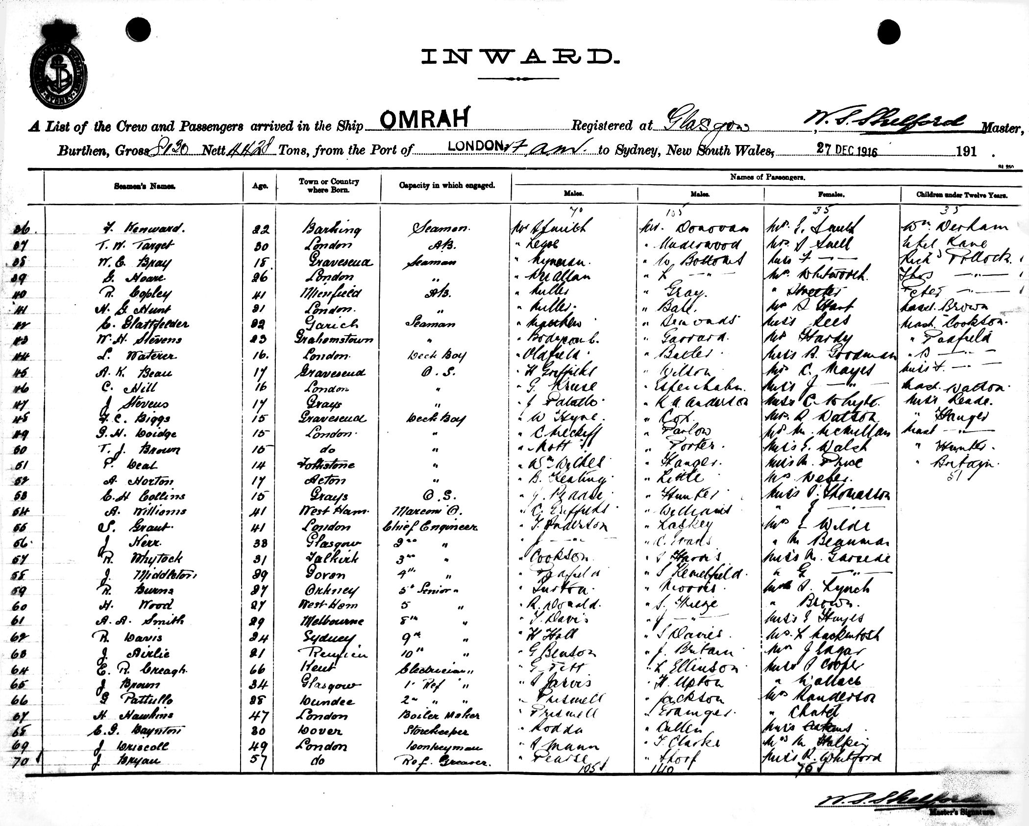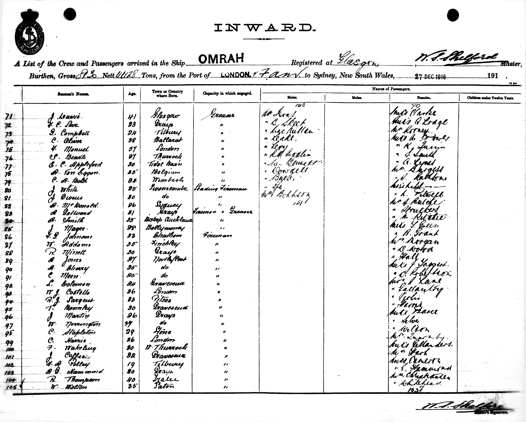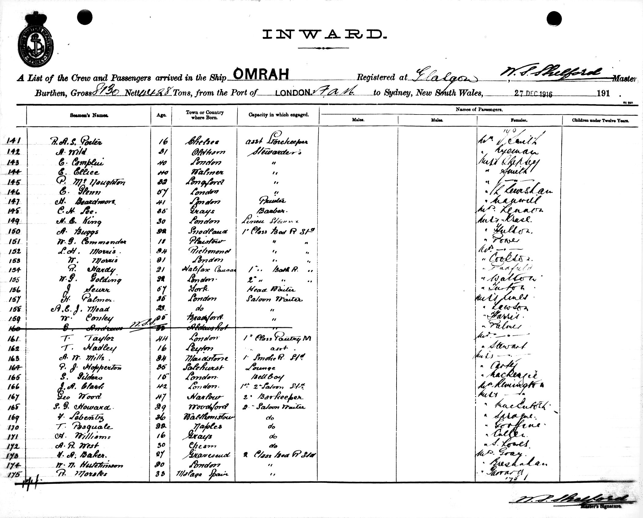 OMRAHOF GLASGOW, W. S. SHELFORD, MASTER, BURTHEN 8130/4428 TONS FROM THE PORT OF LONDON via FREMANTLE, ADELAIDE & MELBOURNE TO SYDNEY, NEW SOUTH WALES, 27TH DECEMBER 1916 |