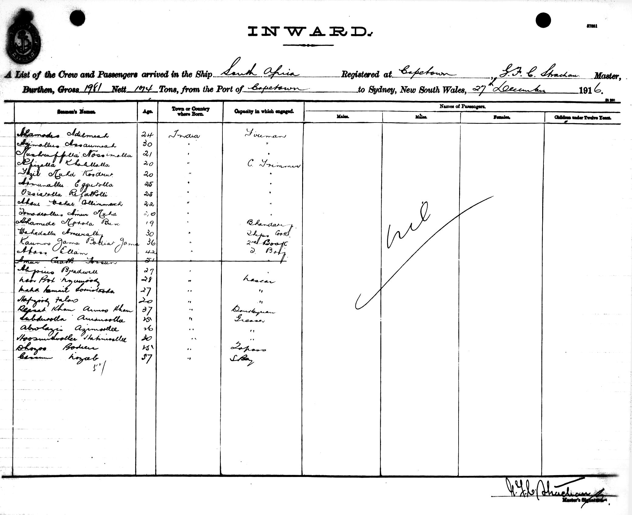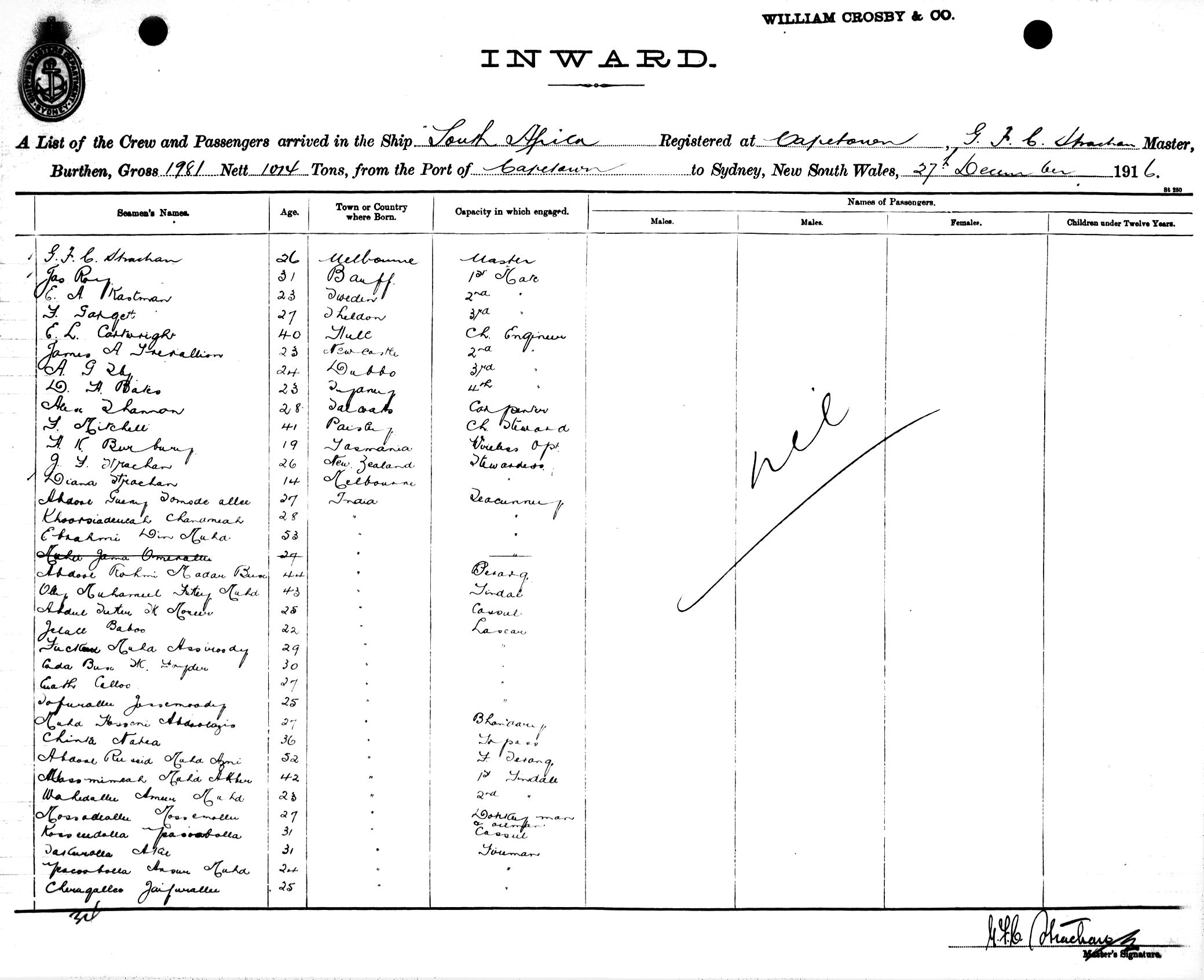 SOUTH AFRICAOF CAPE TOWN, G. F. C. STRACHAN, MASTER, BURTHEN 1981/1014 TONS FROM THE PORT OF CAPE TOWN TO SYDNEY, NEW SOUTH WALES, 27TH DECEMBER 1916 |