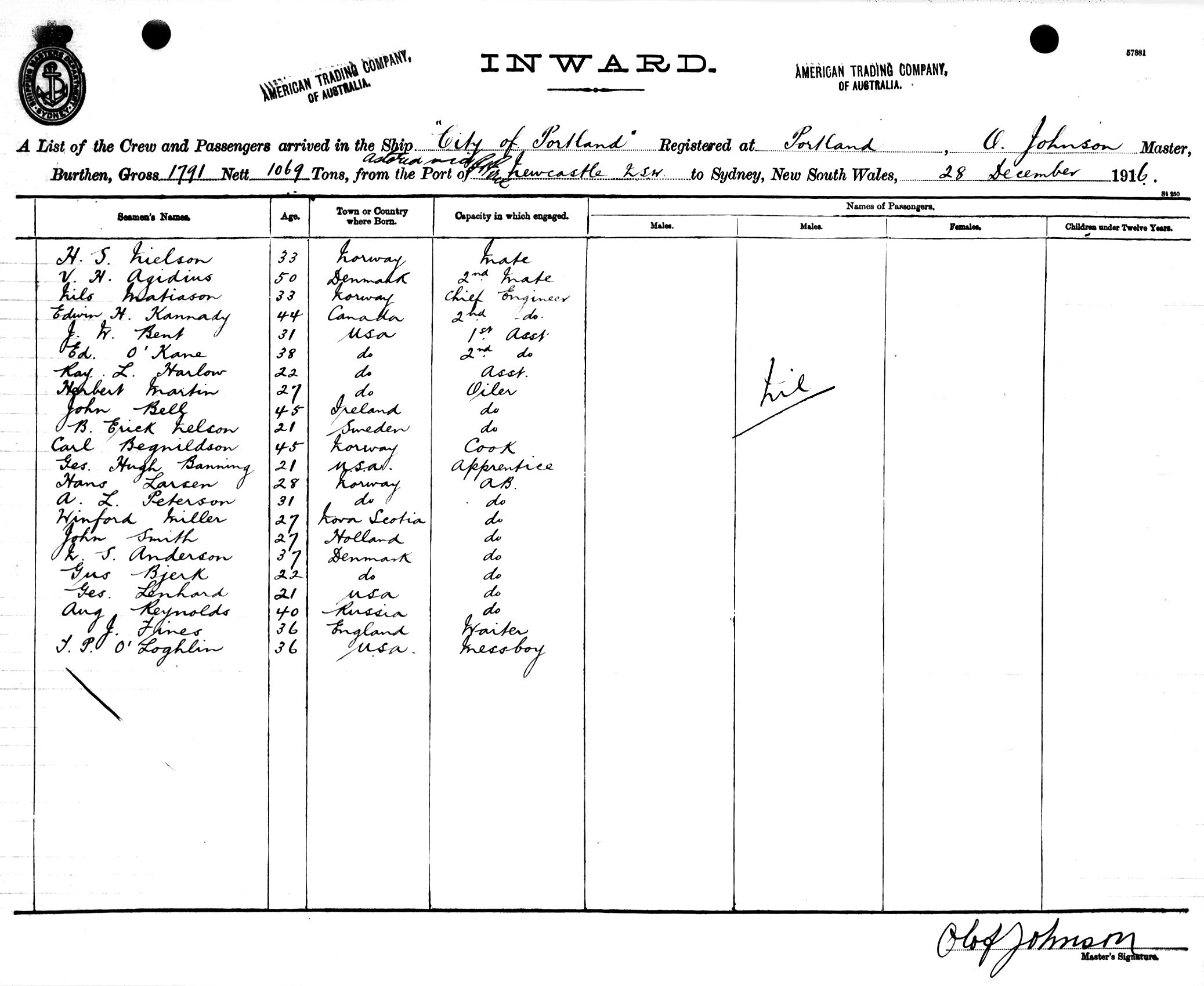 CITY OF PORTLANDOF PORTLAND, O. JOHNSON, MASTER, BURTHEN 1791/1069 TONS FROM THE PORT OF ASTORIA via NEWCASTLE TO SYDNEY, NEW SOUTH WALES, 28TH DECEMBER 1916 |