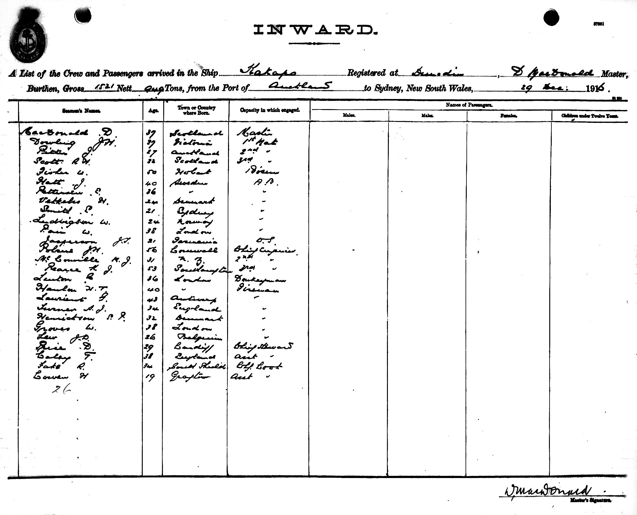 KAKAPOOF DUNEDIN, D. MACDONALD, MASTER, BURTHEN 1521/949 TONS FROM THE PORT OF AUCKLAND TO SYDNEY, NEW SOUTH WALES, 29TH DECEMBER 1916 |