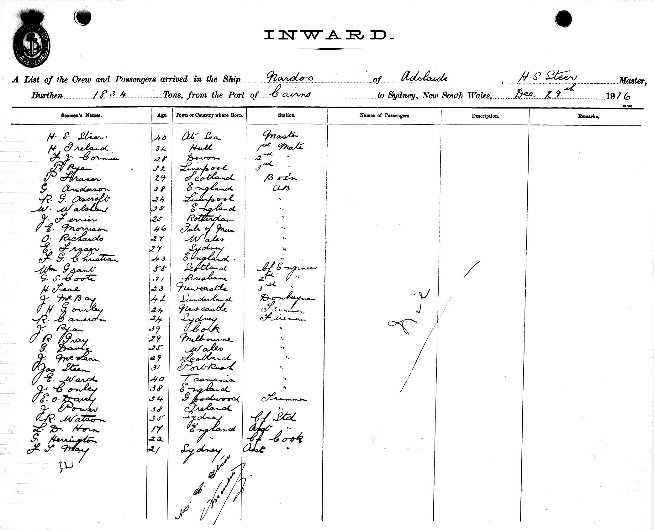 NARDOOOF ADELAIDE, H. S. STEER, MASTER, BURTHEN 1834 TONS FROM THE PORT OF CAIRNS TO SYDNEY, NEW SOUTH WALES, 29TH DECEMBER 1916 |