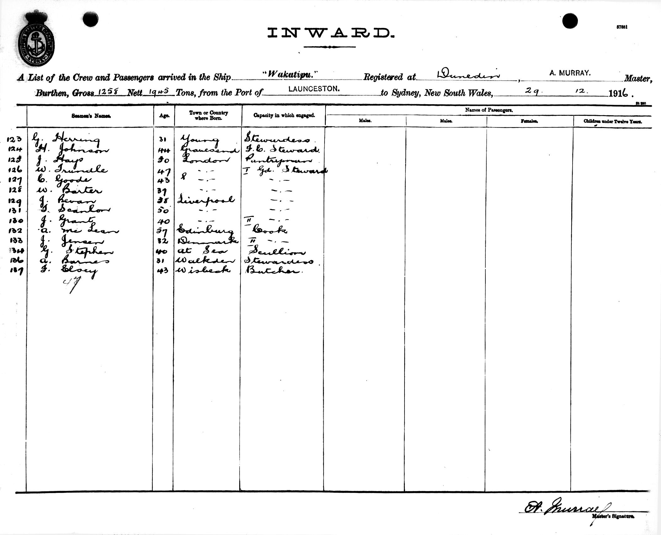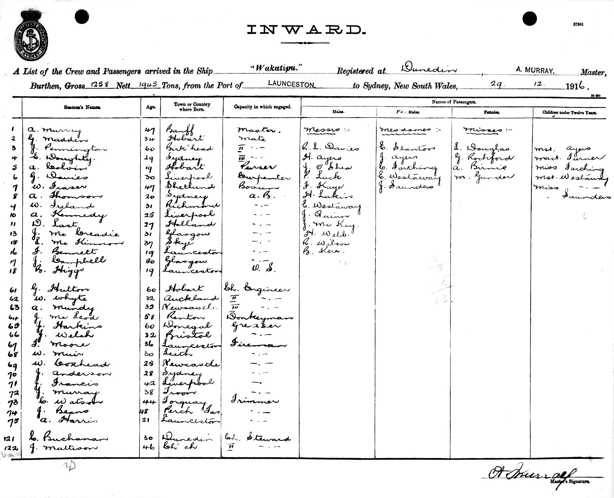 WAKATIPUOF DUNEDIN, A. MURRAY, MASTER, BURTHEN 1945/1268 TONS FROM THE PORT OF LAUNCESTON TO SYDNEY, NEW SOUTH WALES, 29TH DECEMBER 1916 |