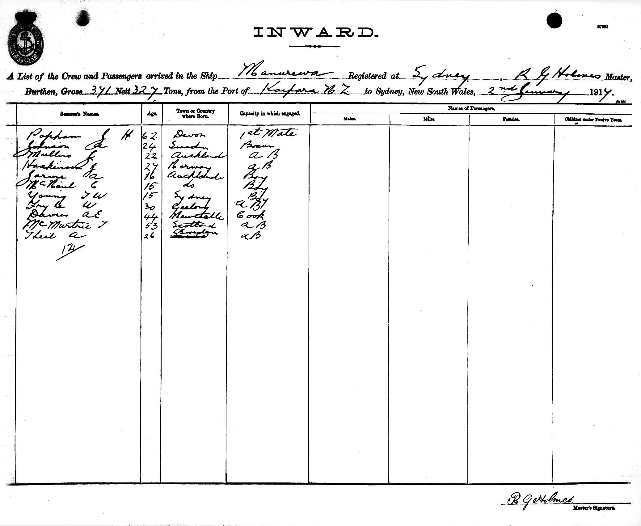 MANUREWAOF SYDNEY, R. G. HOLMES, MASTER, BURTHEN 371/327 TONS FROM THE PORT OF KAIPARA, N.Z. TO SYDNEY, NEW SOUTH WALES, 2ND JANUARY 1917 |