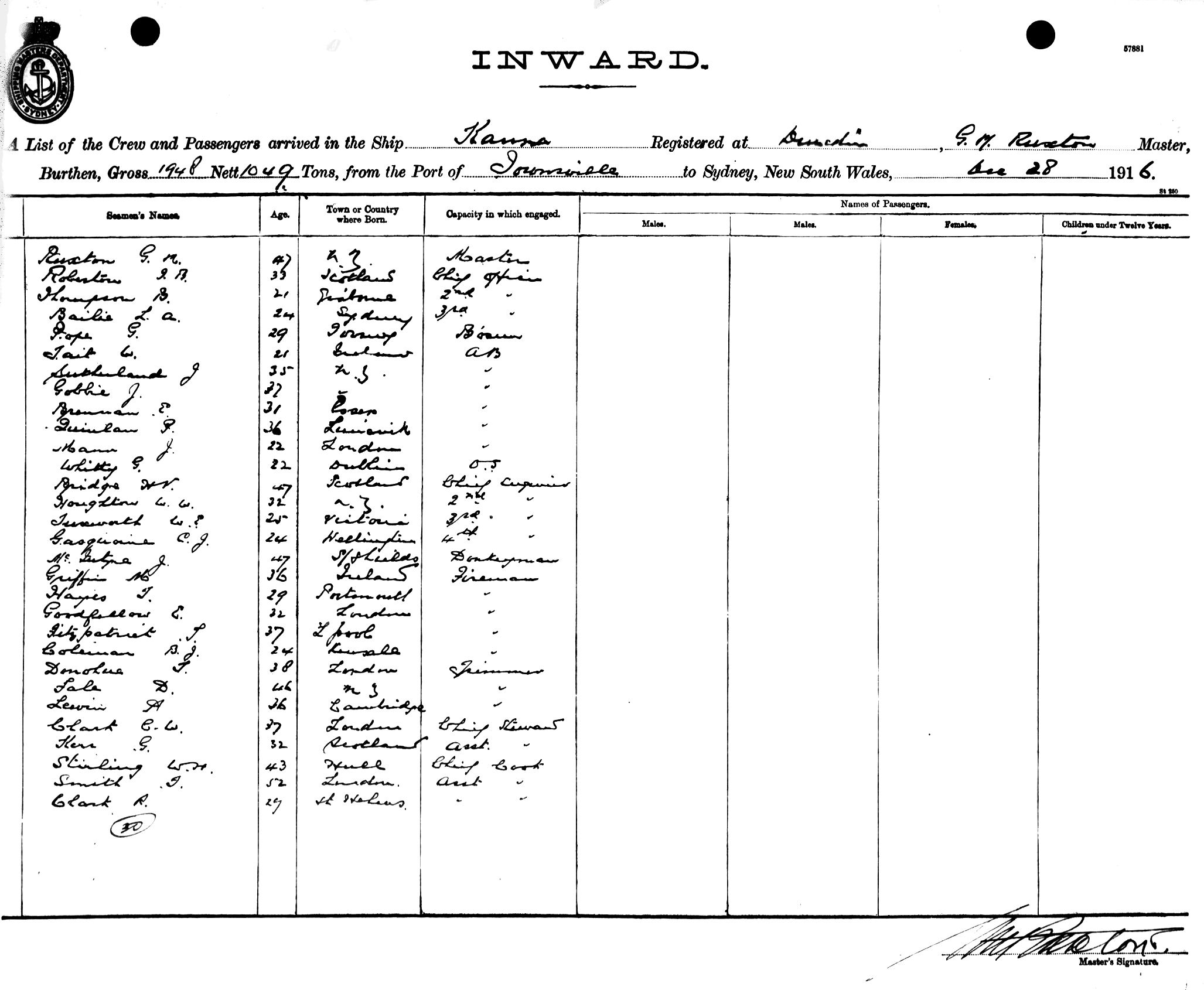 KANNAOF DUNEDIN, G. M. RUXTON, MASTER, BURTHEN 1948/1049 TONS FROM THE PORT OF TOWNSVILLE TO SYDNEY, NEW SOUTH WALES, 28TH DECEMBER 1916 |