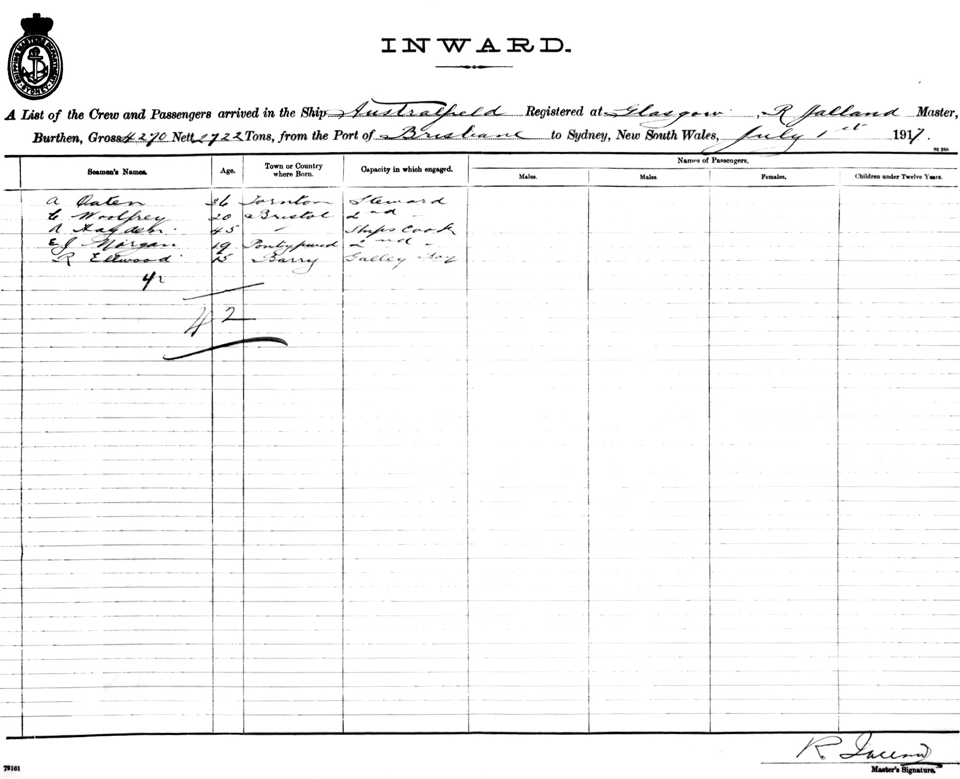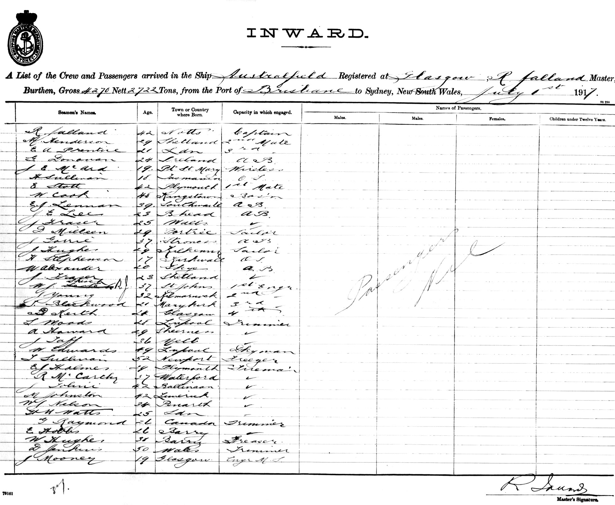 AUSTRALFIELDOF GLASGOW, R. JALLAND, MASTER, BURTHEN 4270/2722 TONS FROM THE PORT OF BRISBANE TO SYDNEY, NEW SOUTH WALES, 1ST JULY 1917 |