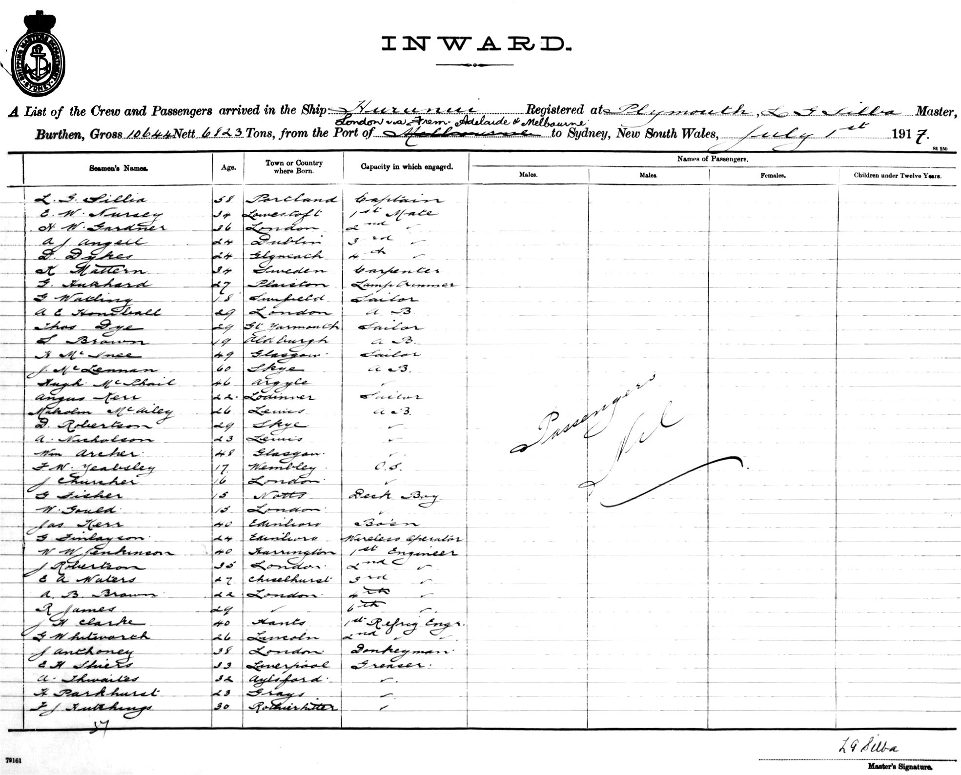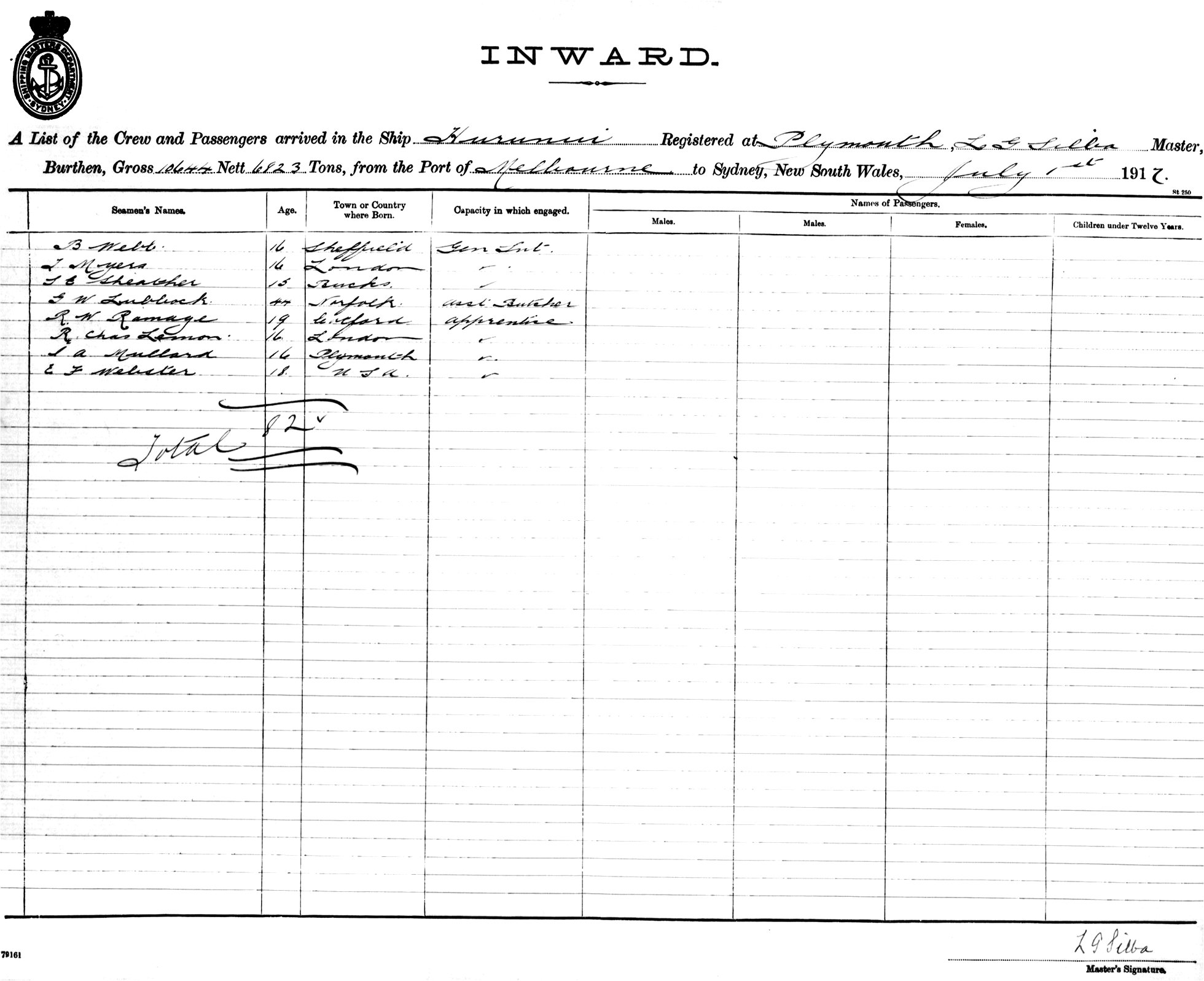 HURUNUIOF PLYMOUTH, L. G. SILBA, MASTER, BURTHEN 10644/6823 TONS FROM THE PORT OF LONDON VIA FREMANTLE, ADELAIDE & MELBOURNE TO SYDNEY, NEW SOUTH WALES, 1ST JULY 1917 |