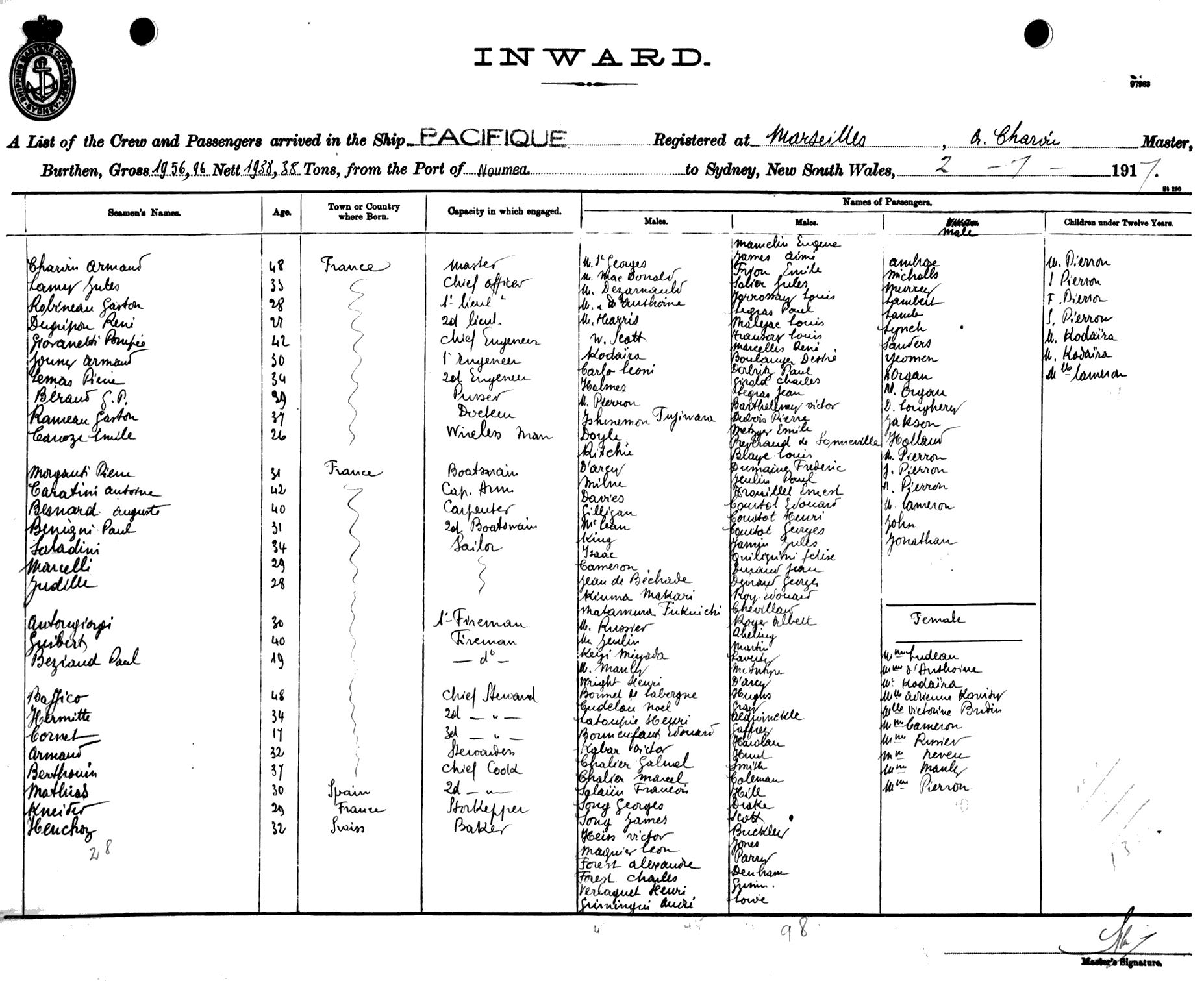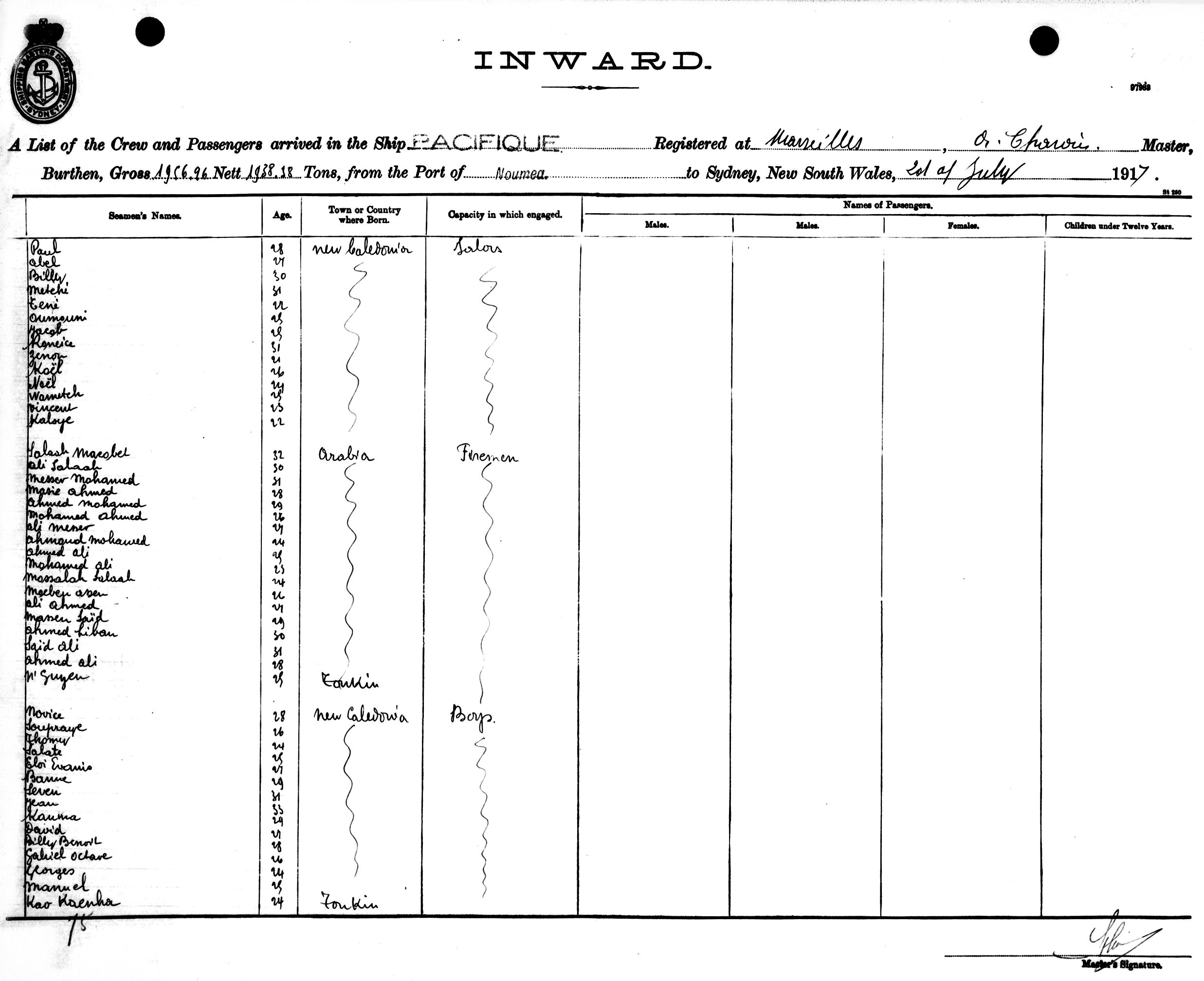 PACIFIQUEOF MARSEILLE, A. CHARVIN, MASTER, BURTHEN 1956/1938 TONS FROM THE PORT OF NOUMEA TO SYDNEY, NEW SOUTH WALES, 2ND JULY 1917 |