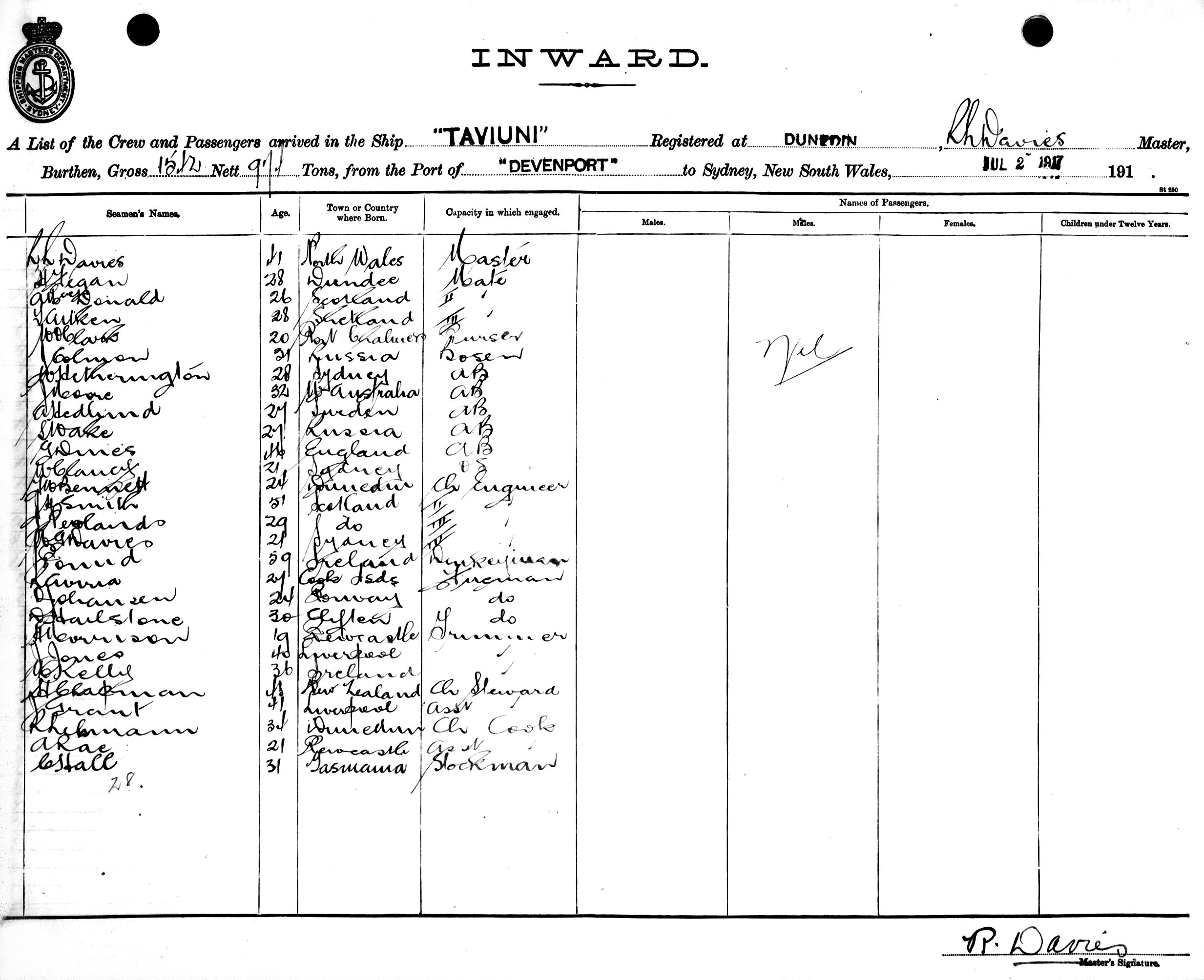 TAVIUNIOF DUNEDIN, R. L. DAVIES, MASTER, BURTHEN 1542/974 TONS FROM THE PORT OF DEVONPORT TO SYDNEY, NEW SOUTH WALES, 2ND JULY 1917 |
