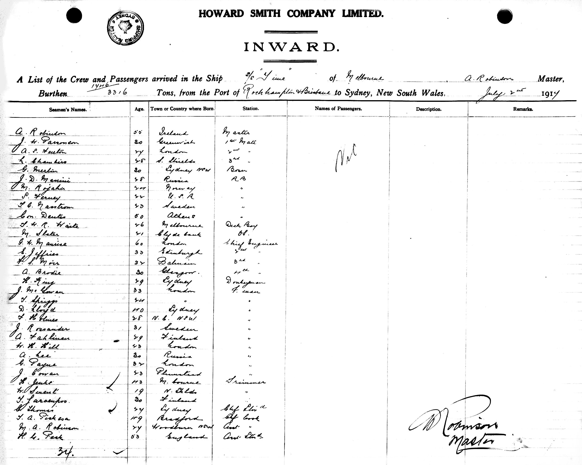 Mariners and ships in Australian Waters | TIMEOF MELBOURNE, A. ROBINSON, MASTER, BURTHEN 3316/1746 TONS FROM THE PORTS OF ROCKHAMPTON & BRISBANE TO SYDNEY, NEW SOUTH WALES, 2ND JULY 1917 |