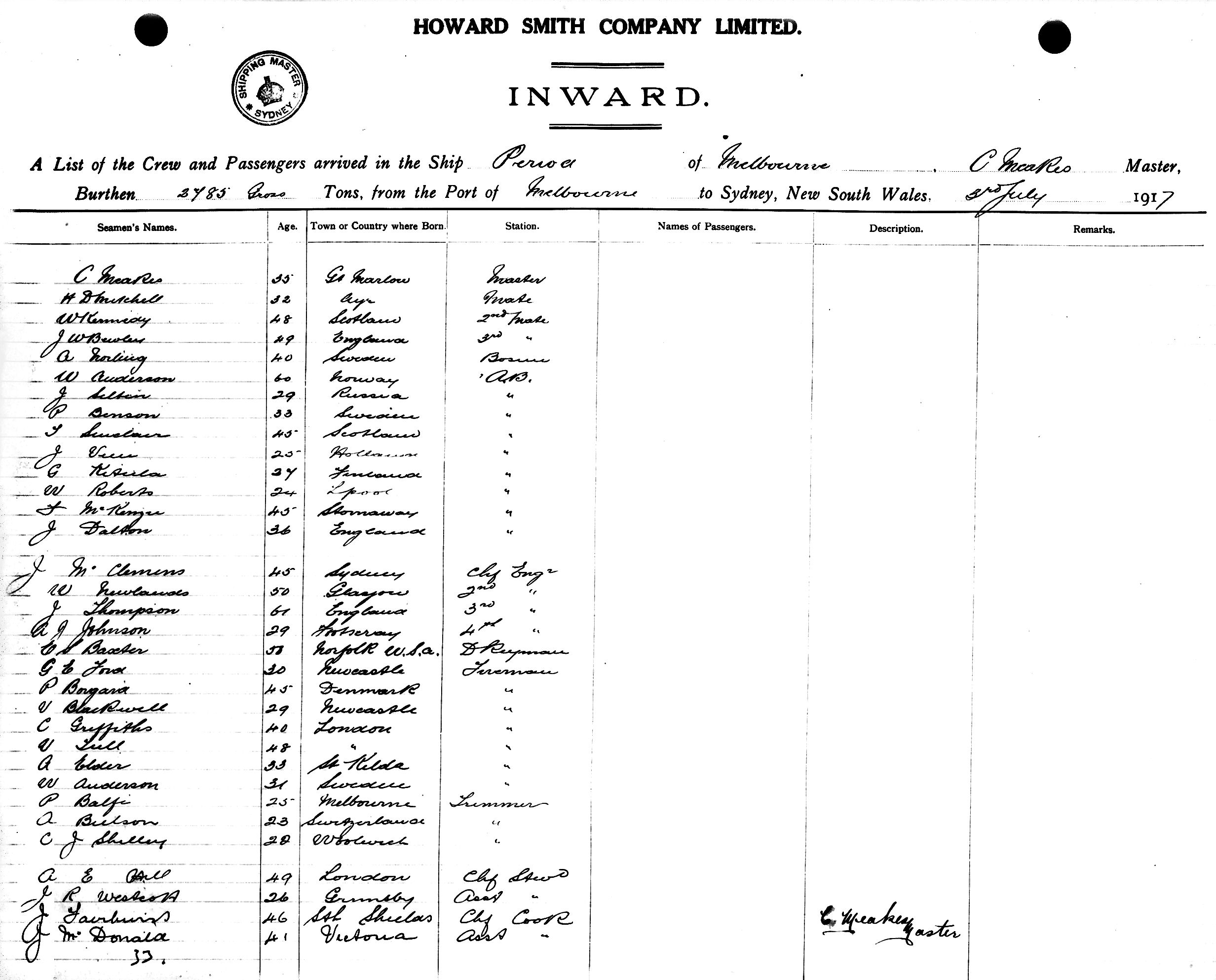 PERIODOF MELBOURNE, C. MEAKES, MASTER, BURTHEN 2785 TONS FROM THE PORT OF MELBOURNE TO SYDNEY, NEW SOUTH WALES, 3RD JULY 1917 |