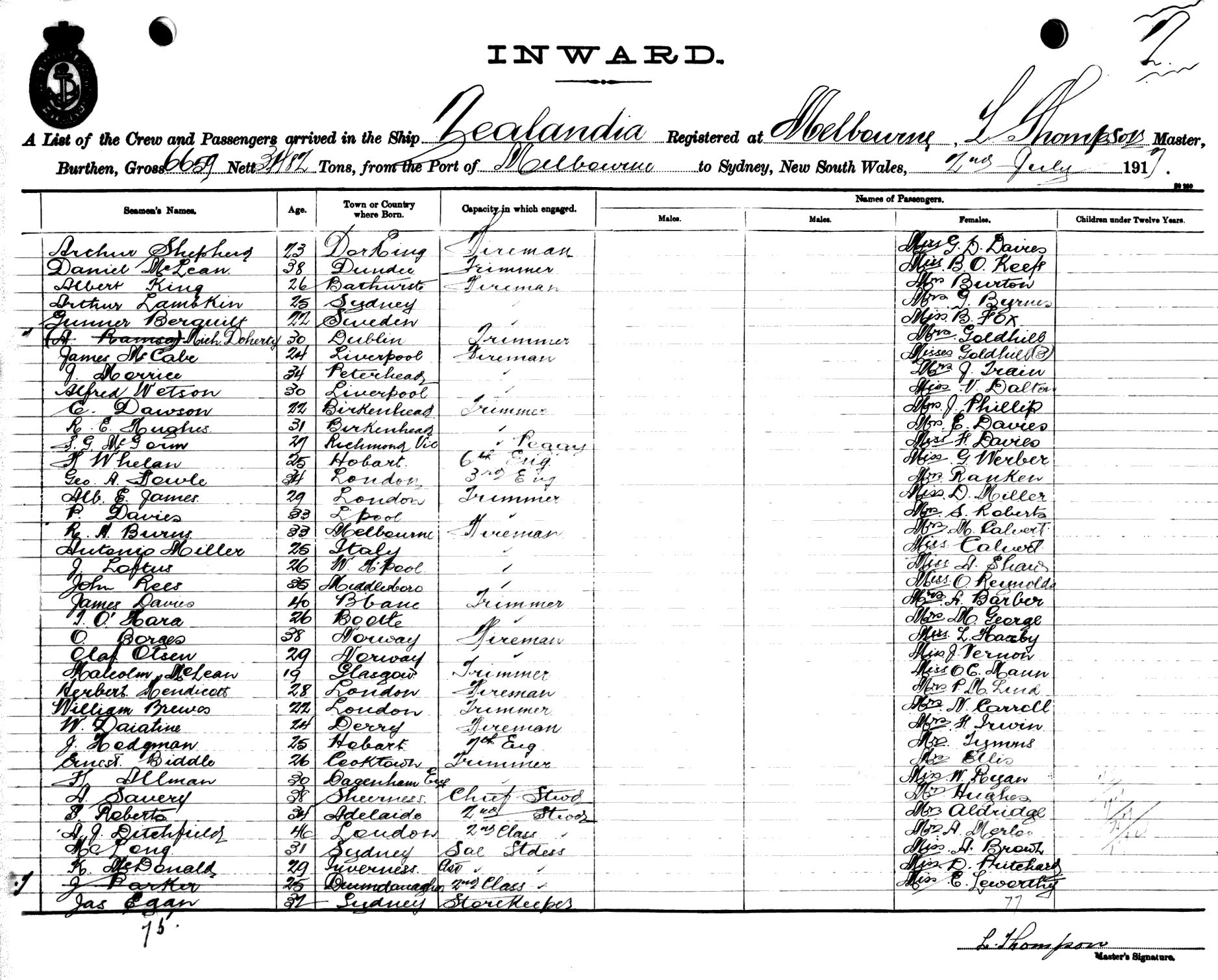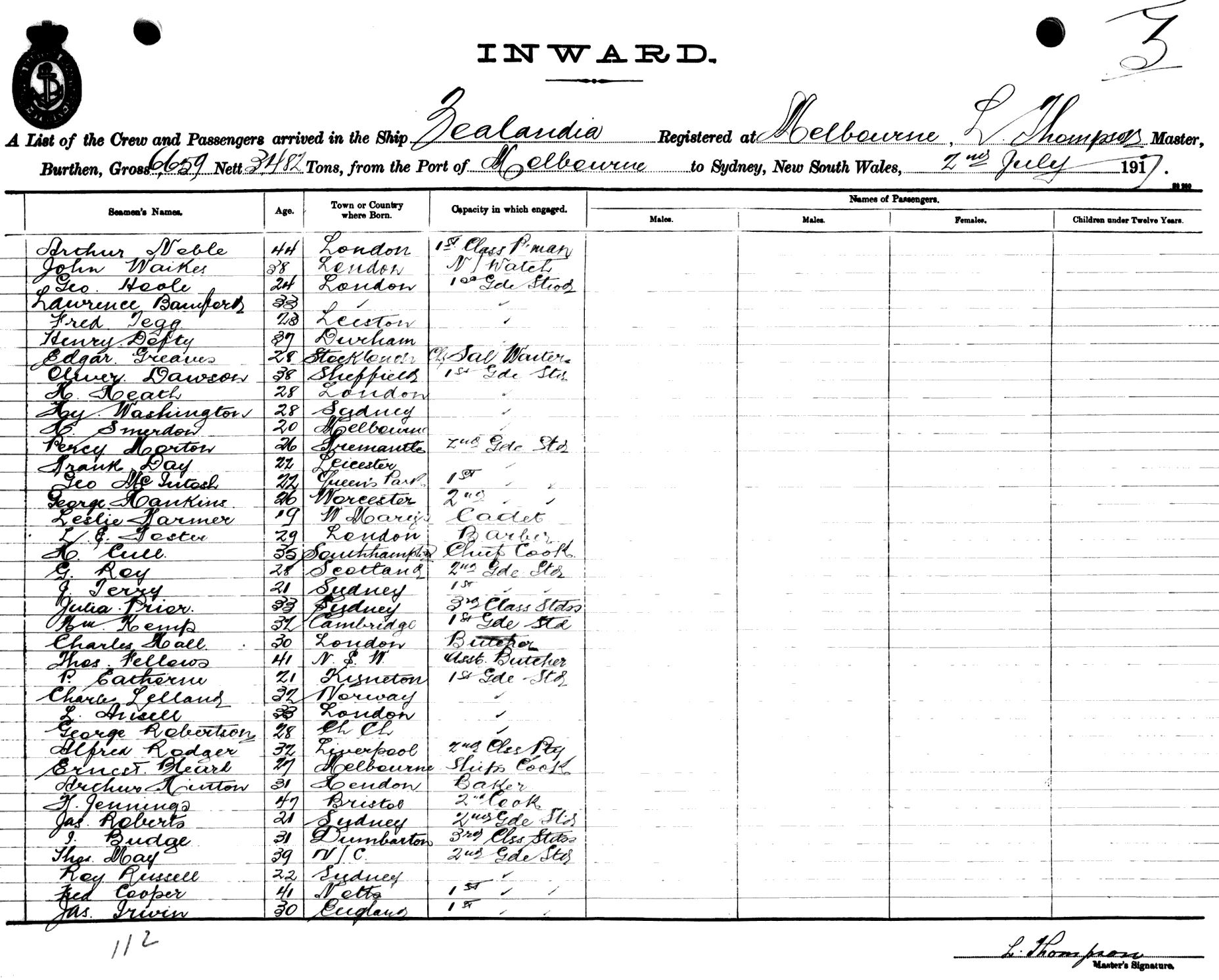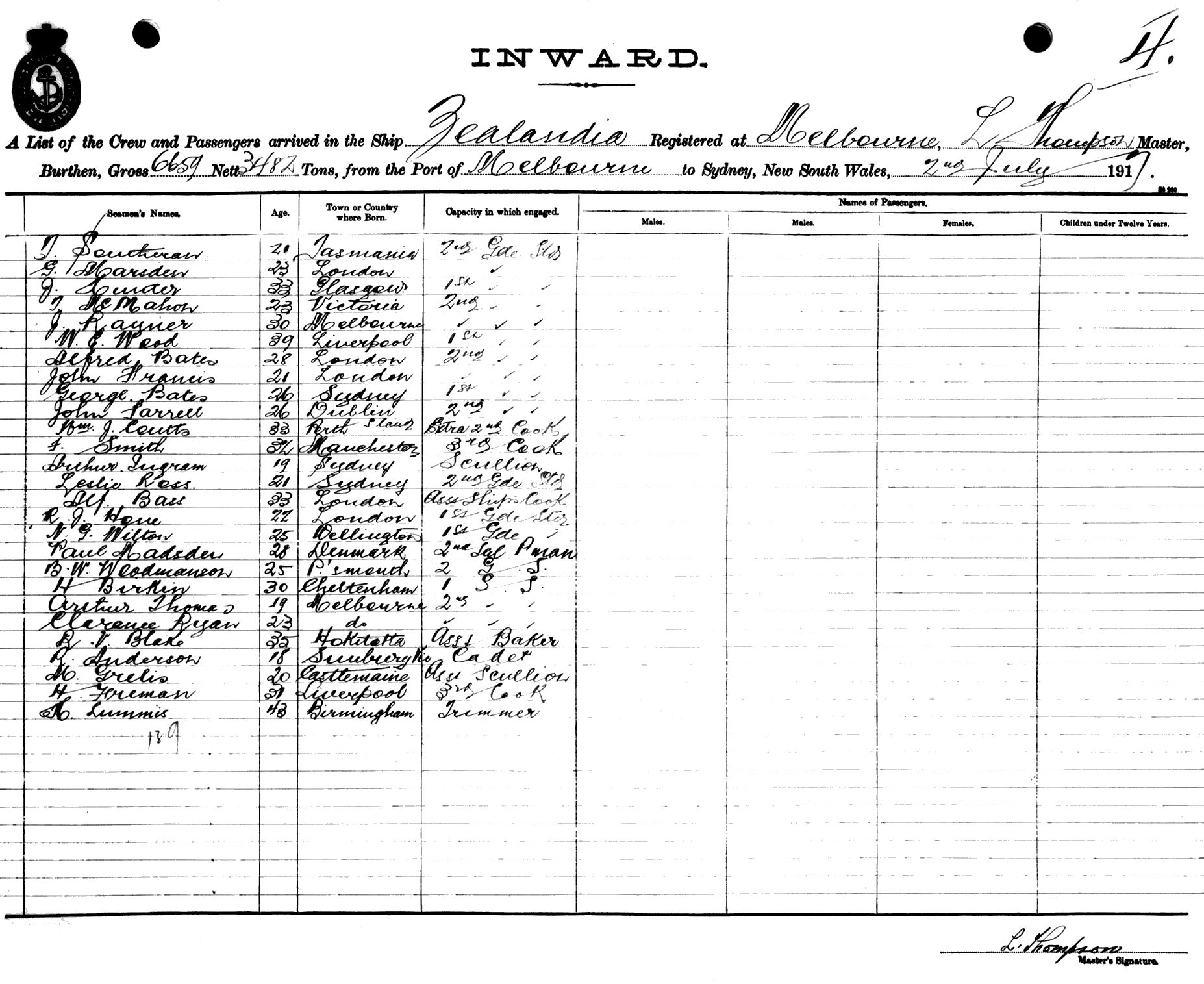 Mariners and ships in Australian Waters | ZEALANDIAOF MELBOURNE, L. THOMPSON, MASTER, BURTHEN 6659/3482 TONS FROM THE PORT OF MELBOURNE TO SYDNEY, NEW SOUTH WALES, 2ND JULY 1917 |