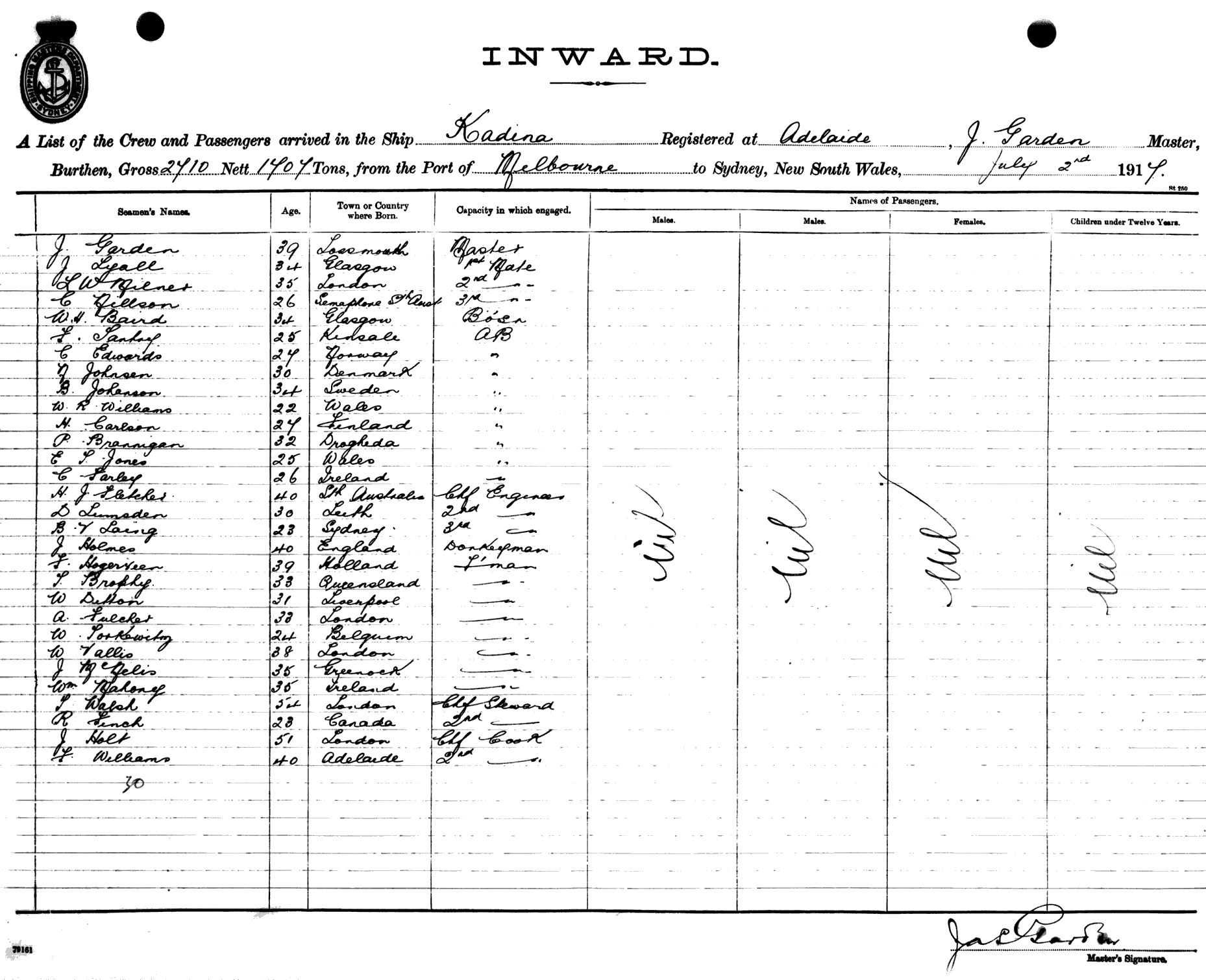KADINAOF ADELAIDE, J. GARDEN, MASTER, BURTHEN 2710/1707 TONS FROM THE PORT OF MELBOURNE TO SYDNEY, NEW SOUTH WALES, 2ND JULY 1917 |