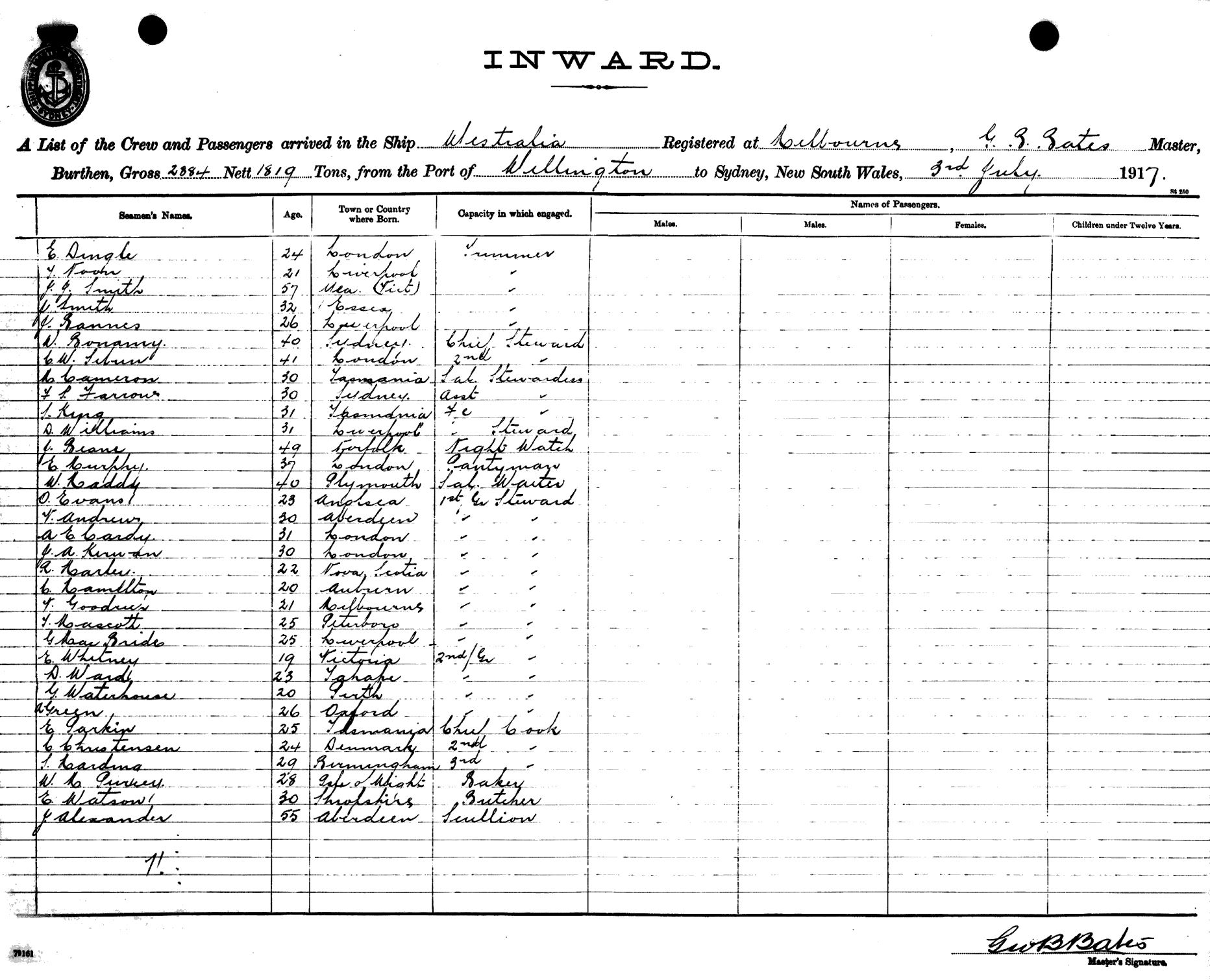 WESTRALIAOF MELBOURNE, G. B. BATES, MASTER, BURTHEN 2884/1819 TONS FROM THE PORT OF WELLINGTON TO SYDNEY, NEW SOUTH WALES, 3RD JULY 1917 |