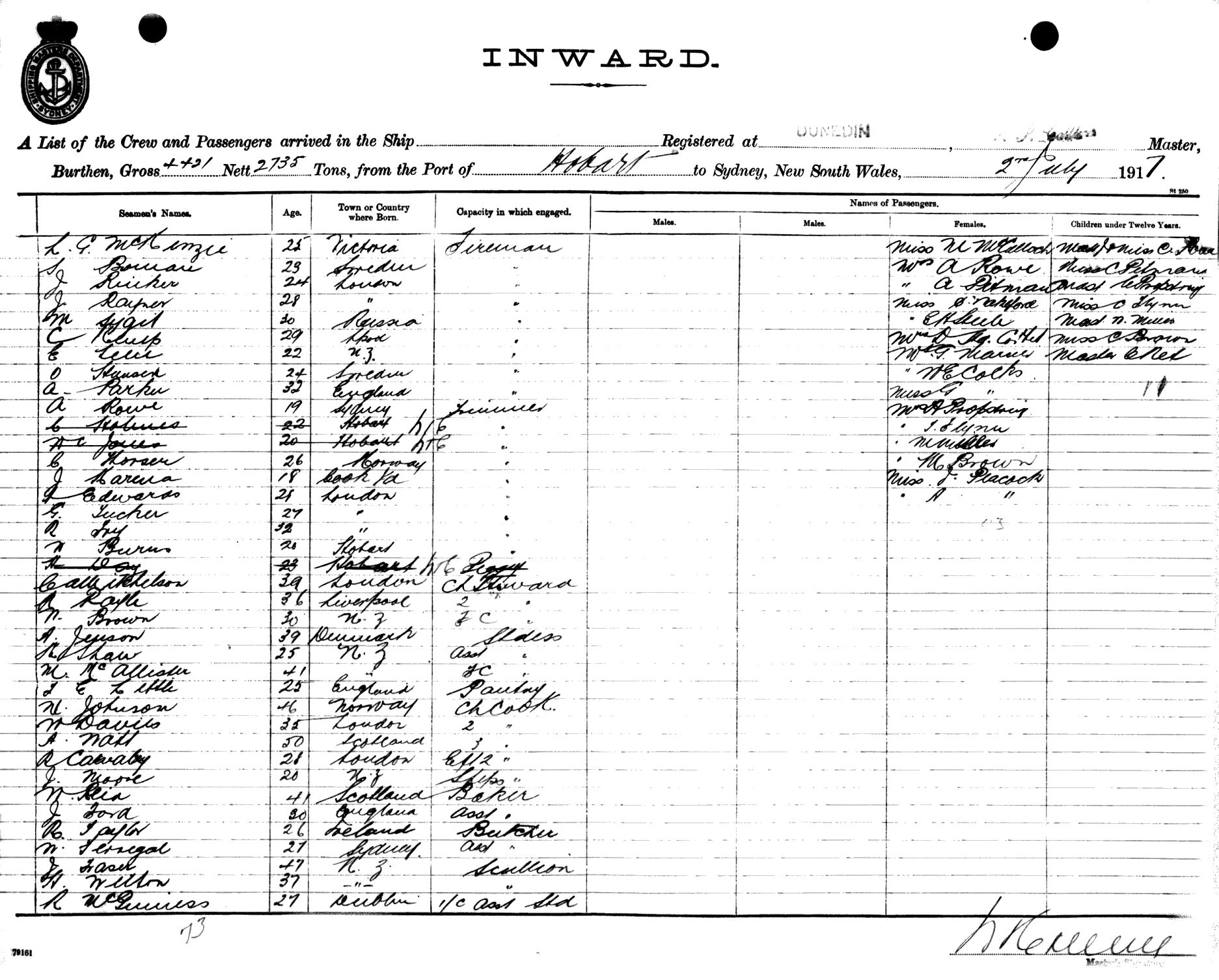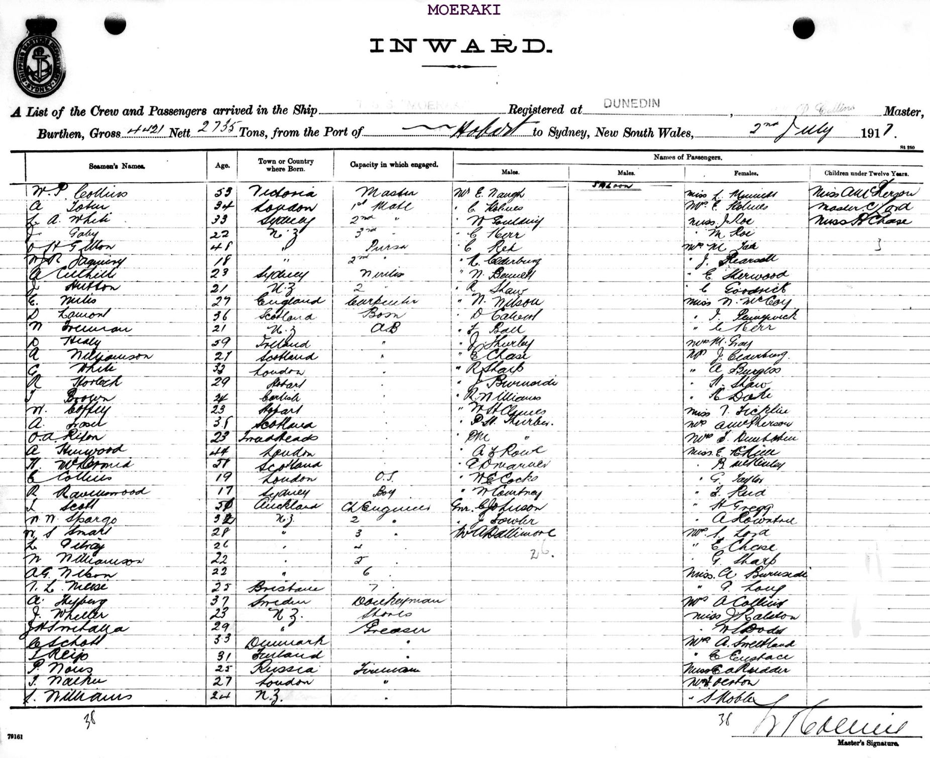 MOERAKIOF DUNEDIN, W. P. COLLINS, MASTER, BURTHEN 4421/2735 TONS FROM THE PORT OF HOBART TO SYDNEY, NEW SOUTH WALES, 2ND JULY 1917 |